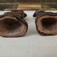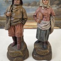 Souvenir de bord de mer provenant de Dieppe. Couple de pêcheur en très bel état, représentation d’un homme et une femme, en habits de travail, portant un filet et un panier. Très jolies terre cuite signée Alphonse Hanne. Hauteur 13 cm