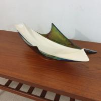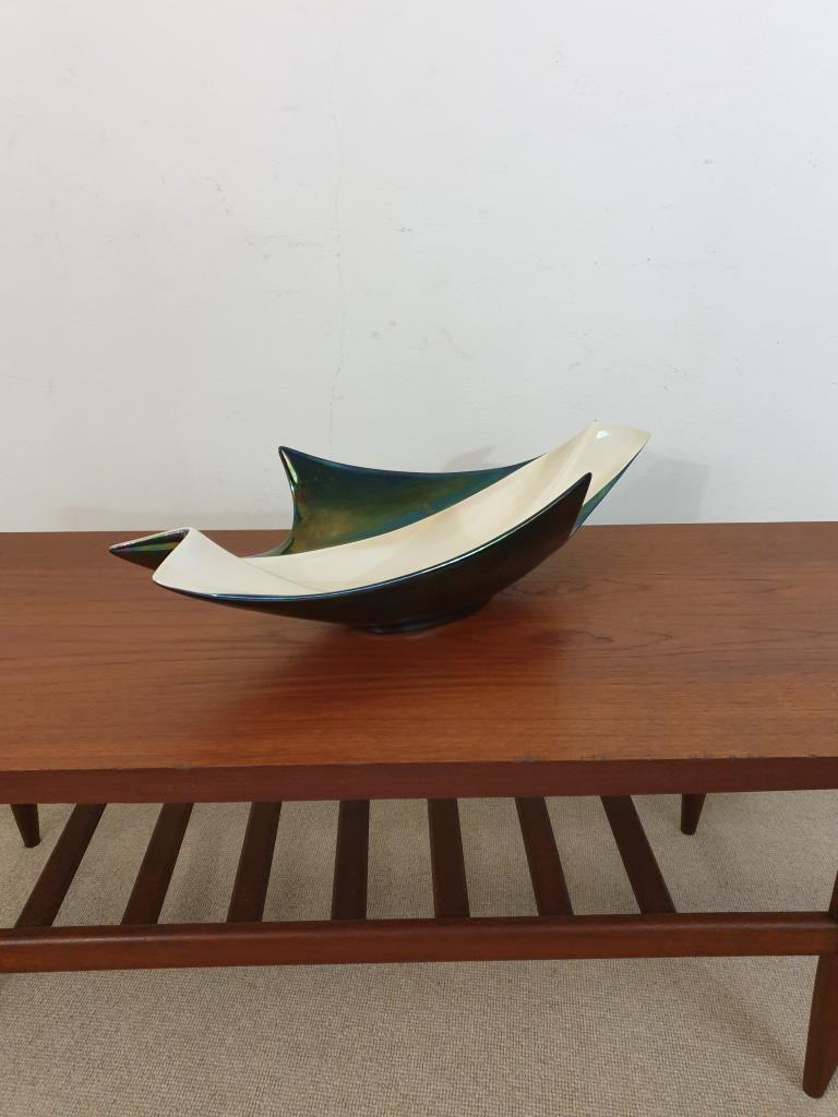 Coupe à fruits des années 50/60 de la manufacture d'Art VERCERAM. Céramique émaillée nacrée et bleue irisée. Superbe design 50's typique du style Verceram de l' époque - Longueur 58 cm - Largeur 27 cm - Hauteur 14.50 cm. Coupe en parfait état.