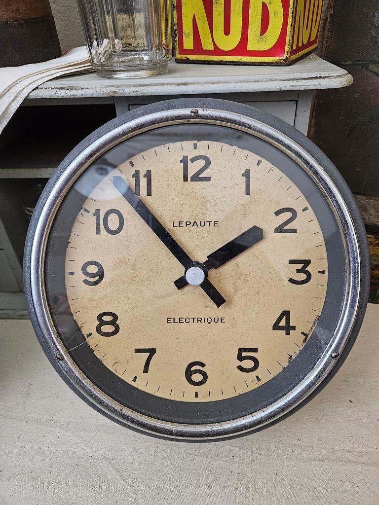 Horloge industrielle électrique Henry Lepaute des années 50/60. Pendule Maitre / Esclave, en bel état non testé. A noter le cadran en verre est fêlé mais tient encore solidement. Fonctionnement non testé. Diamètre 25 cm Epaisseur 9 cm.