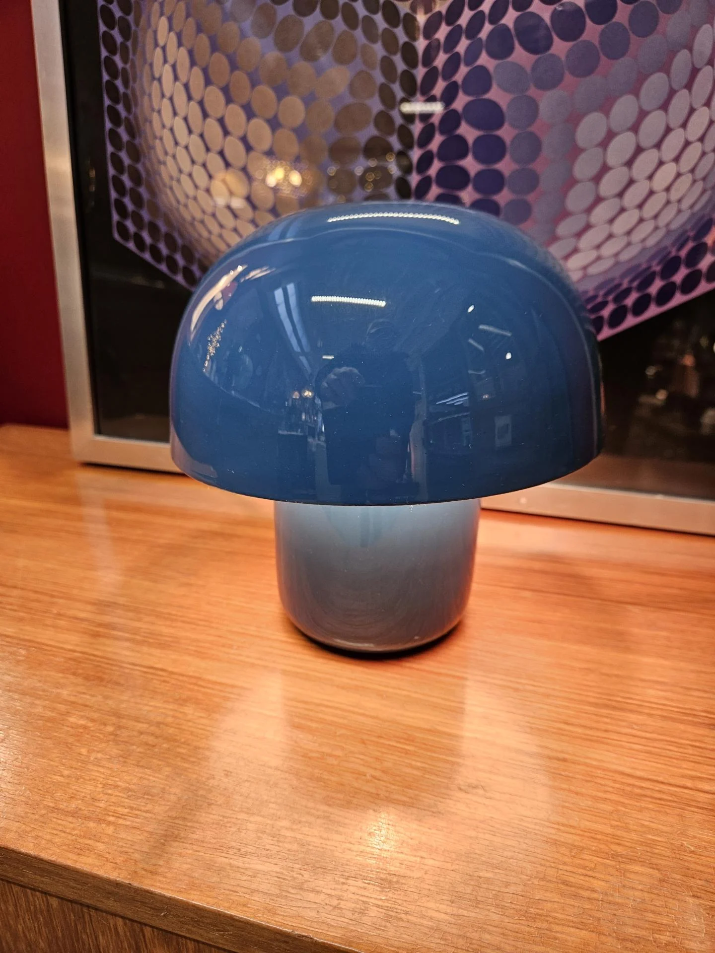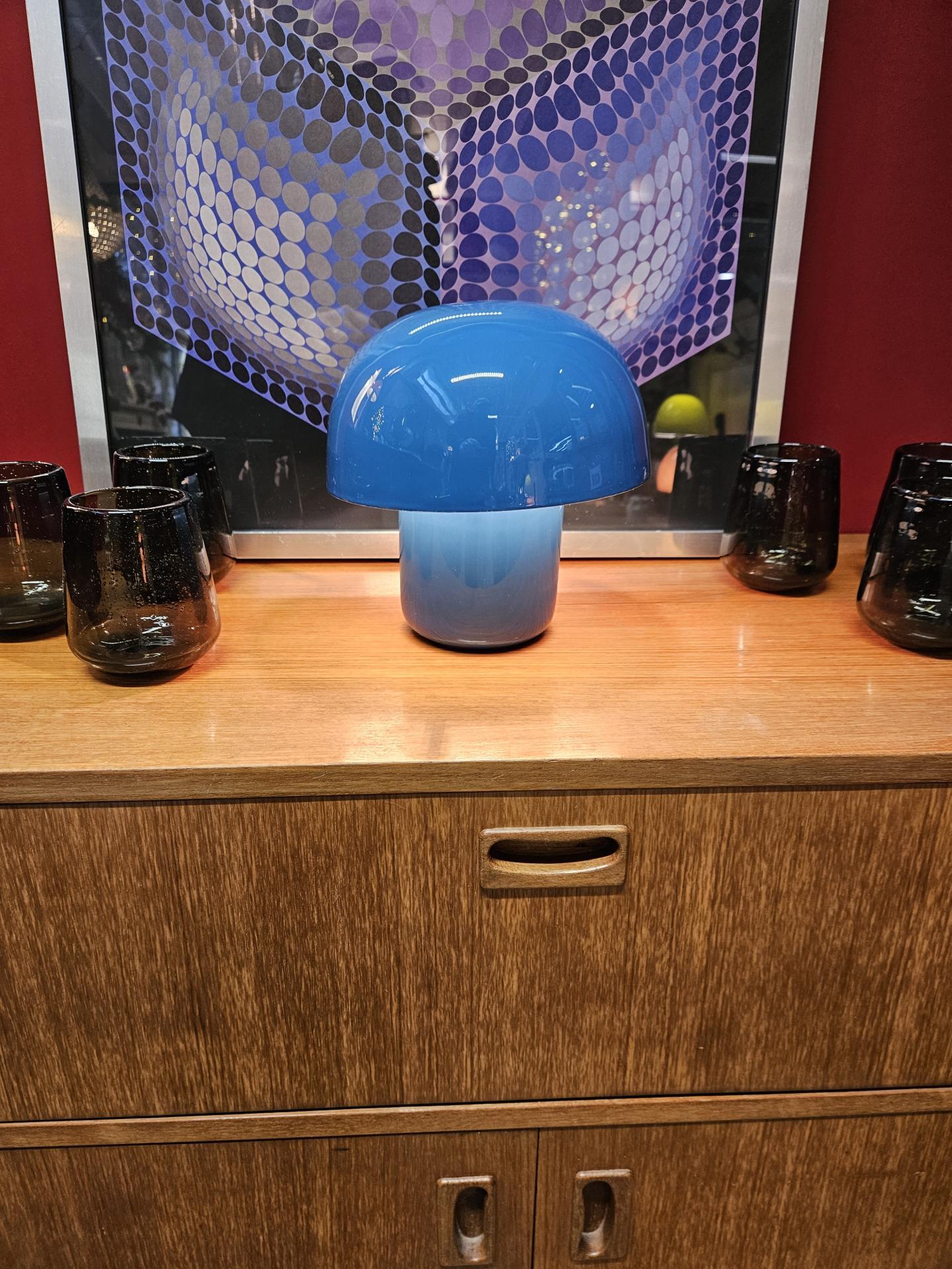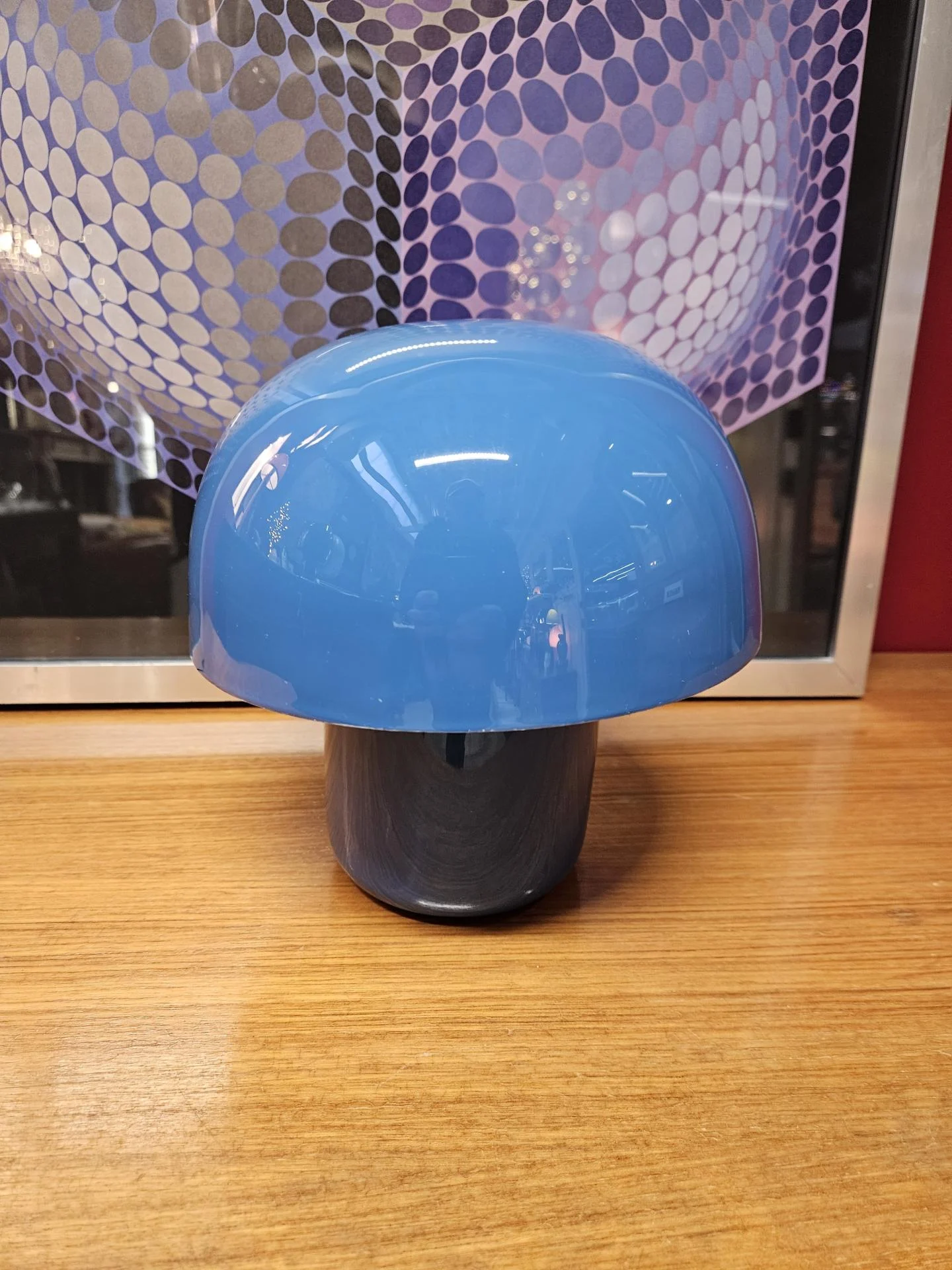 Lampe à poser champignon en métal laqué bleu. Superbe pour créer une belle ambiance dans une chambre d'enfance ou pour un salon pop vintage. Hauteur 20 cm - Diamètre 18 cm.