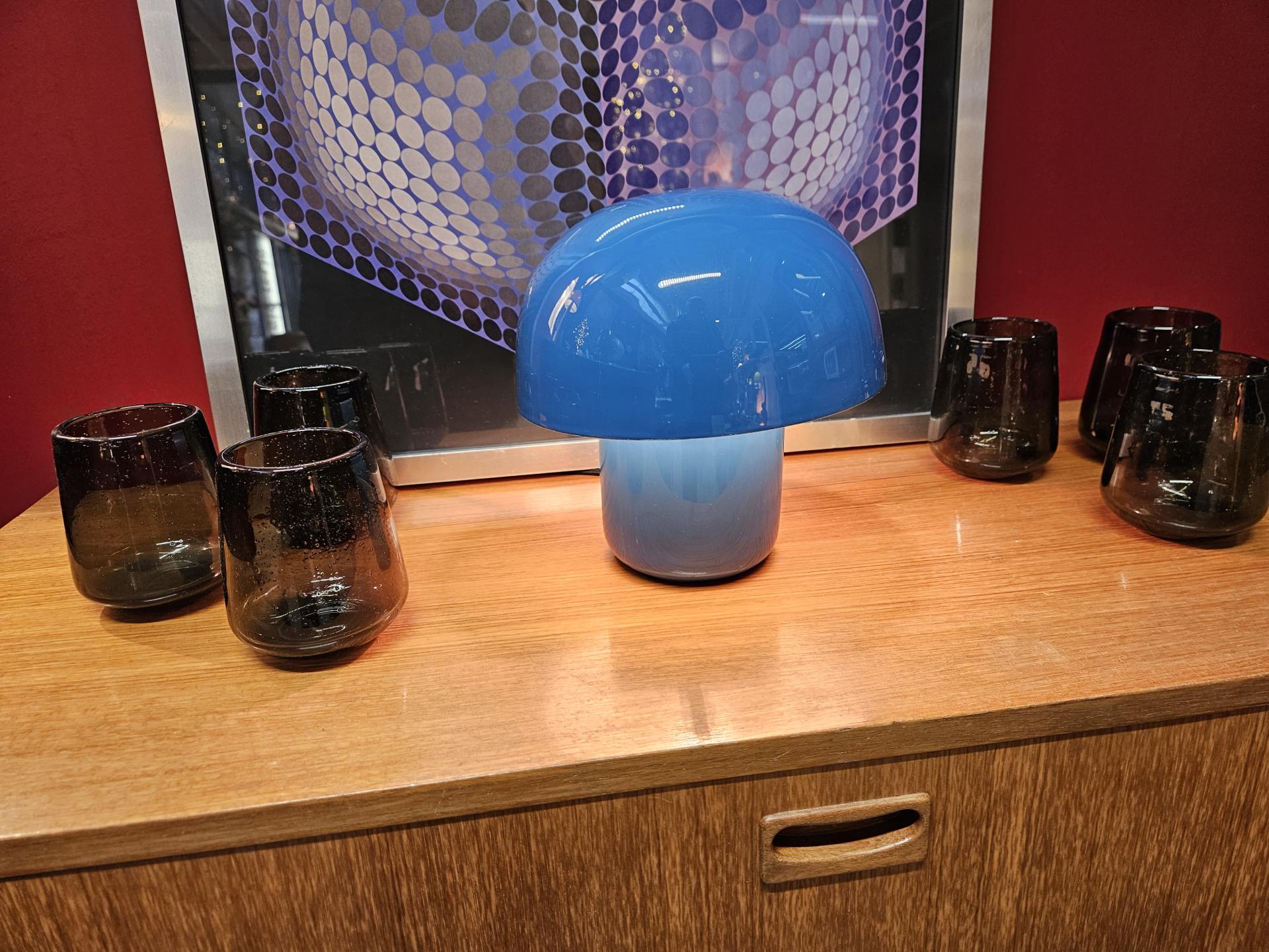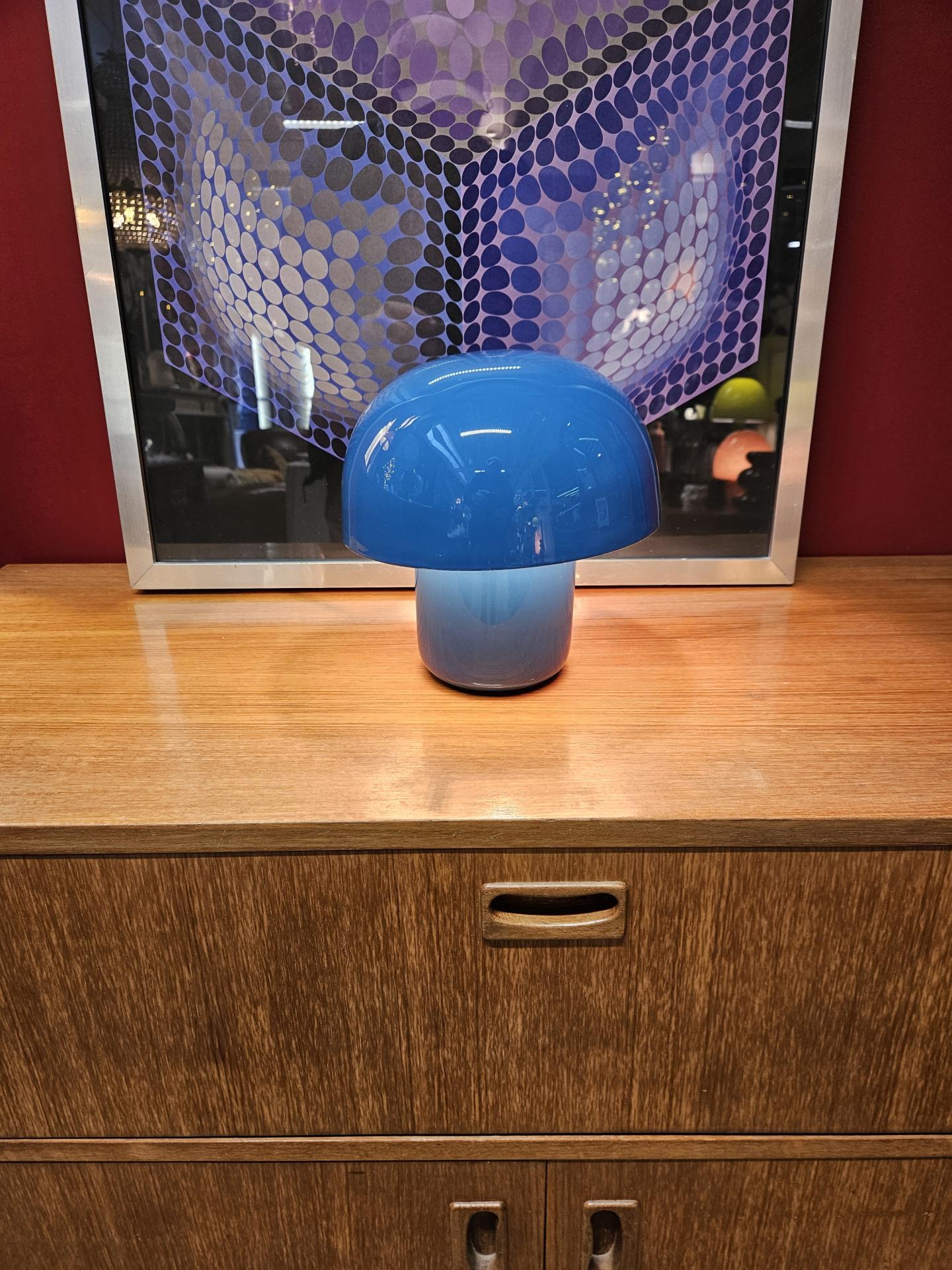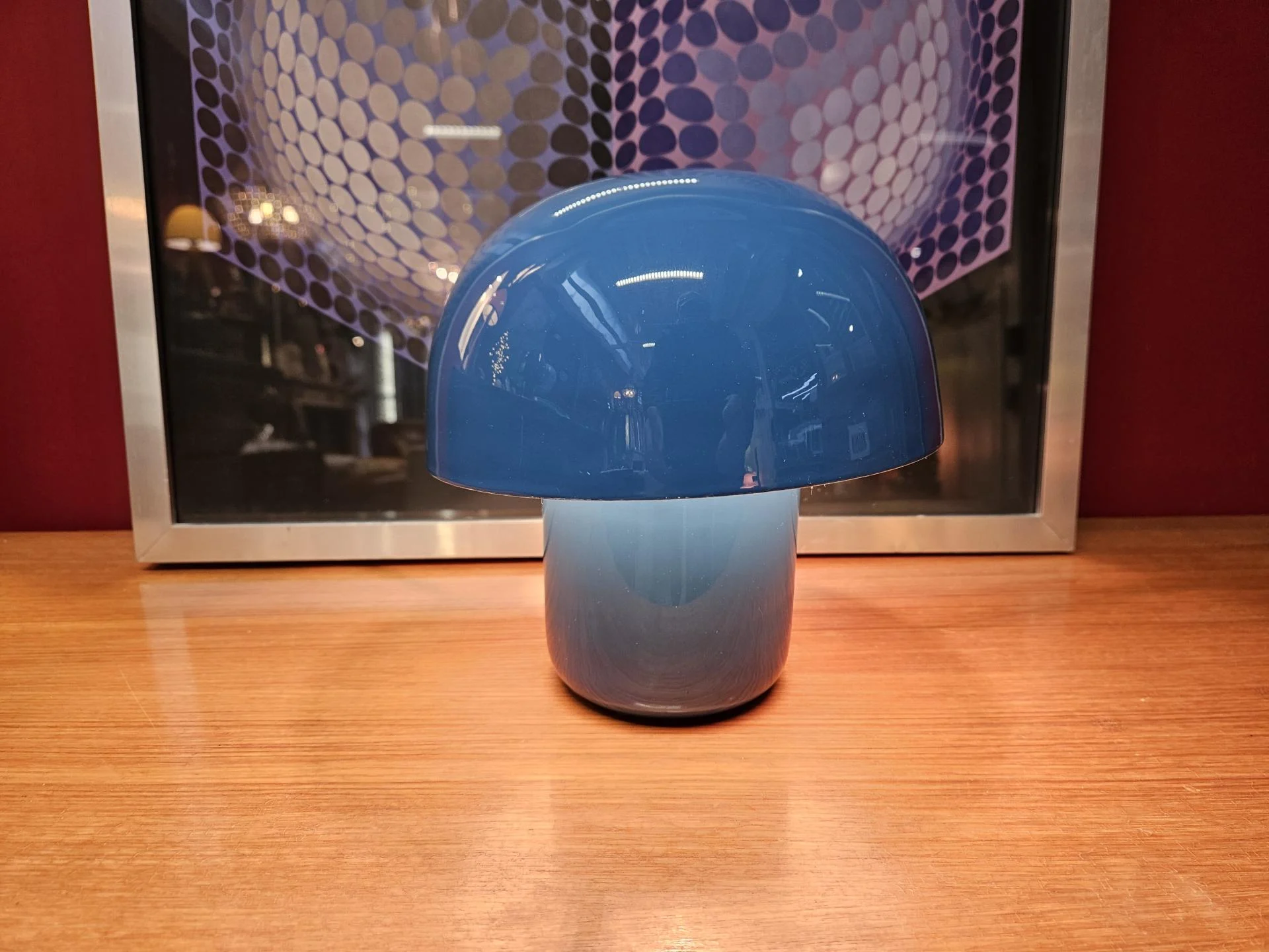 Lampe à poser champignon en métal laqué bleu. Superbe pour créer une belle ambiance dans une chambre d'enfance ou pour un salon pop vintage. Hauteur 20 cm - Diamètre 18 cm.