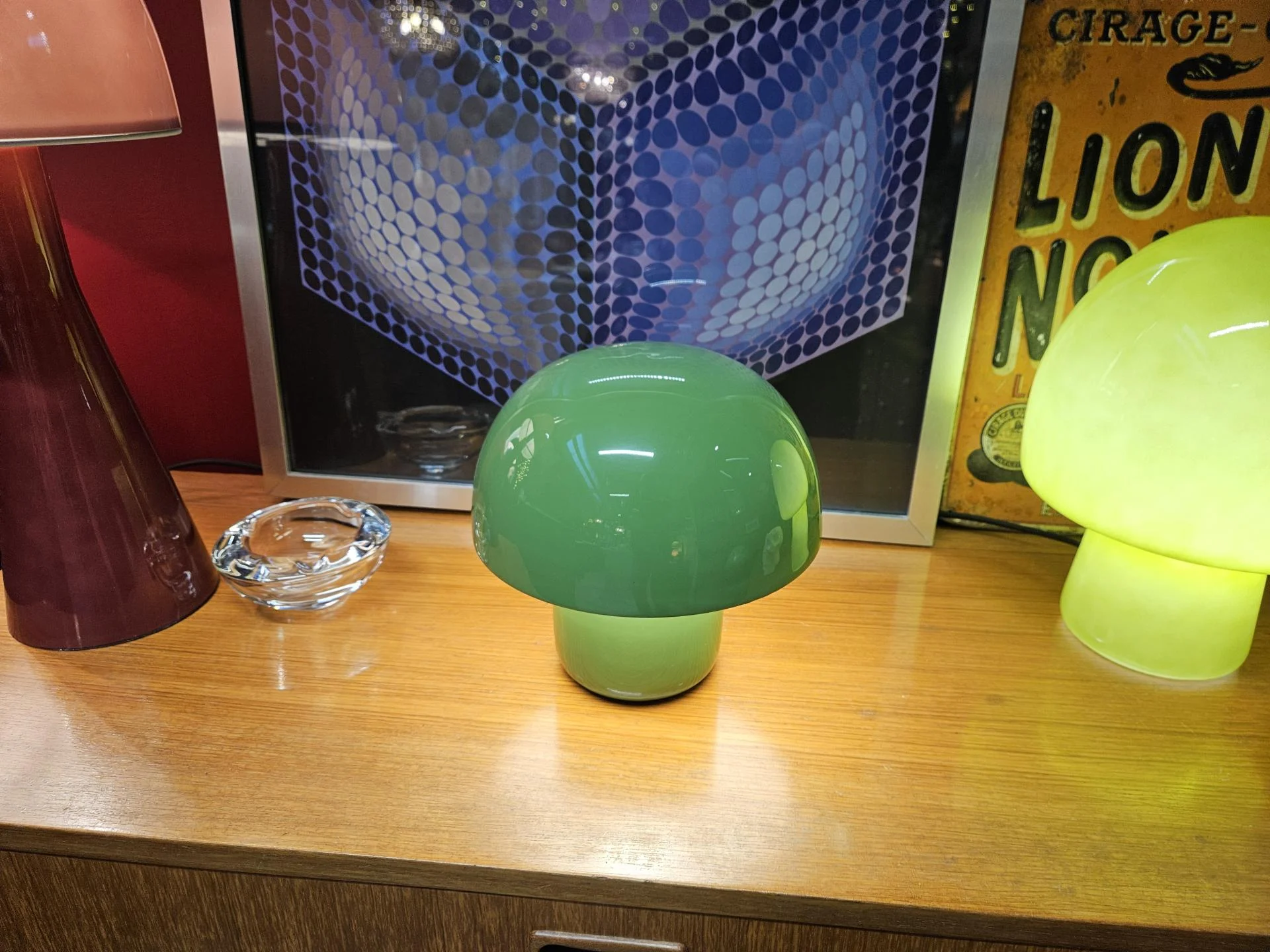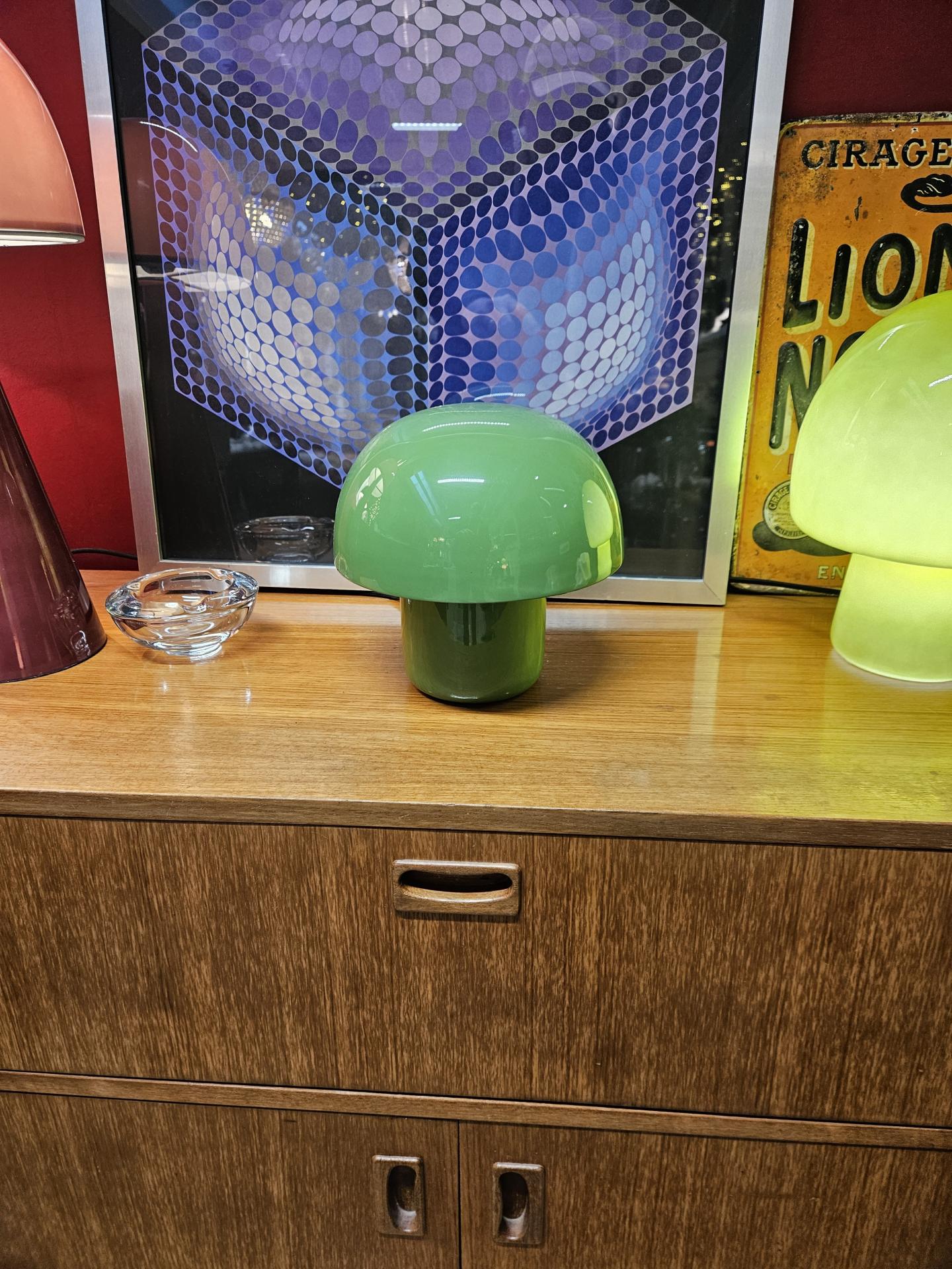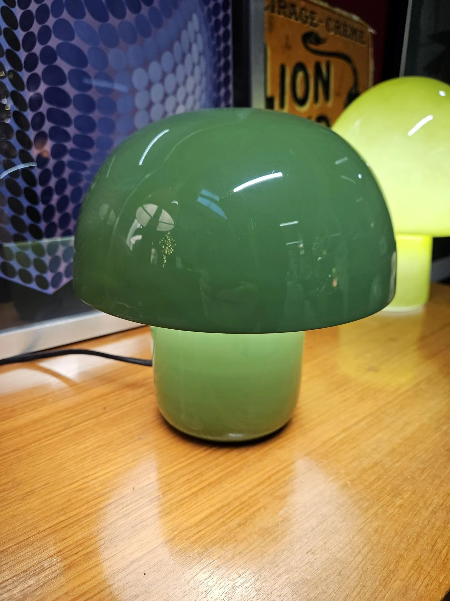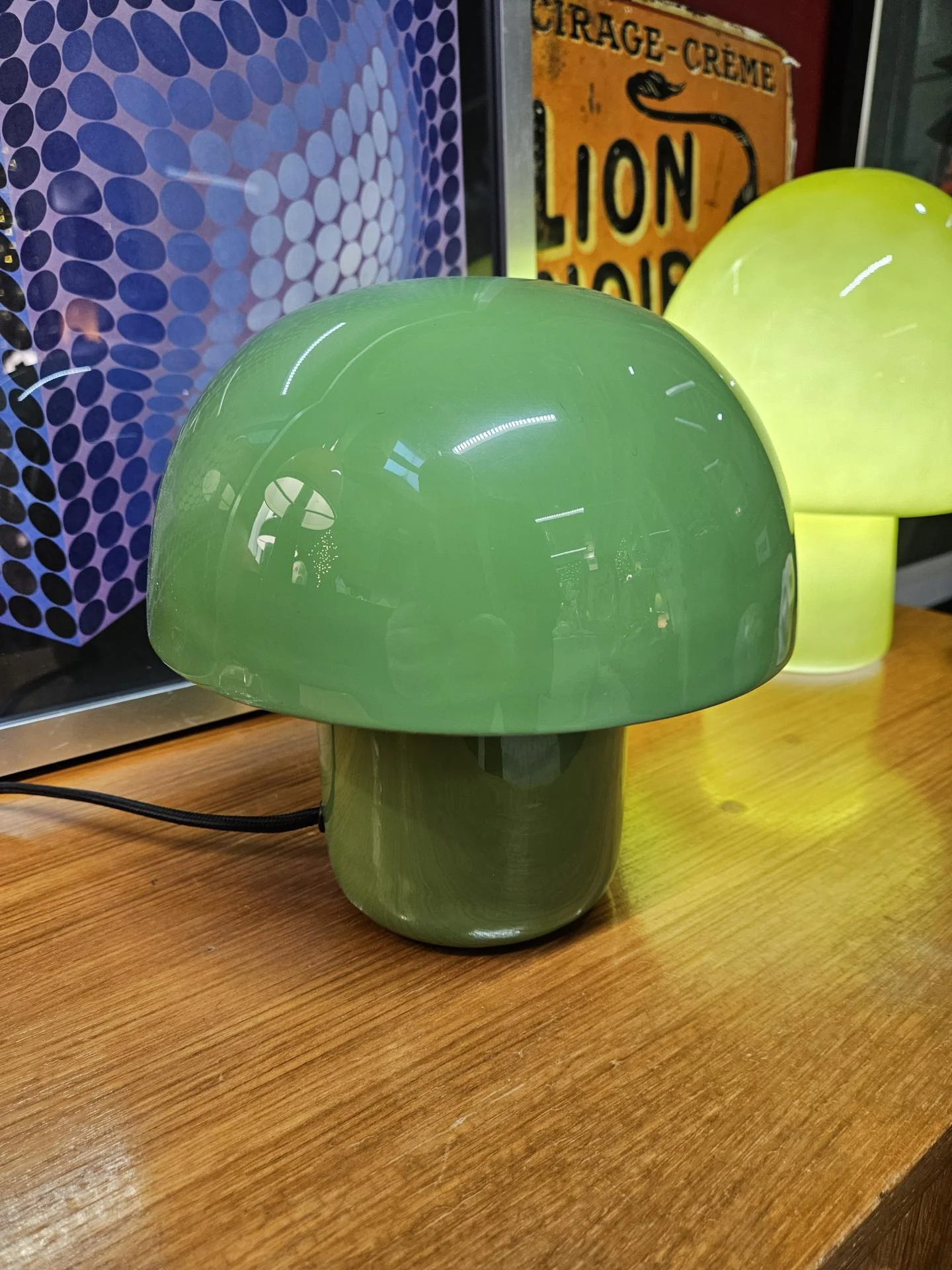 Lampe à poser champignon en métal laqué vert. Superbe pour créer une belle ambiance dans une chambre d'enfance ou pour un salon pop vintage. Hauteur 20 cm - Diamètre 18 cm.