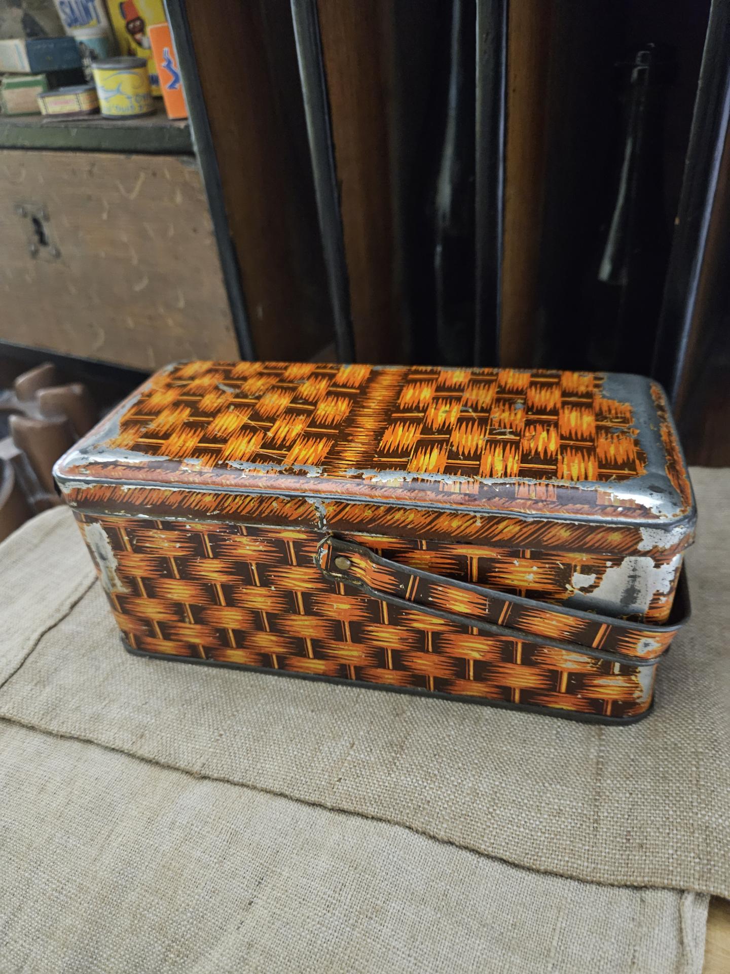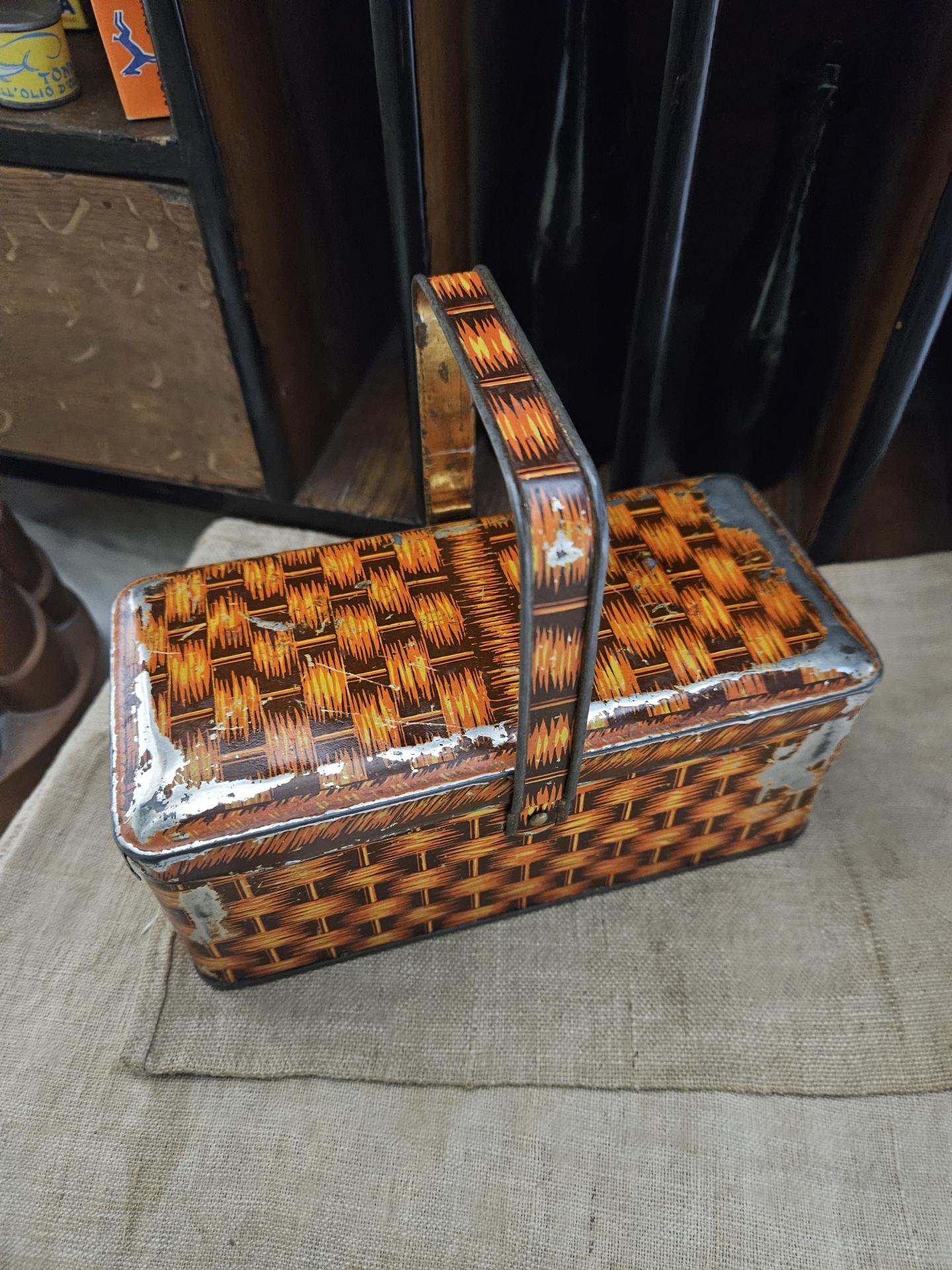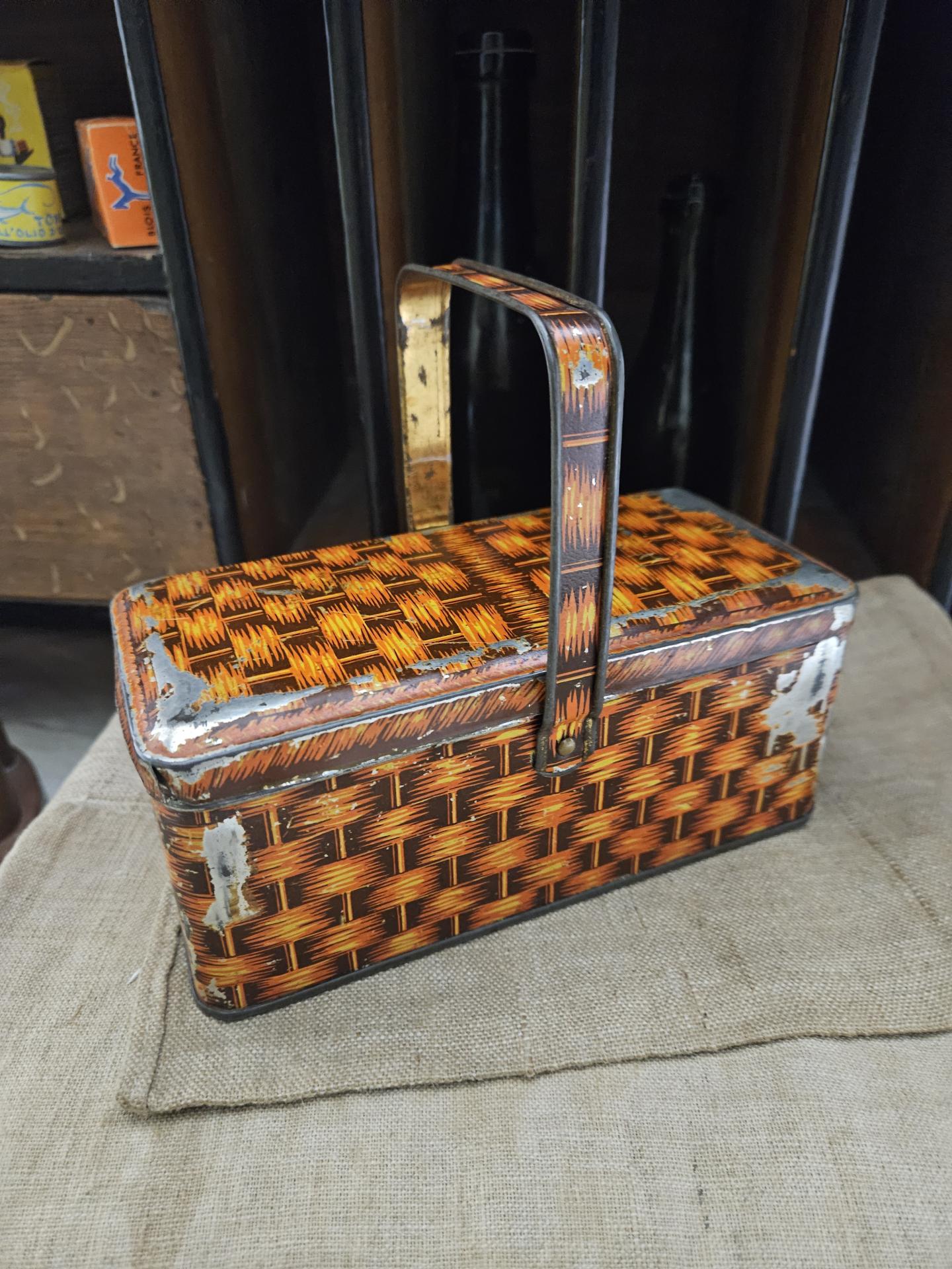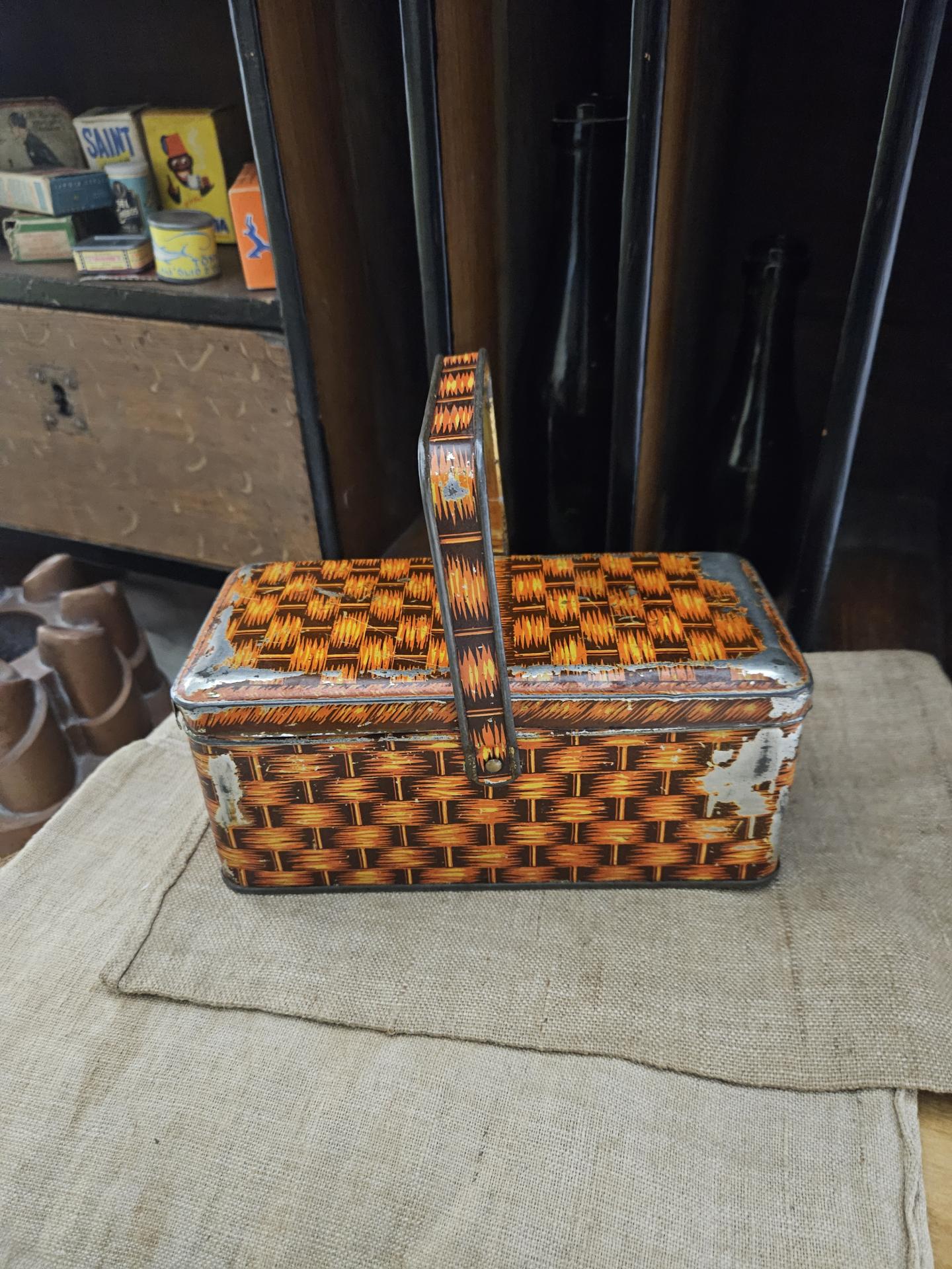 Ancienne boite en métal lithographié. Boite en forme de panier. A noter traces d'usures . Dimensions 19 cm x 10 cm - Hauteur 15 / 8 cm