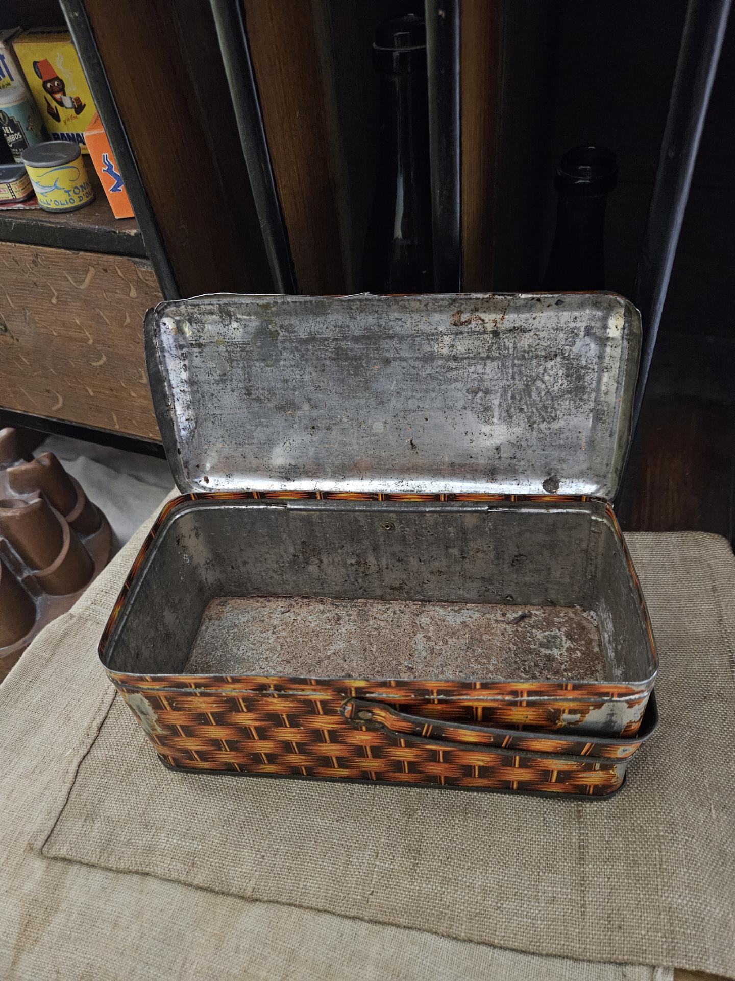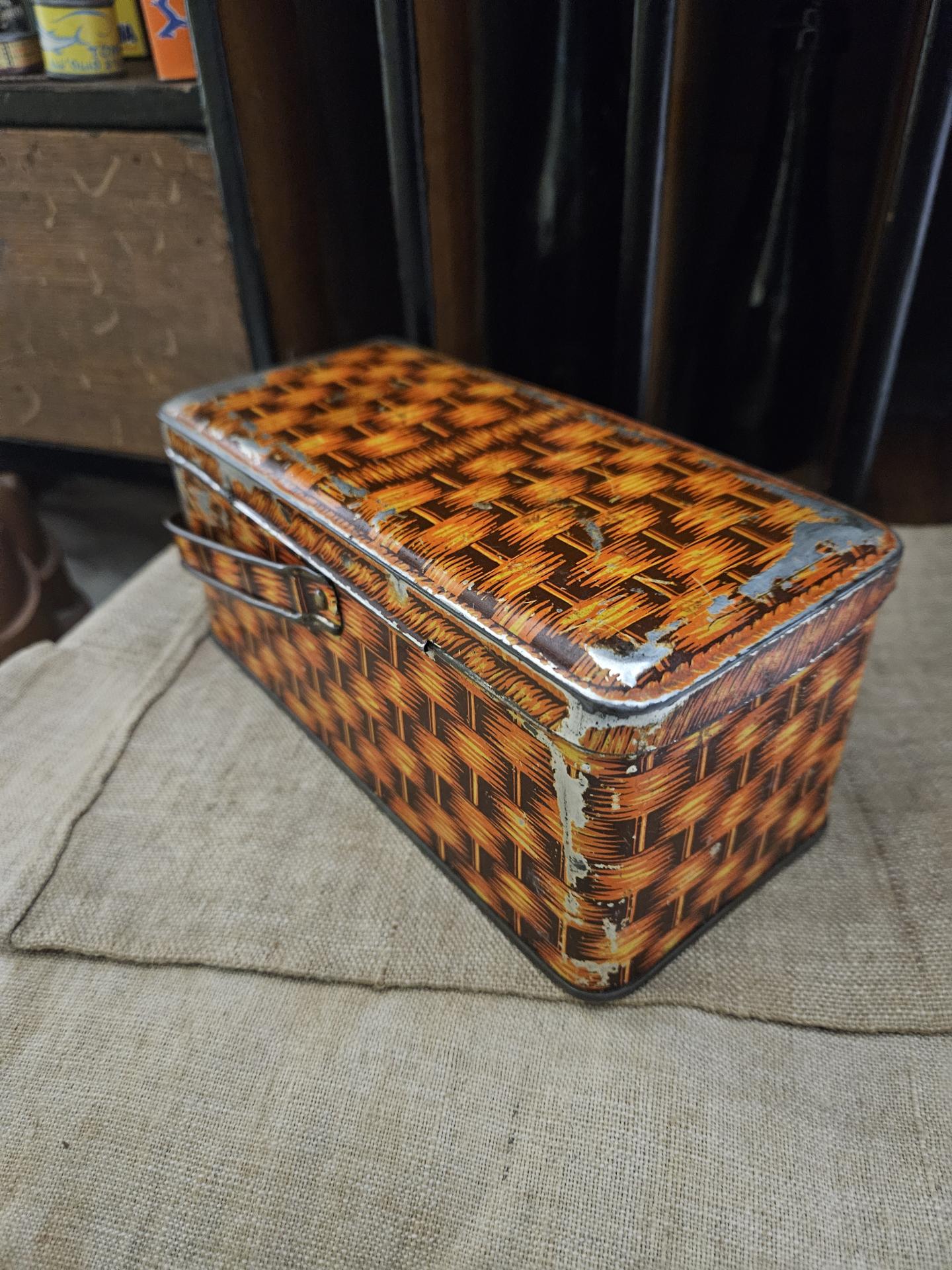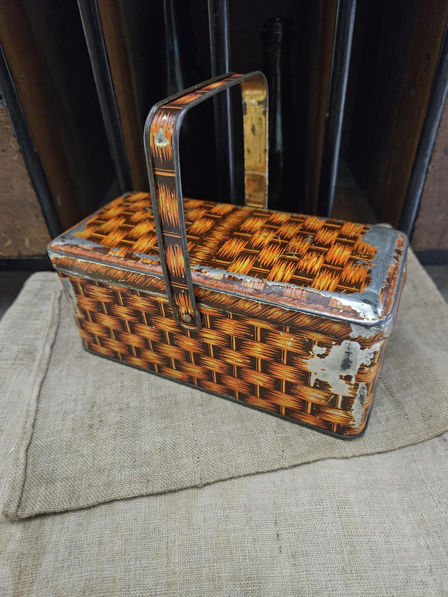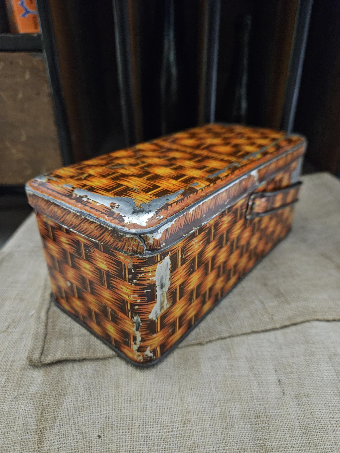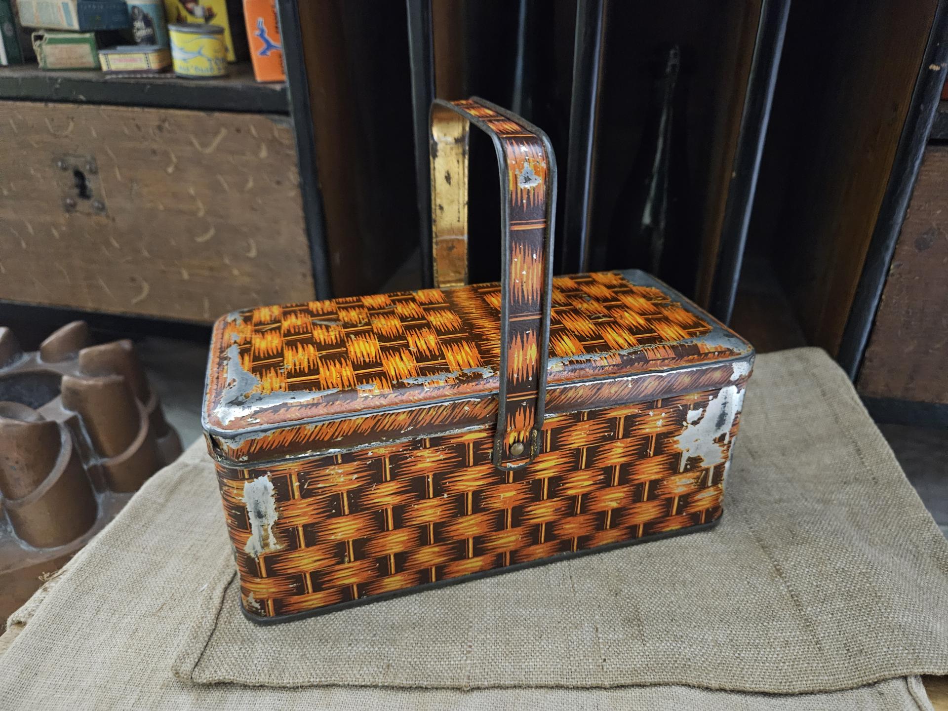 Ancienne boite en métal lithographié. Boite en forme de panier. A noter traces d'usures . Dimensions 19 cm x 10 cm - Hauteur 15 / 8 cm