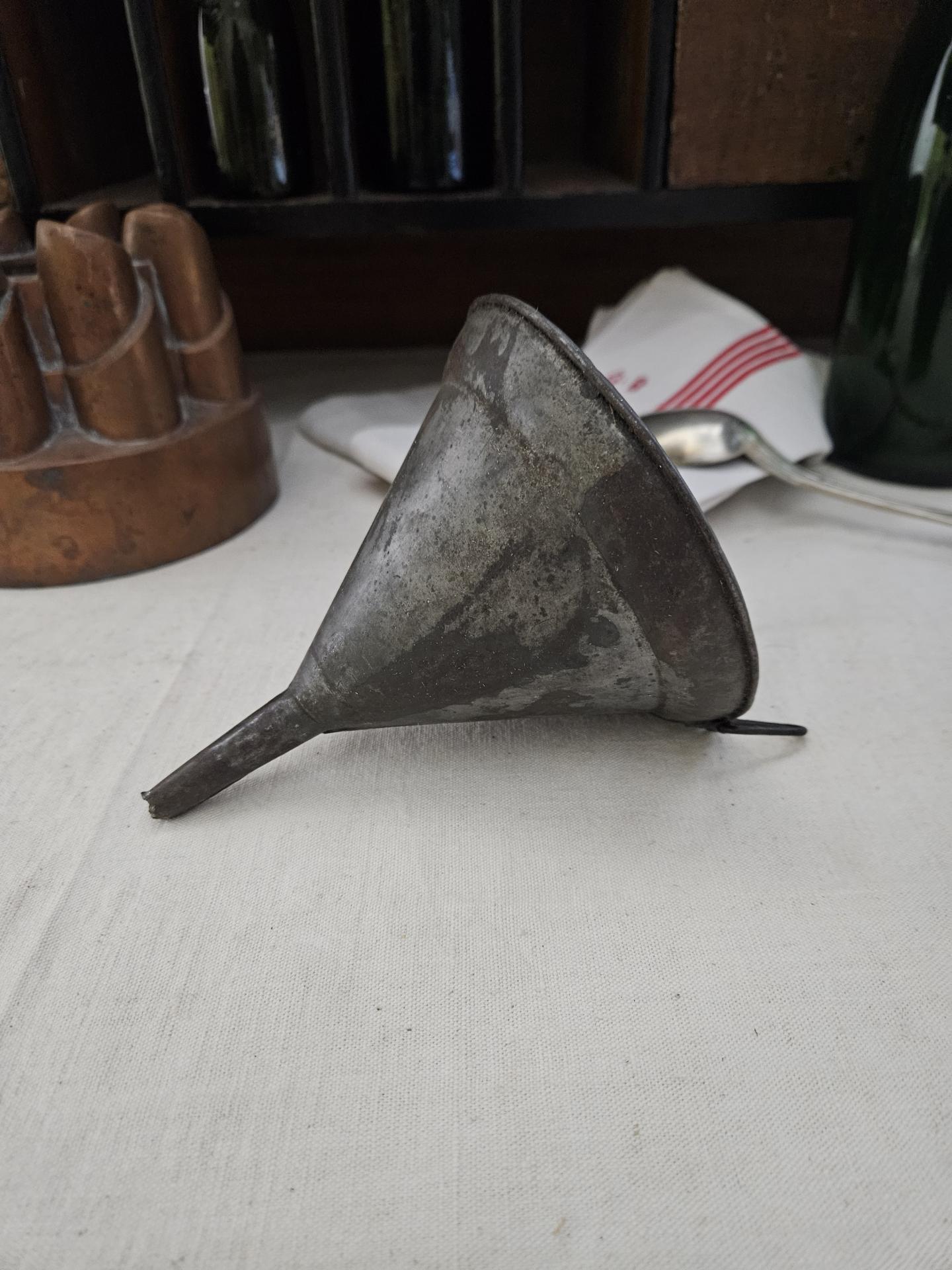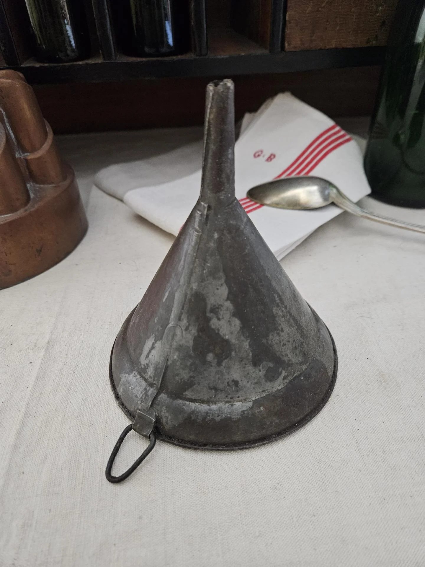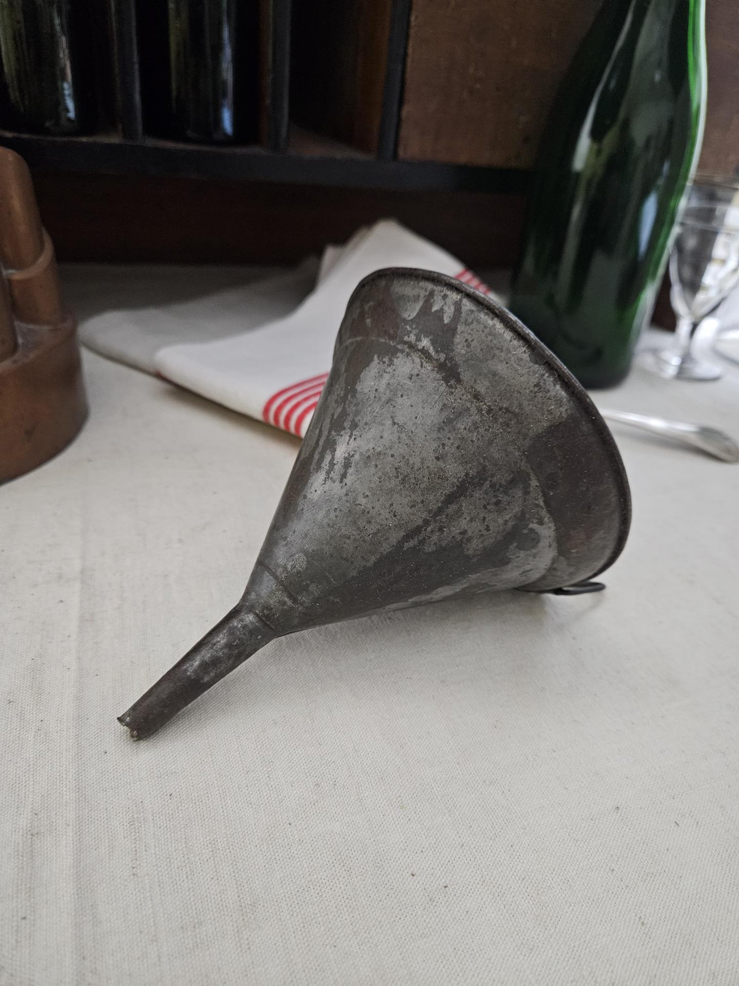 Ancien entonnoir en zinc avec son attache et avec sa belle patine de métal vieilli. Diamètre 12 cm - Longueur 15 cm.