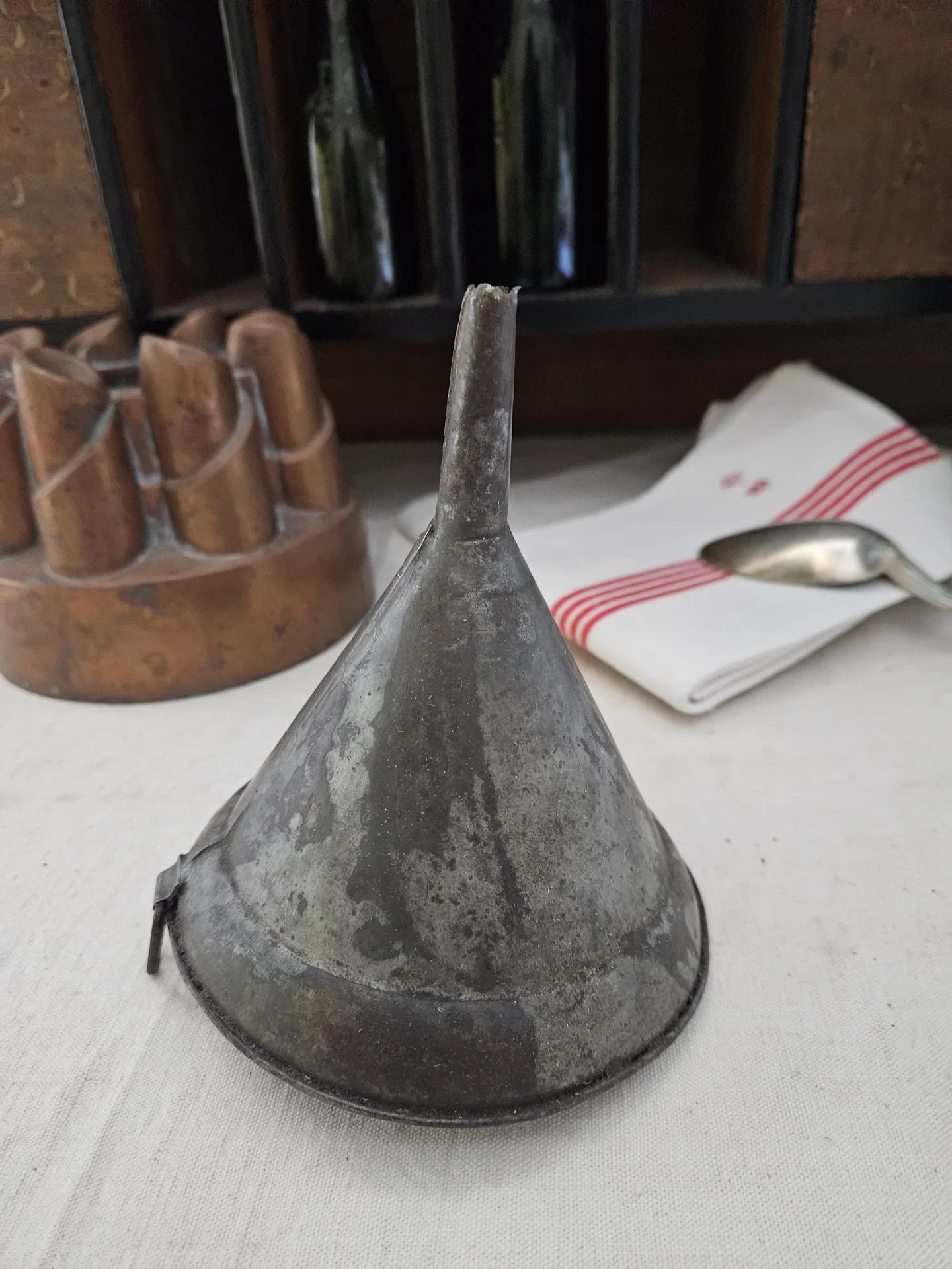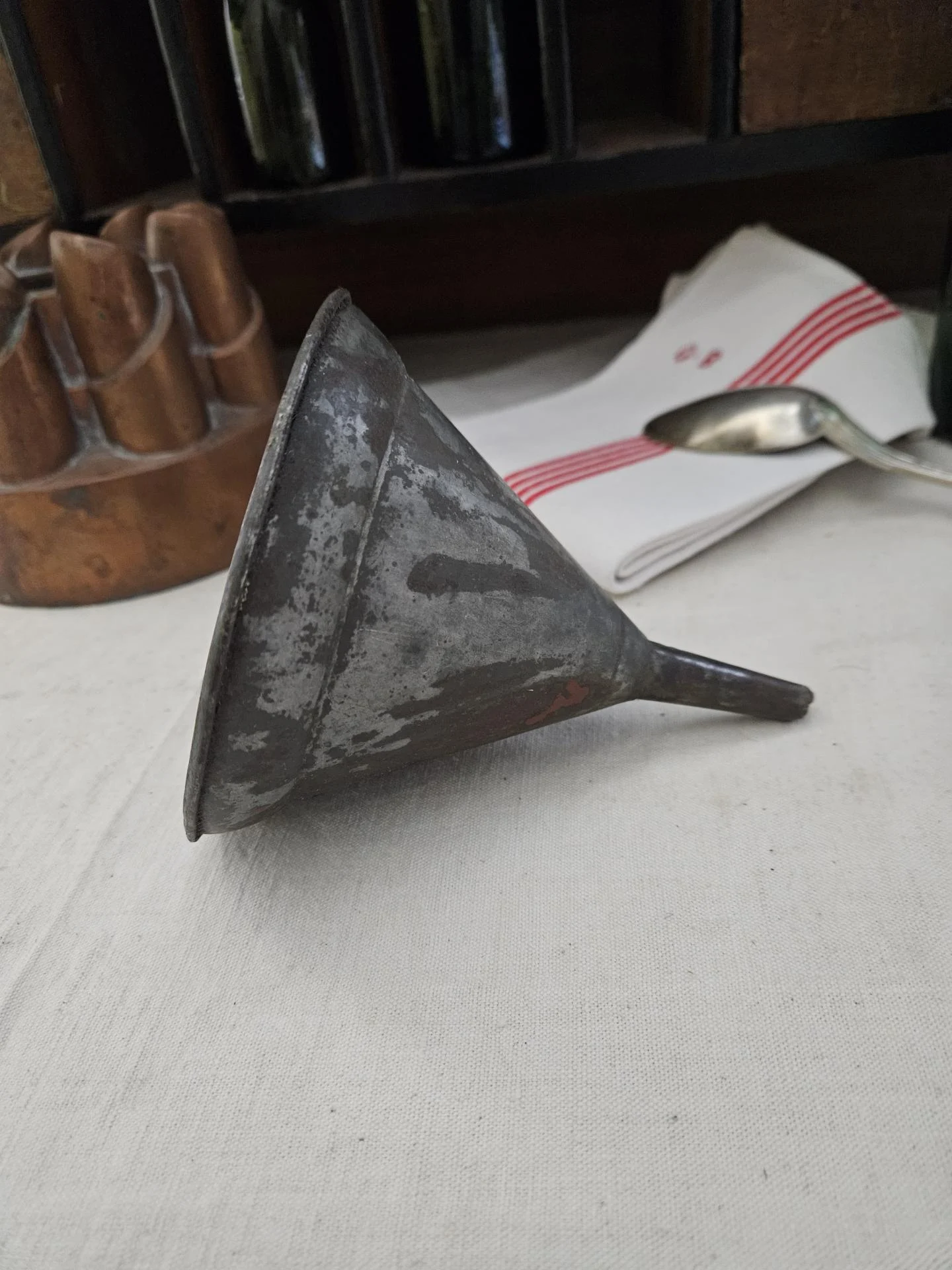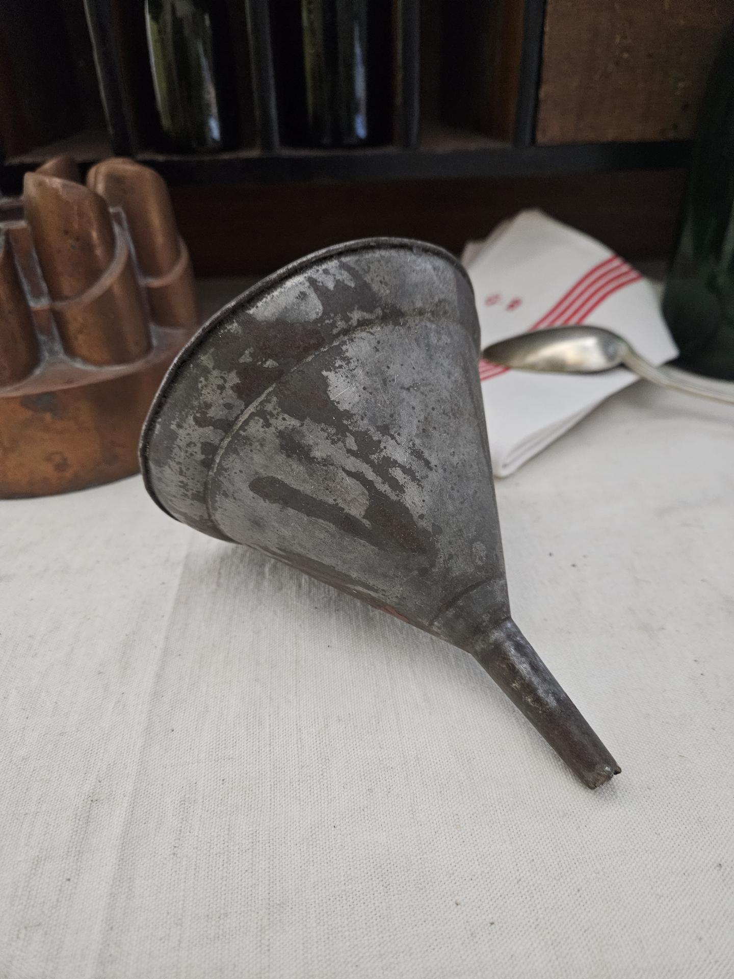 Ancien entonnoir en zinc avec son attache et avec sa belle patine de métal vieilli. Diamètre 12 cm - Longueur 15 cm.