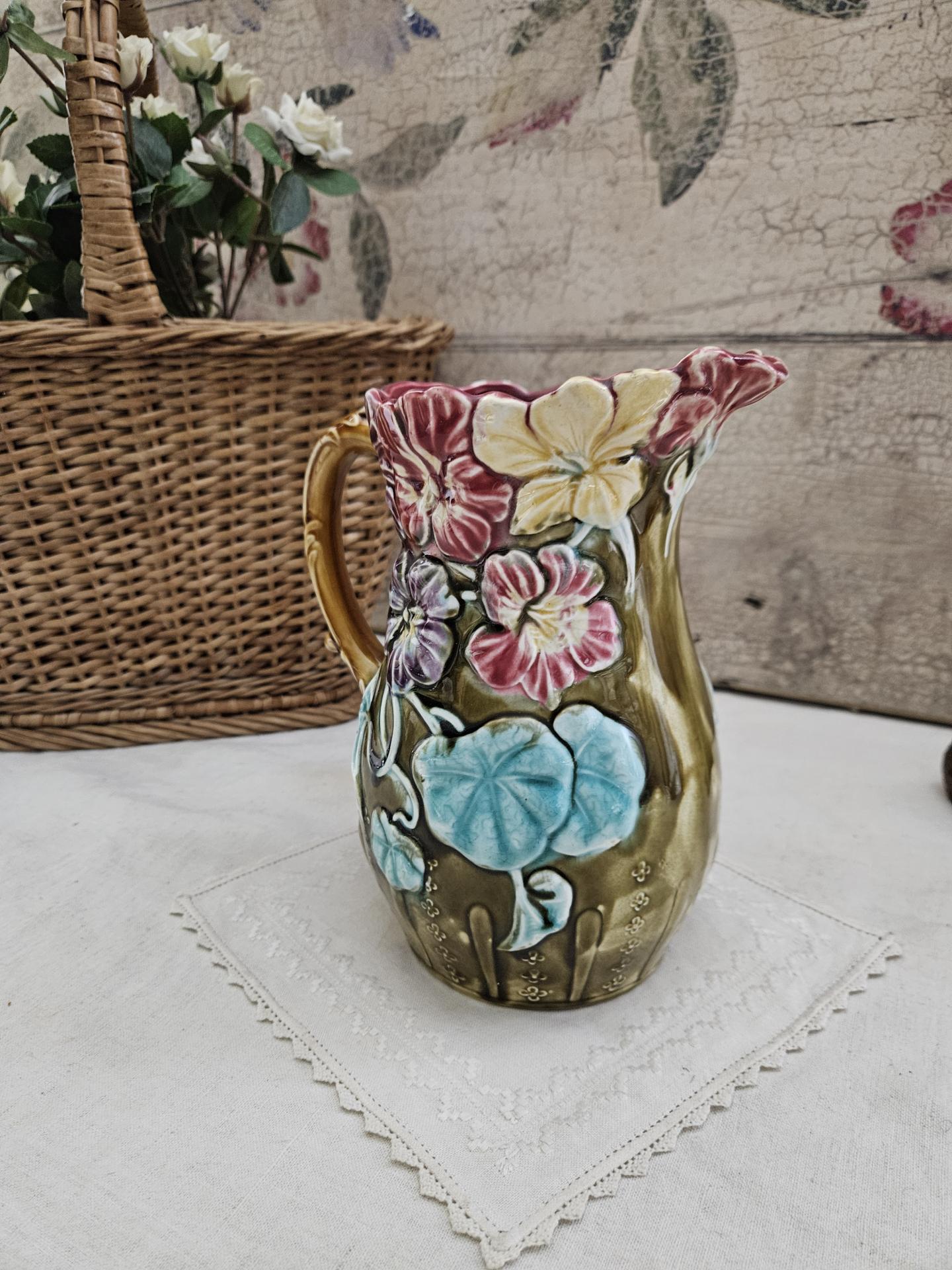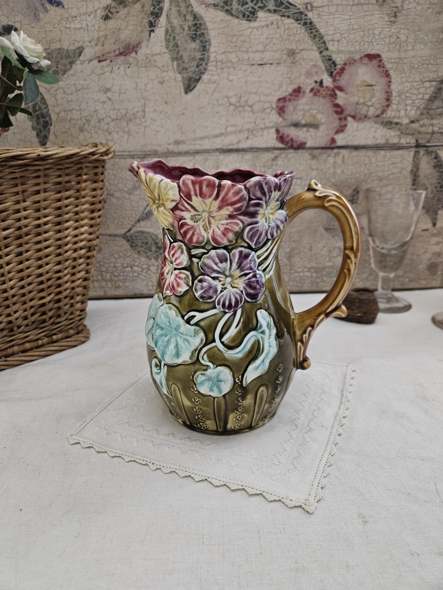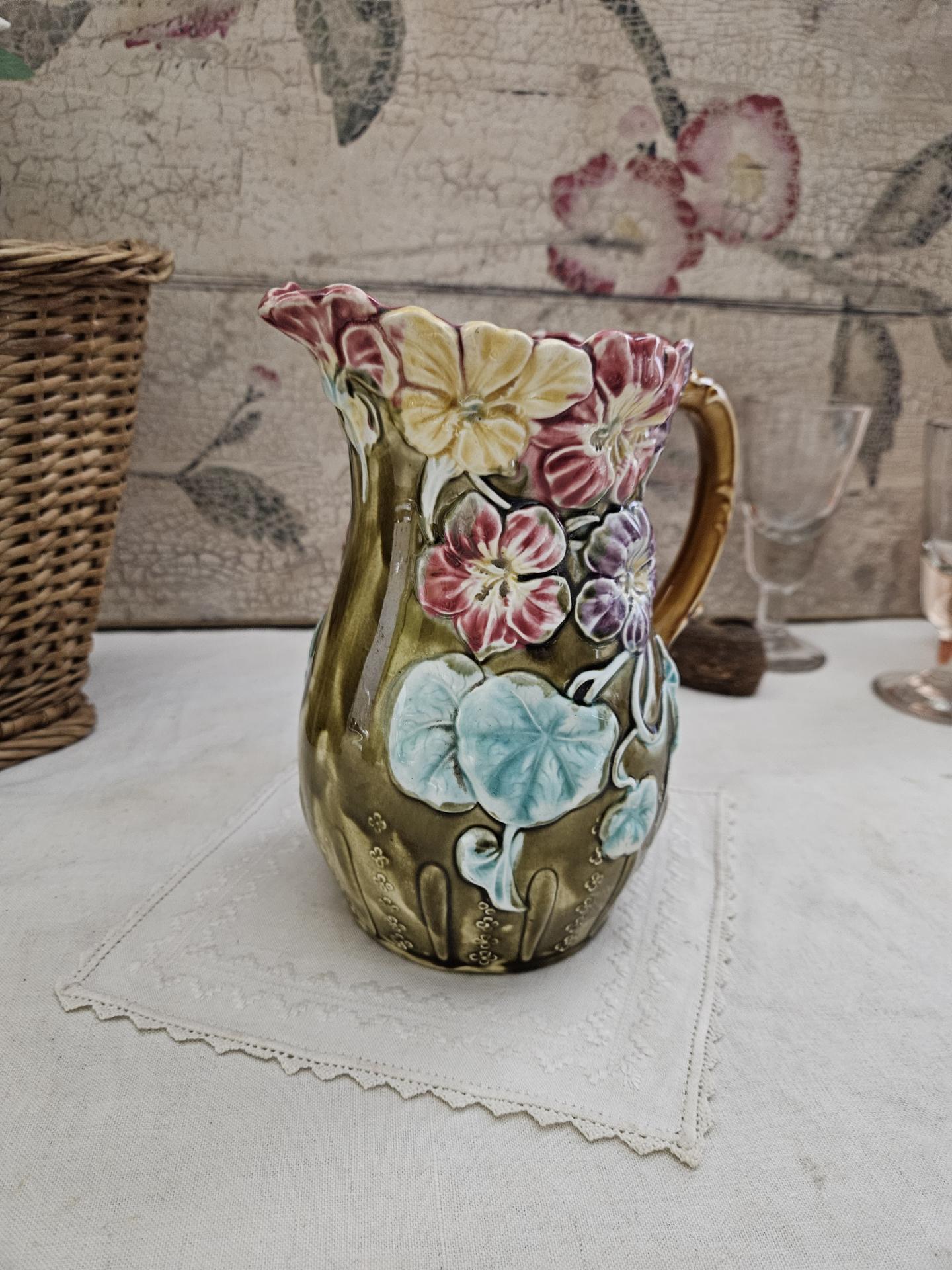 Pichet en barbotine. Ancien pichet en barbotine d'Onnaing, décor capucines. Hauteur 20 cm - Diamètre 13 cm.