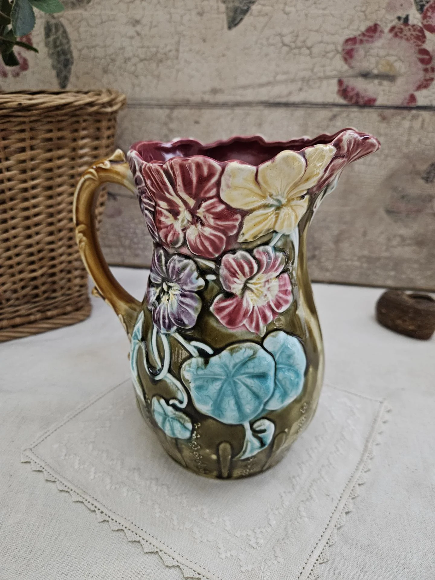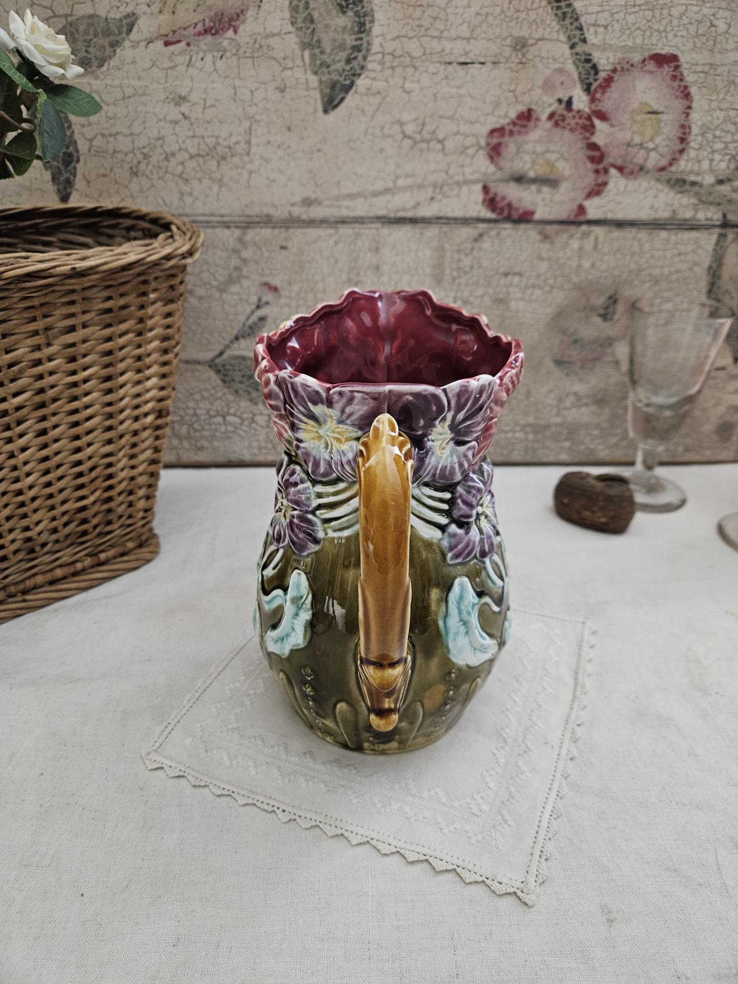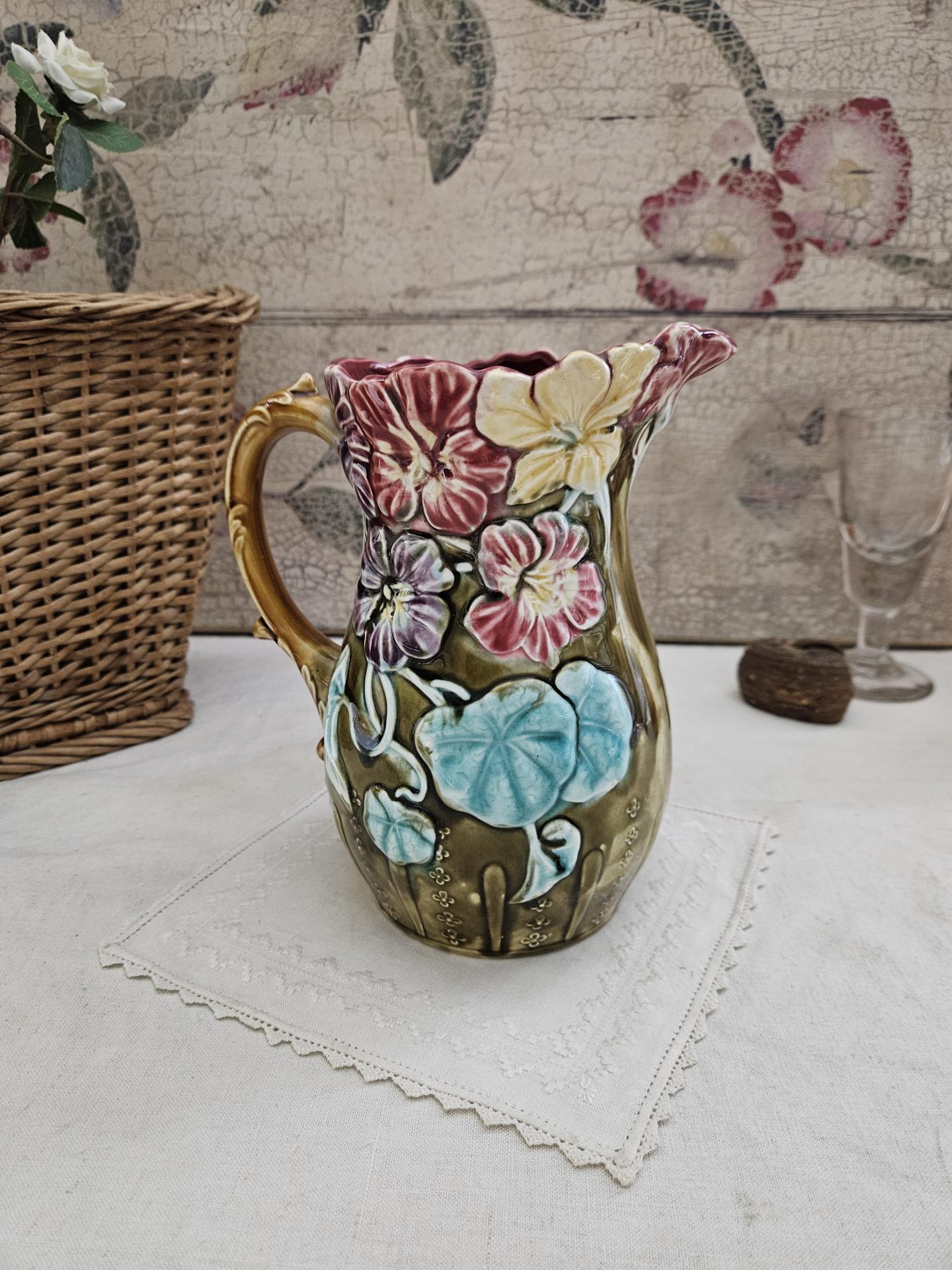 Pichet en barbotine. Ancien pichet en barbotine d'Onnaing, décor capucines. Hauteur 20 cm - Diamètre 13 cm.