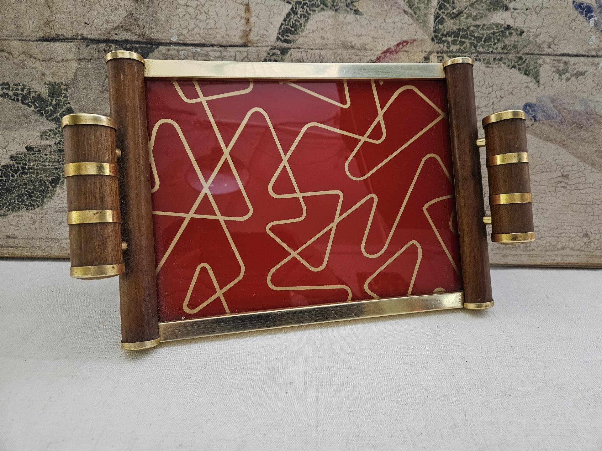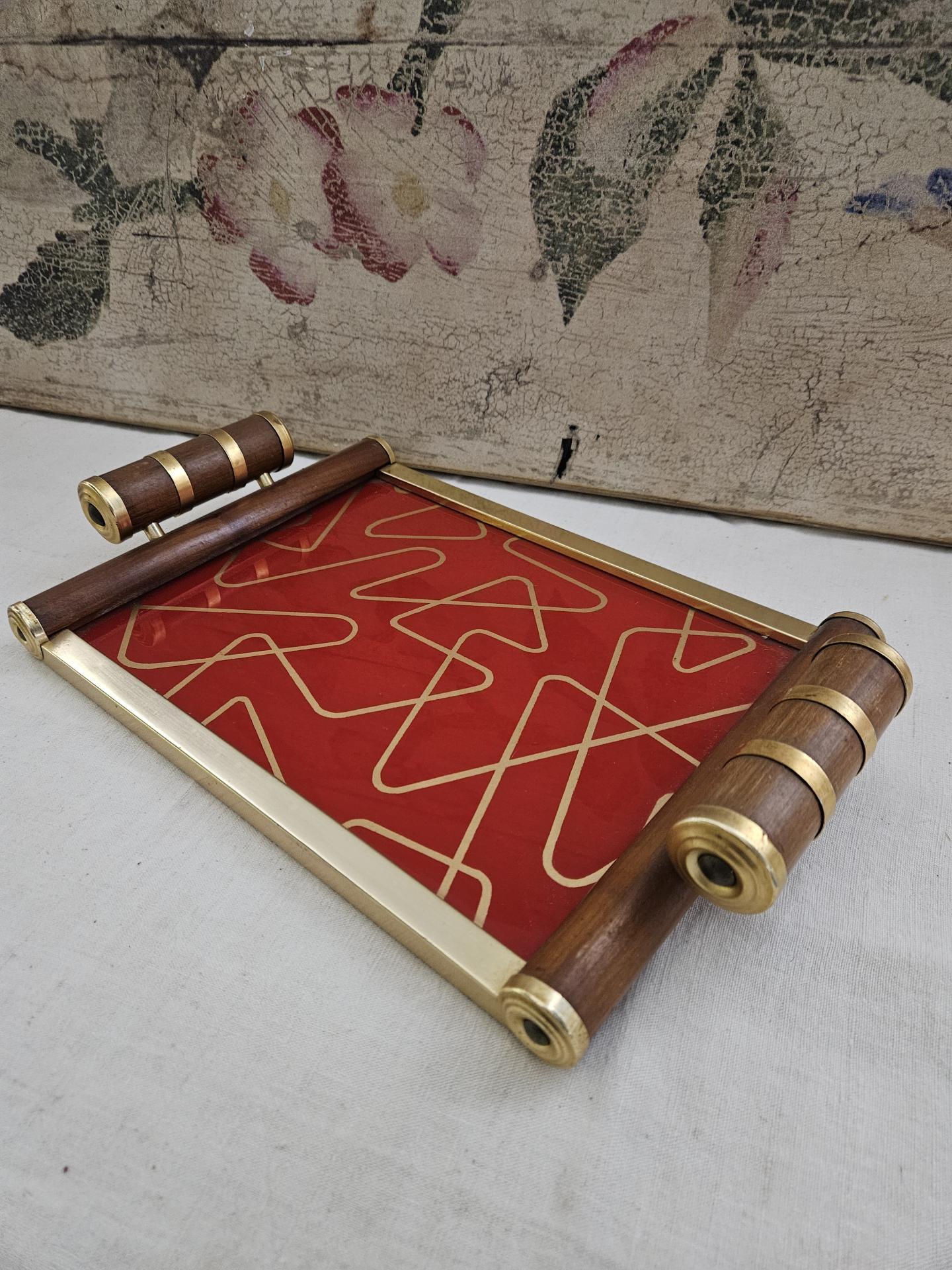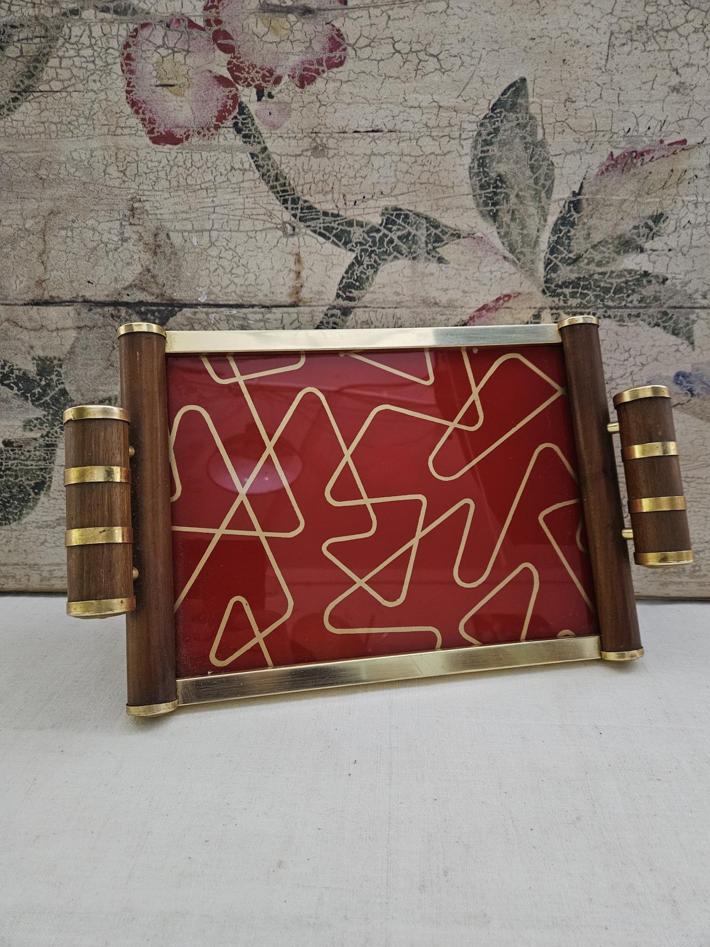 Plateau de service en bois et métal doré Art Déco. Plateau des années 30 en bel état avec de belles couleurs vives. Dimensions 36 cm x 22 cm - Hauteur 6 cm.