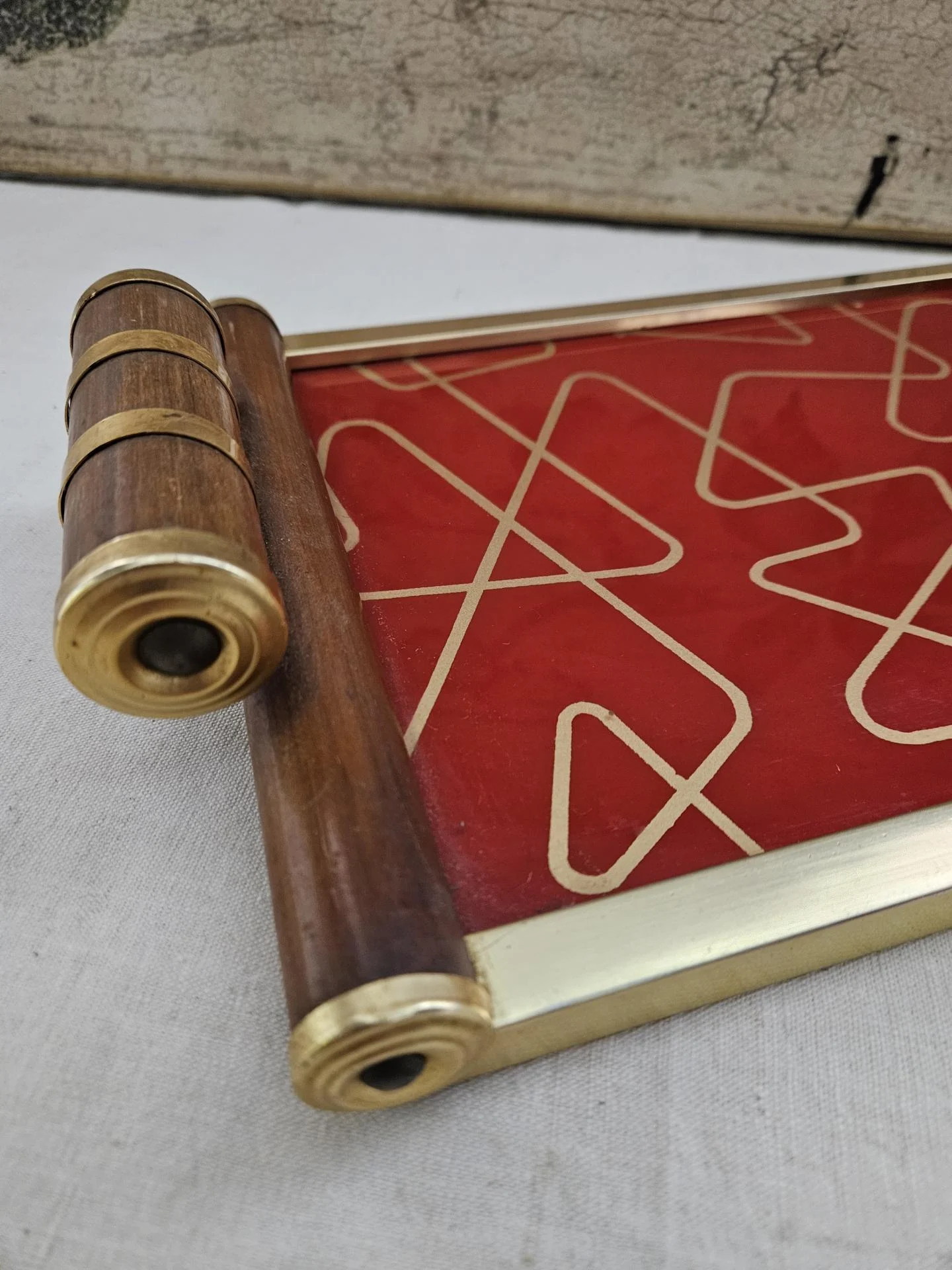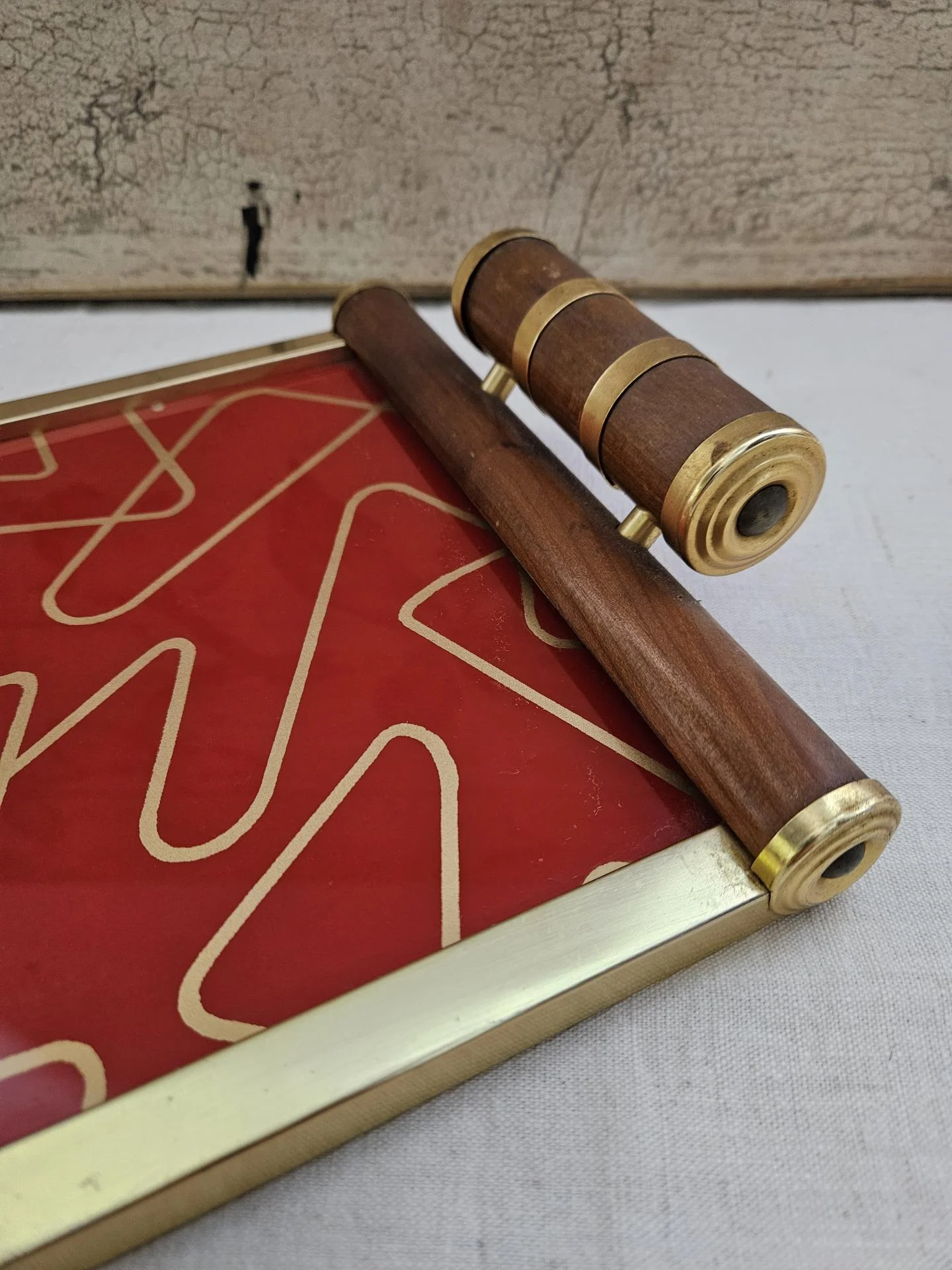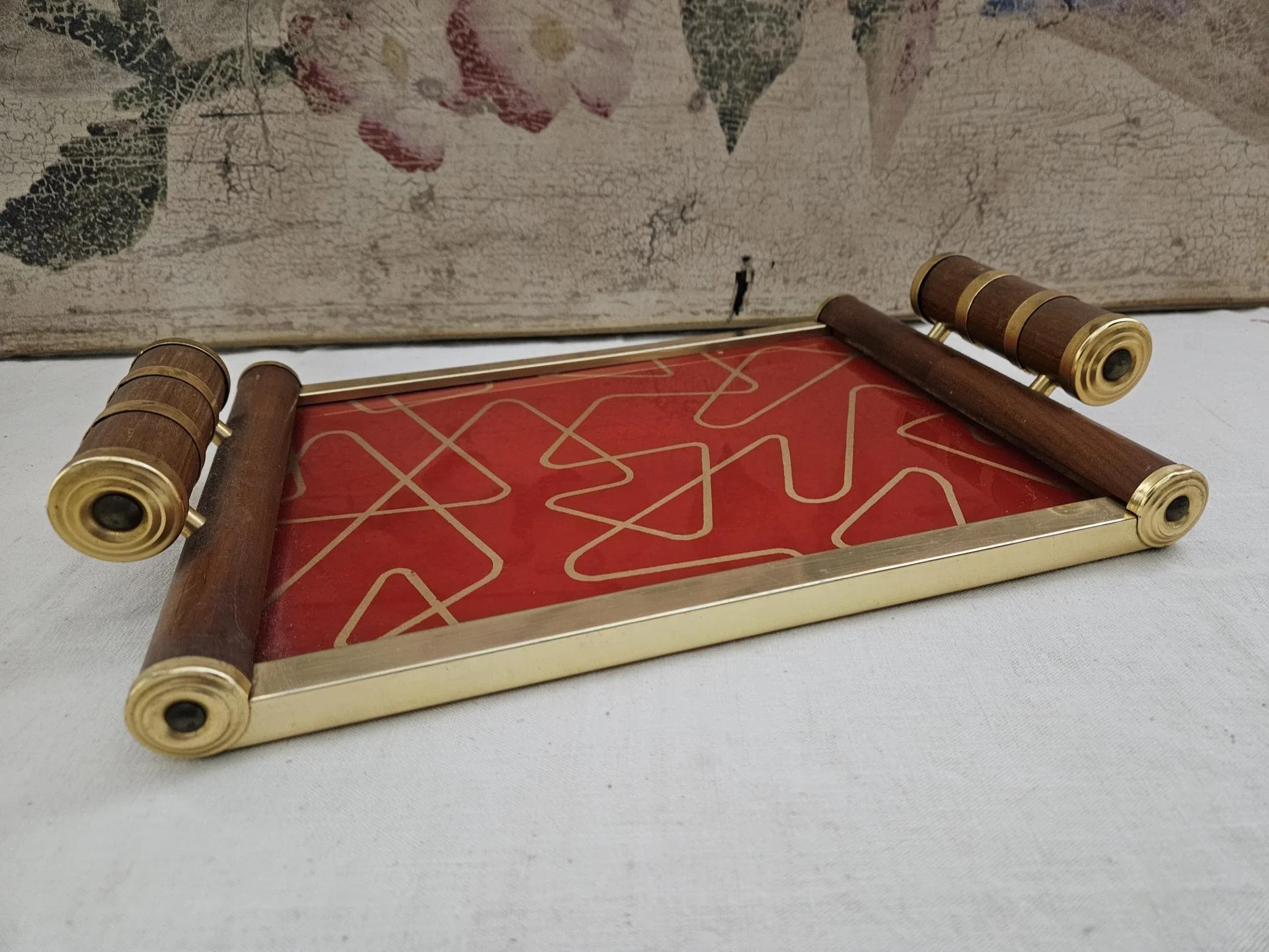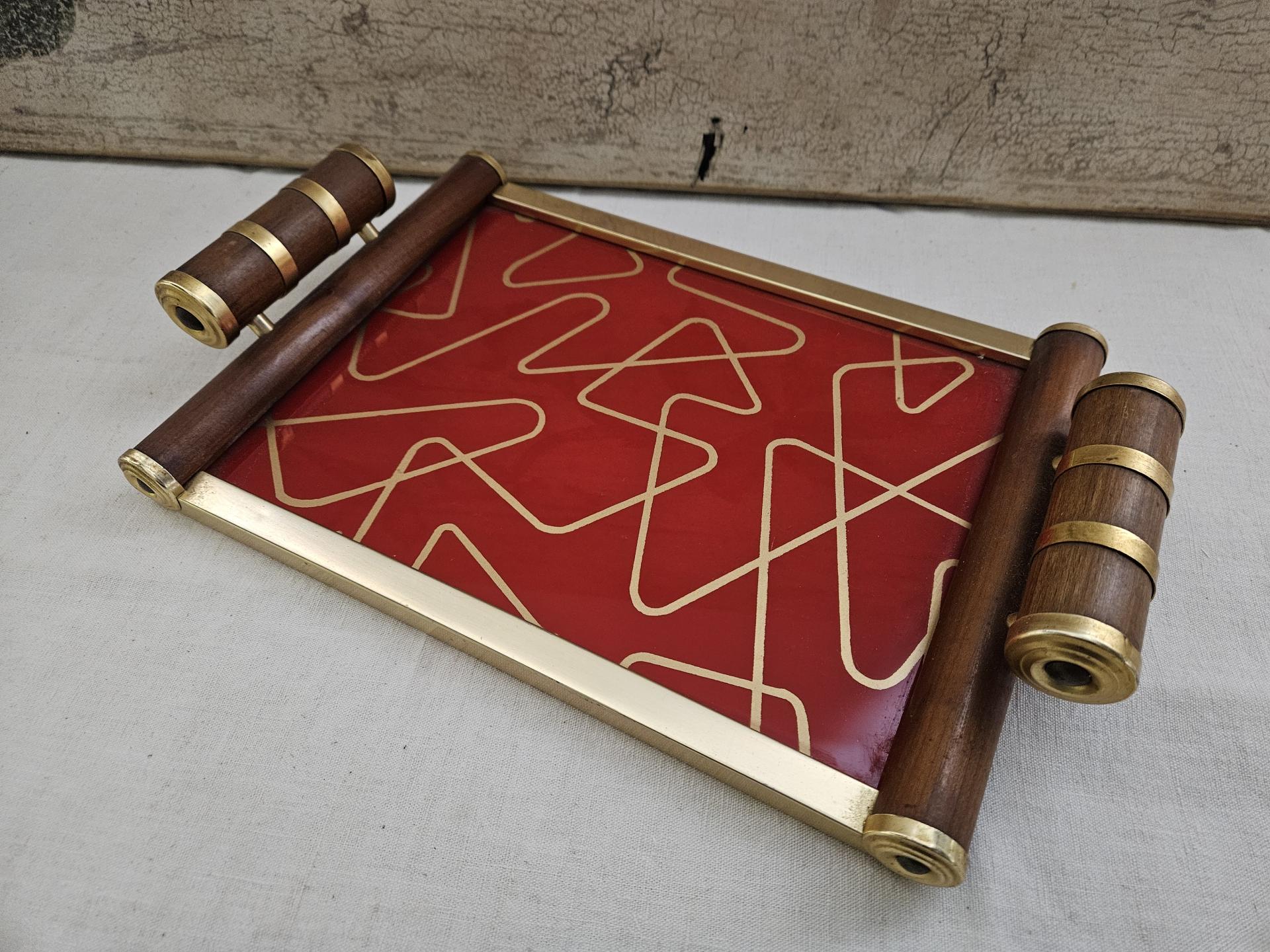 Plateau de service en bois et métal doré Art Déco. Plateau des années 30 en bel état avec de belles couleurs vives. Dimensions 36 cm x 22 cm - Hauteur 6 cm.
