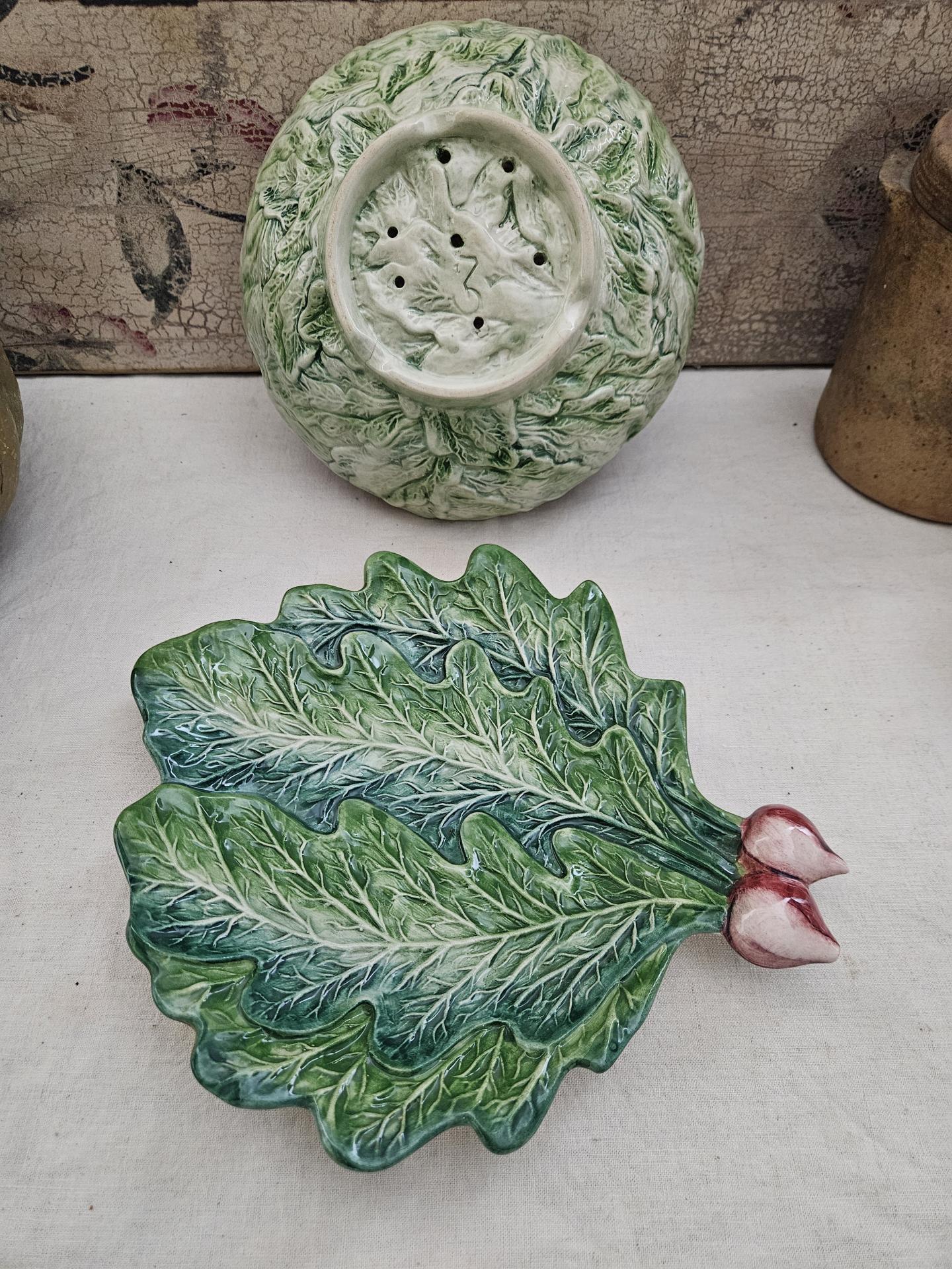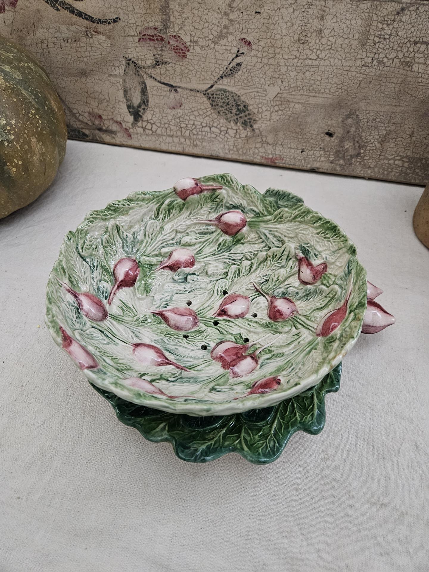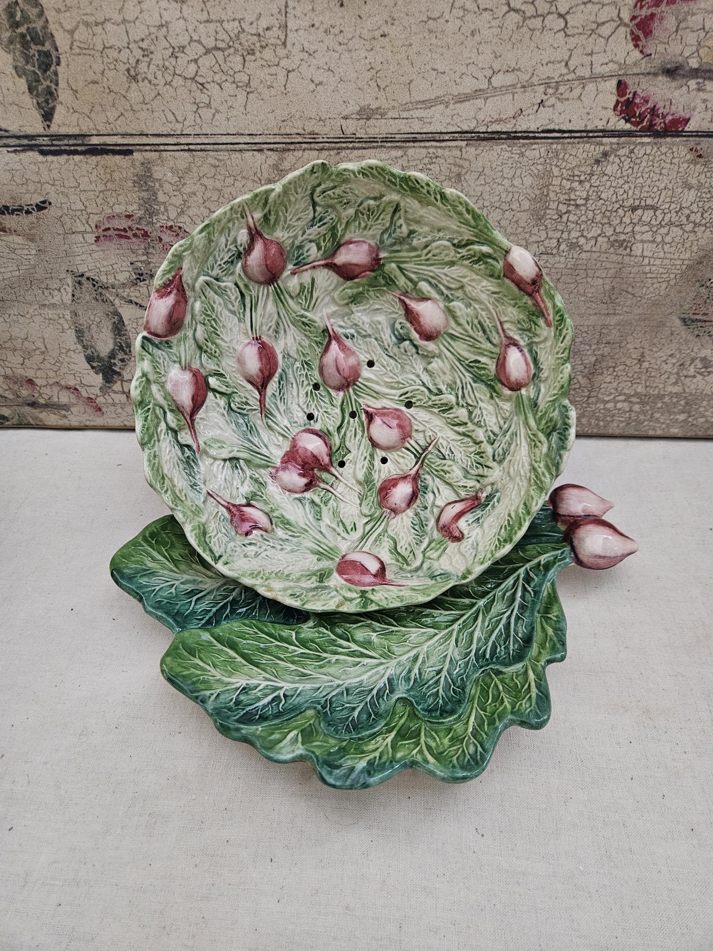 Plat et égouttoir en barbotine au décor végétal et radis. Hauteur 10 cm - Diamètre 30 cm.