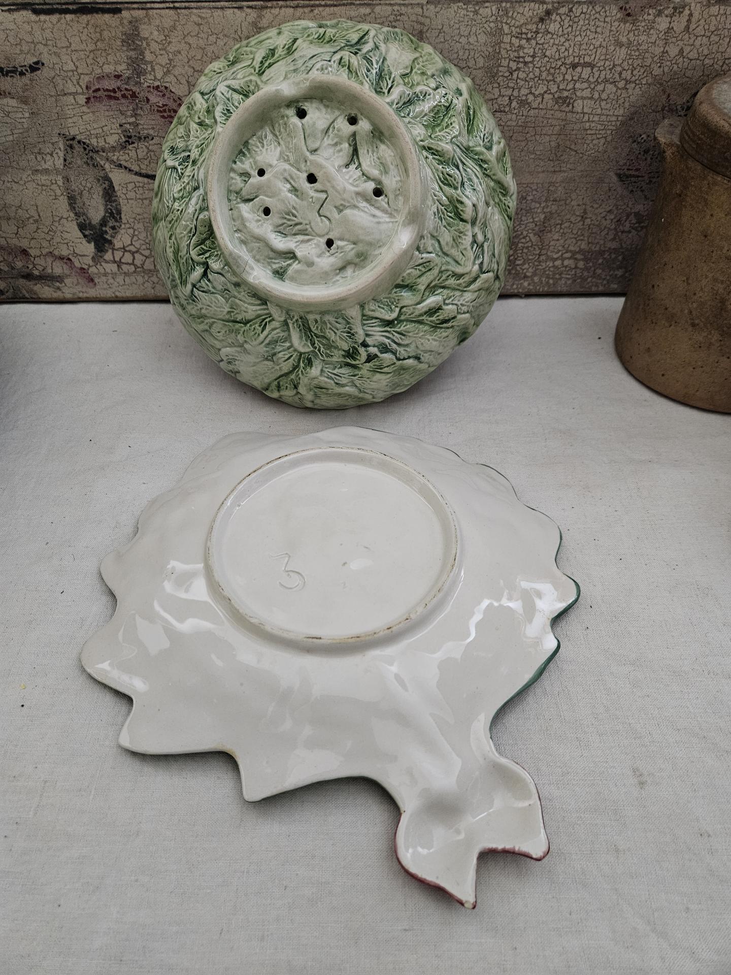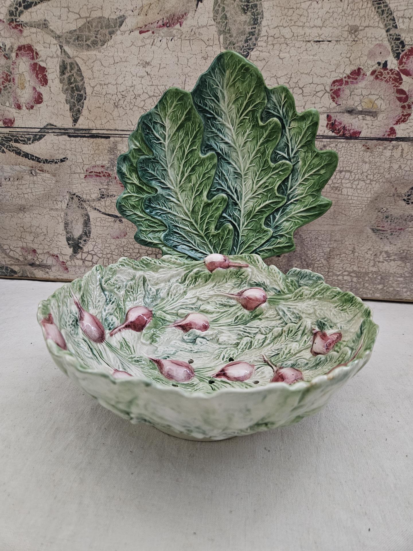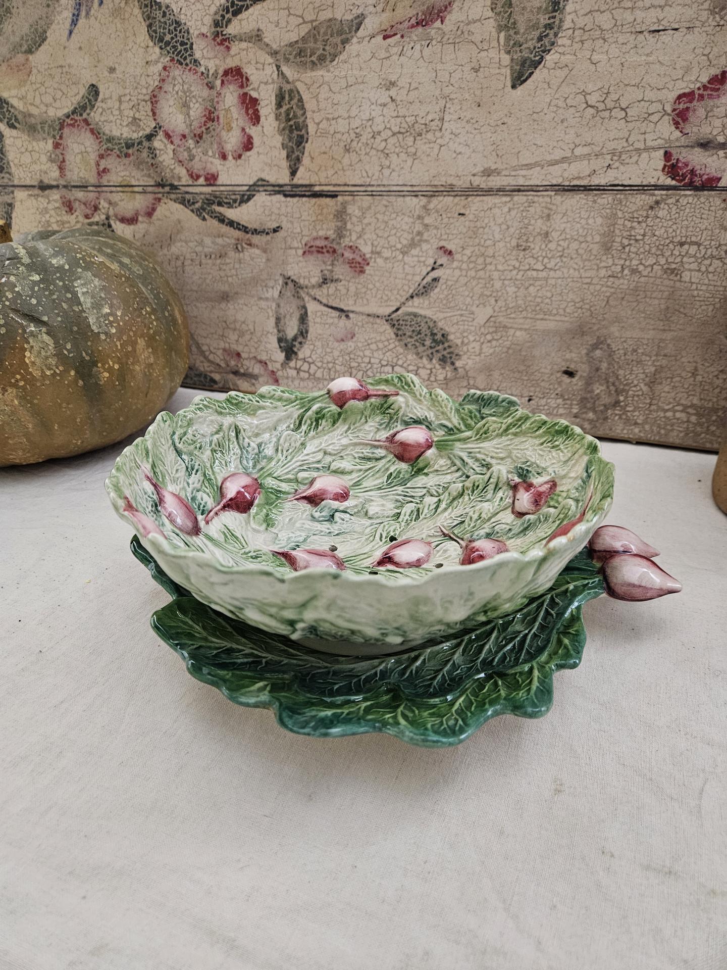 Plat et égouttoir en barbotine au décor végétal et radis. Hauteur 10 cm - Diamètre 30 cm.