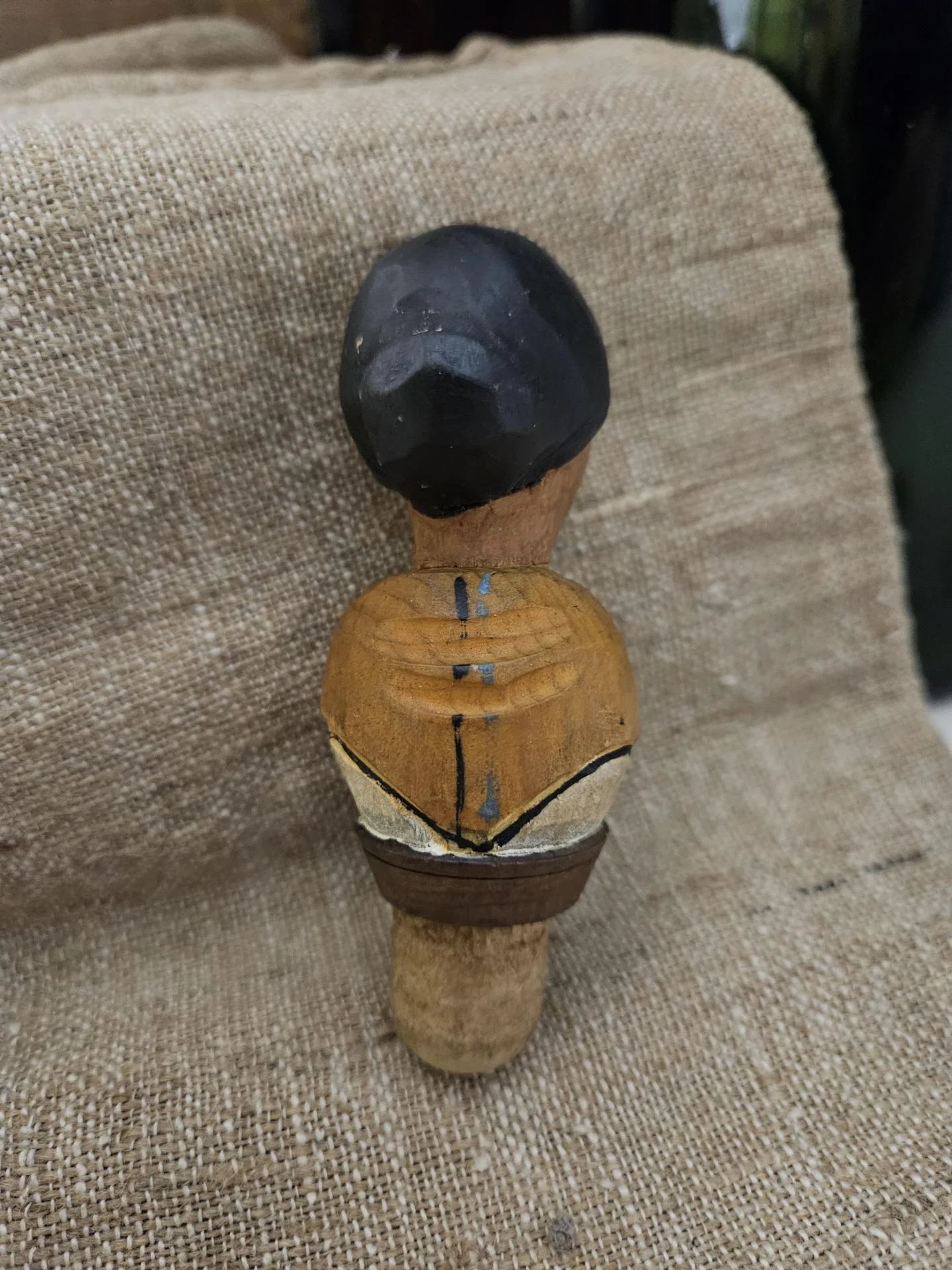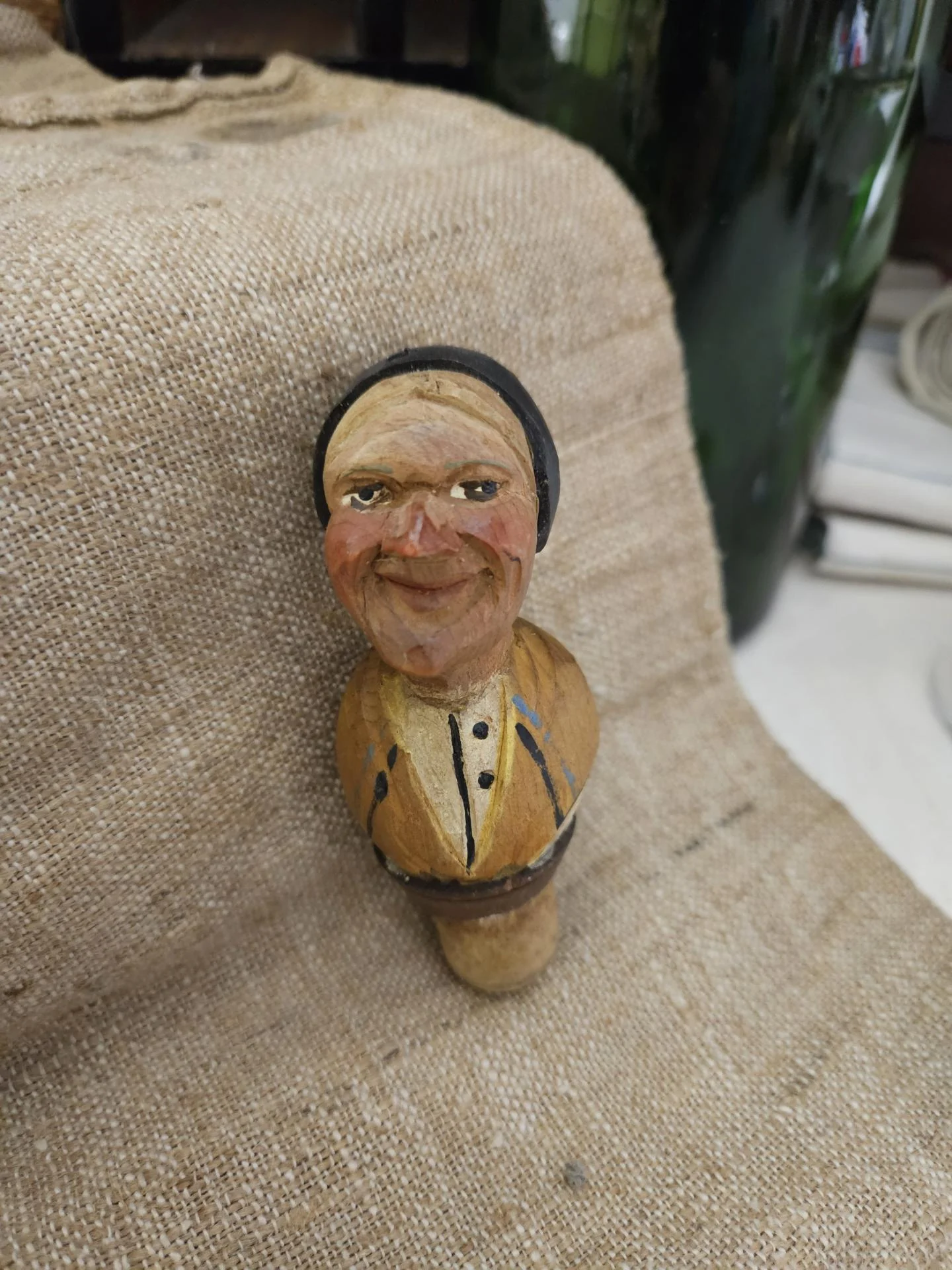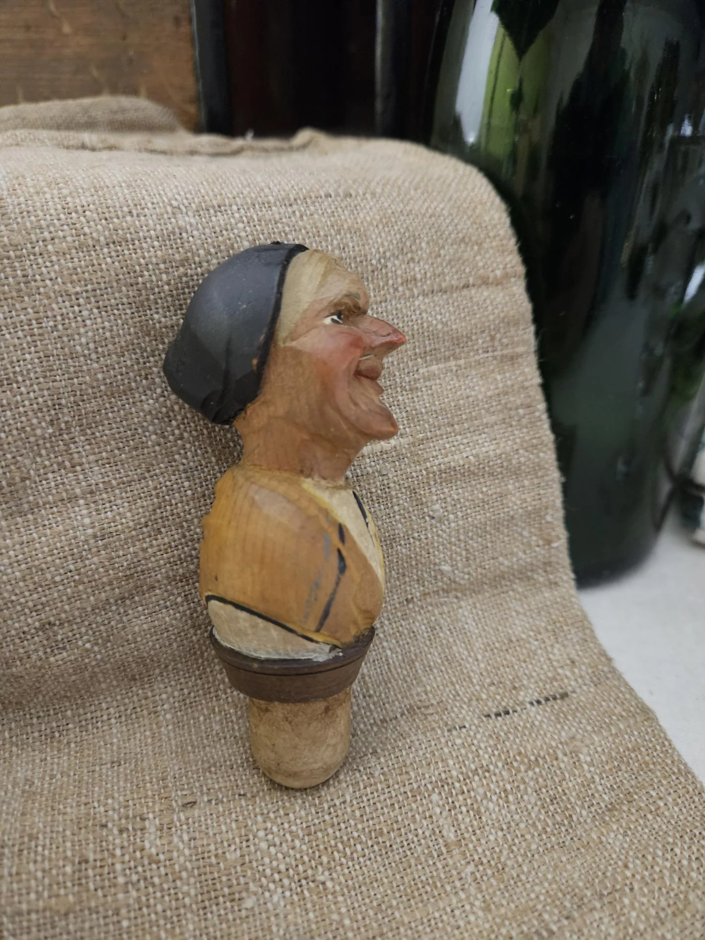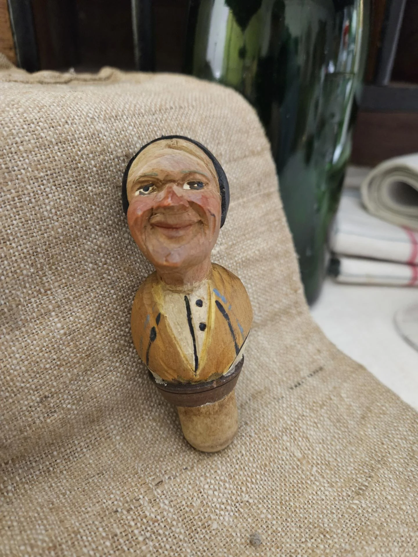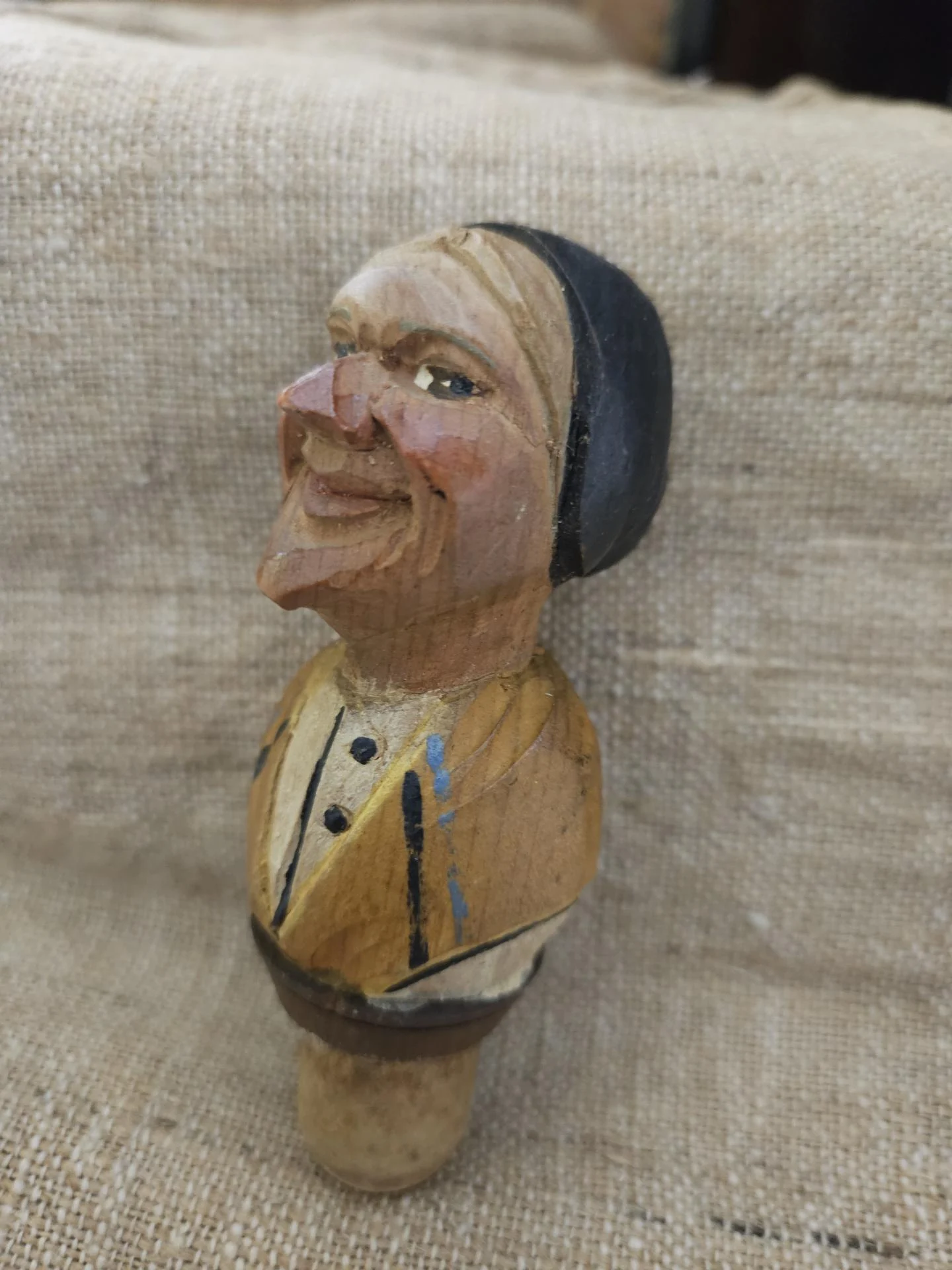 Bouchon en bois sculpté peint. Bouchon de bouteille en bel état avec une belle patine et de belles couleurs. Hauteur 10 cm.