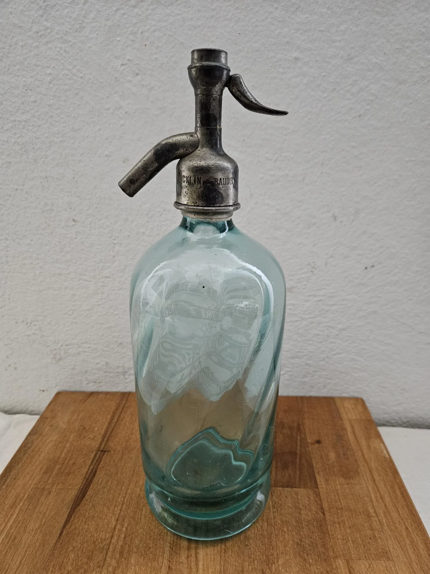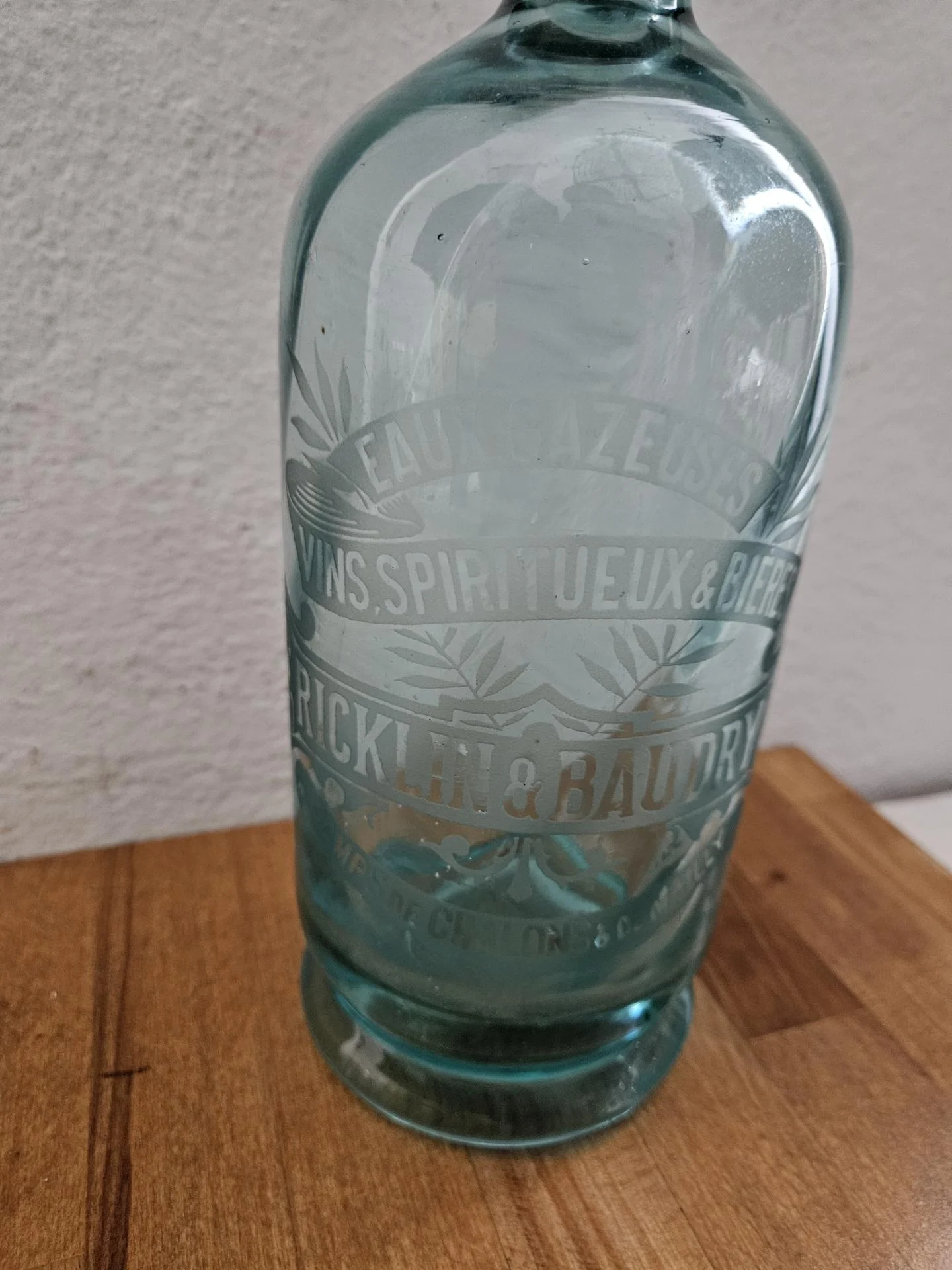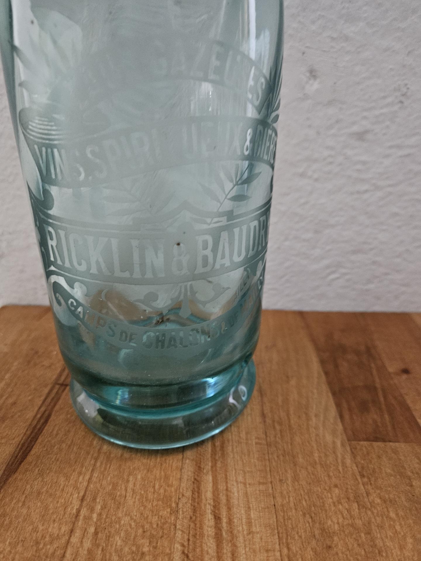 Ancien siphon à eau de Seltz Siphon en verre bleu, intérieur cannelé. Inscriptions gravées à l'acide sur le corps de bouteille : Eaux Gazeuses - Vins Spiritueux & Bières - Ricklin & Baudry - Camps de Châlons et de Mailly. Hauteur 30 cm - Diamètre 9 cm. Superbe en collection et décoration bistrot rétro.