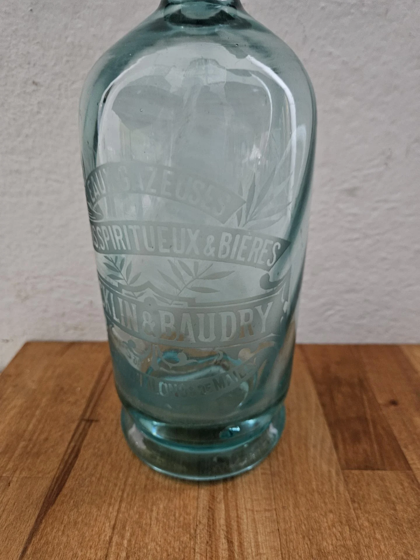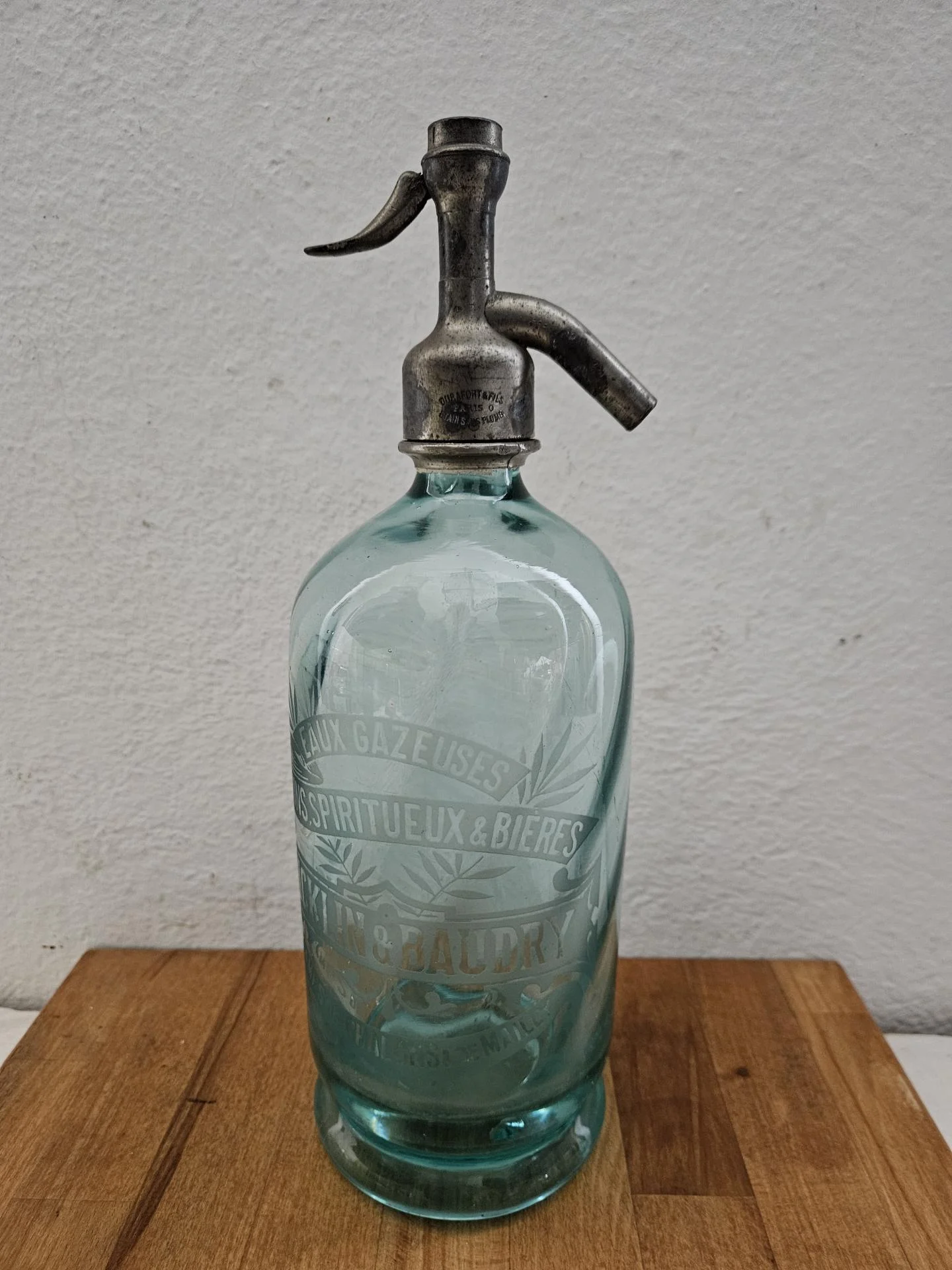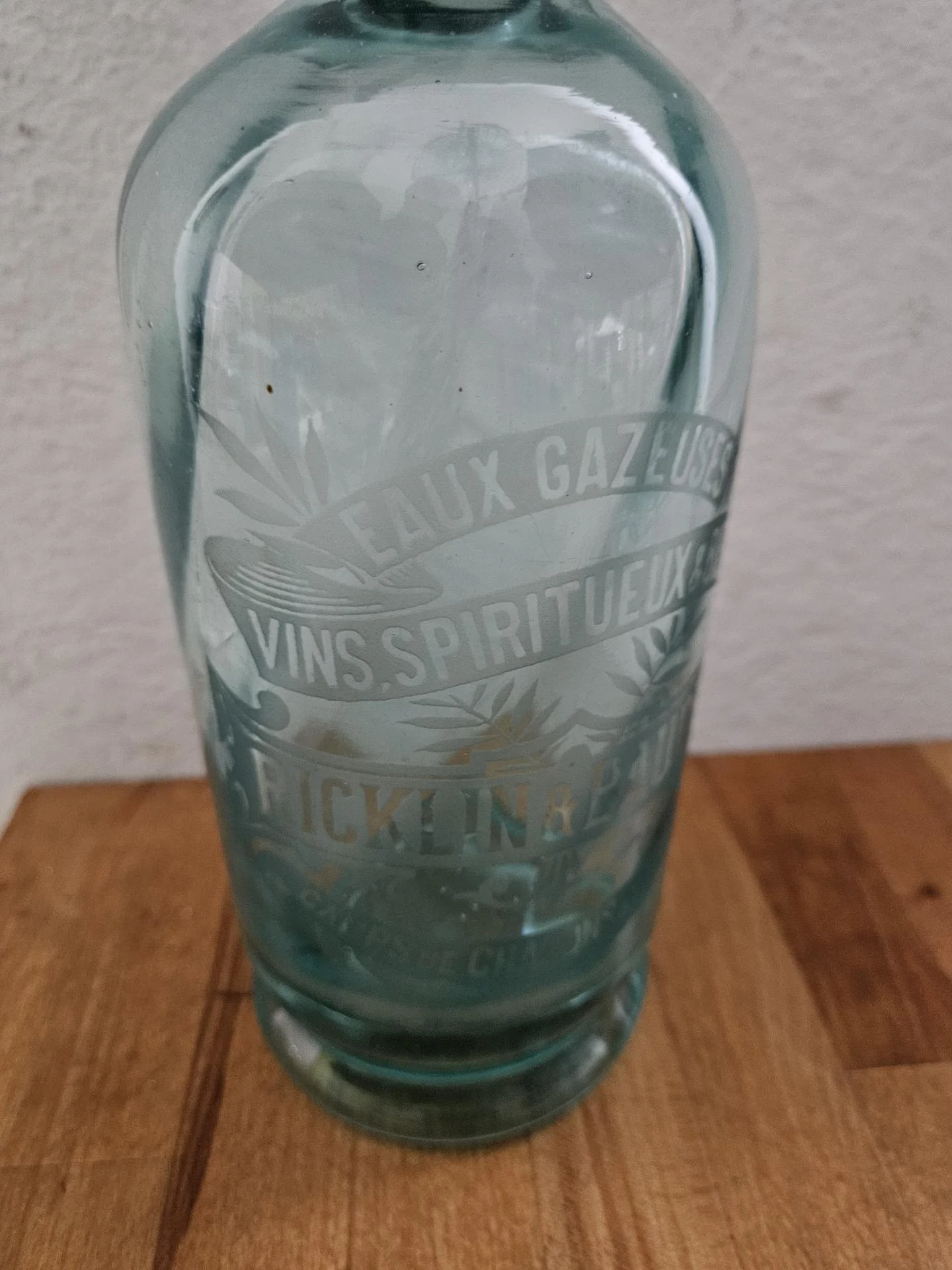 Ancien siphon à eau de Seltz Siphon en verre bleu, intérieur cannelé. Inscriptions gravées à l'acide sur le corps de bouteille : Eaux Gazeuses - Vins Spiritueux & Bières - Ricklin & Baudry - Camps de Châlons et de Mailly. Hauteur 30 cm - Diamètre 9 cm. Superbe en collection et décoration bistrot rétro.