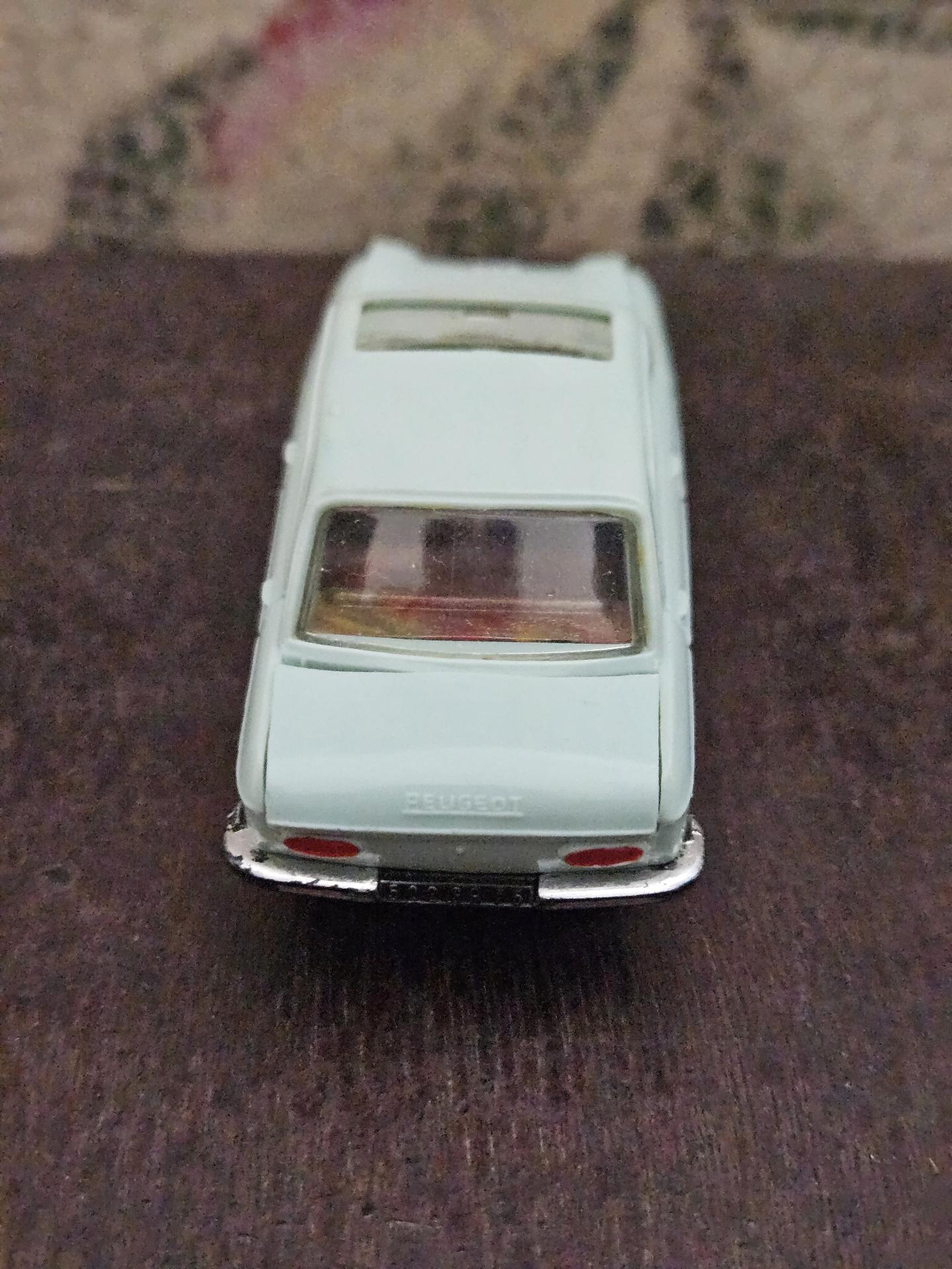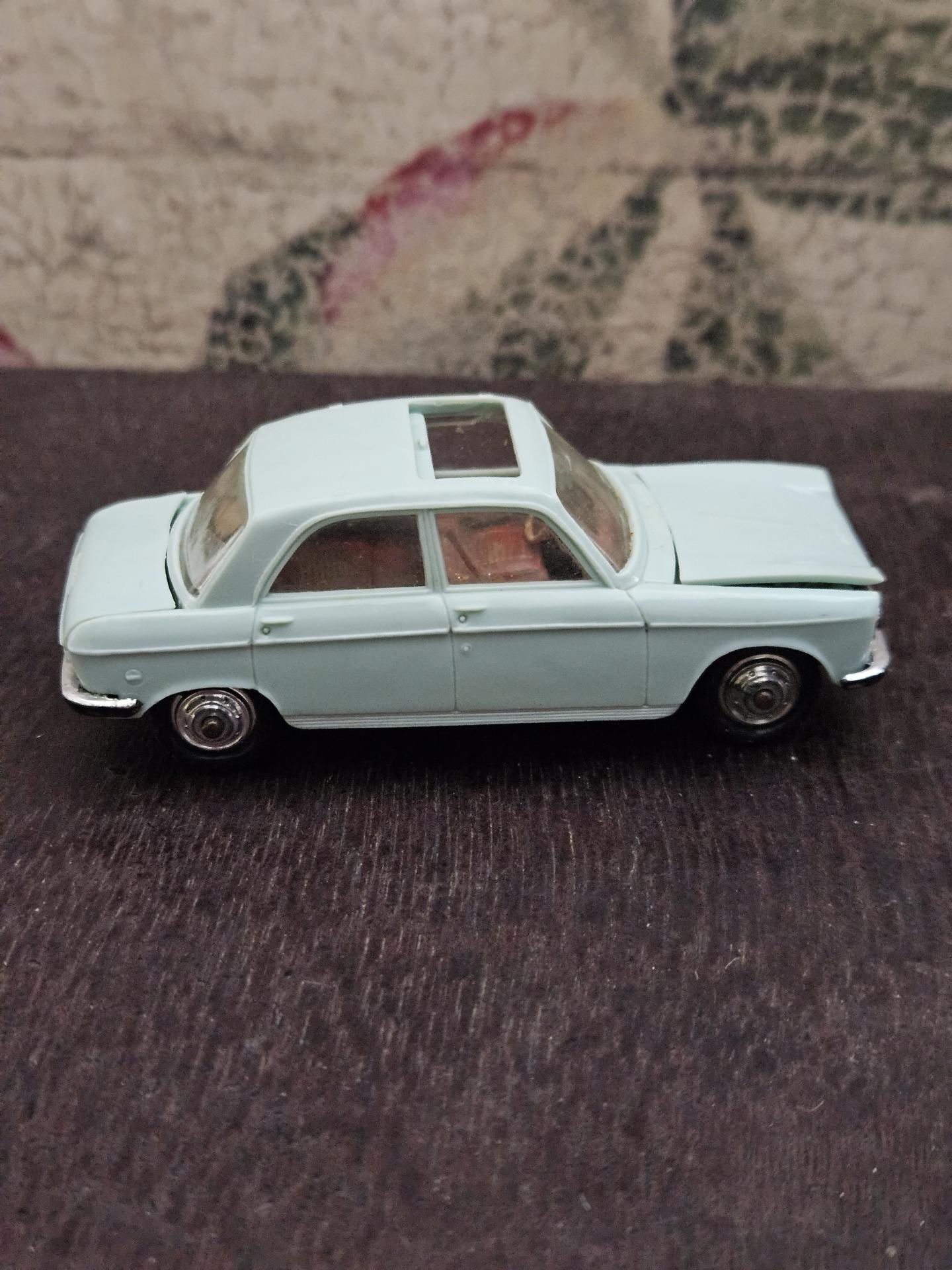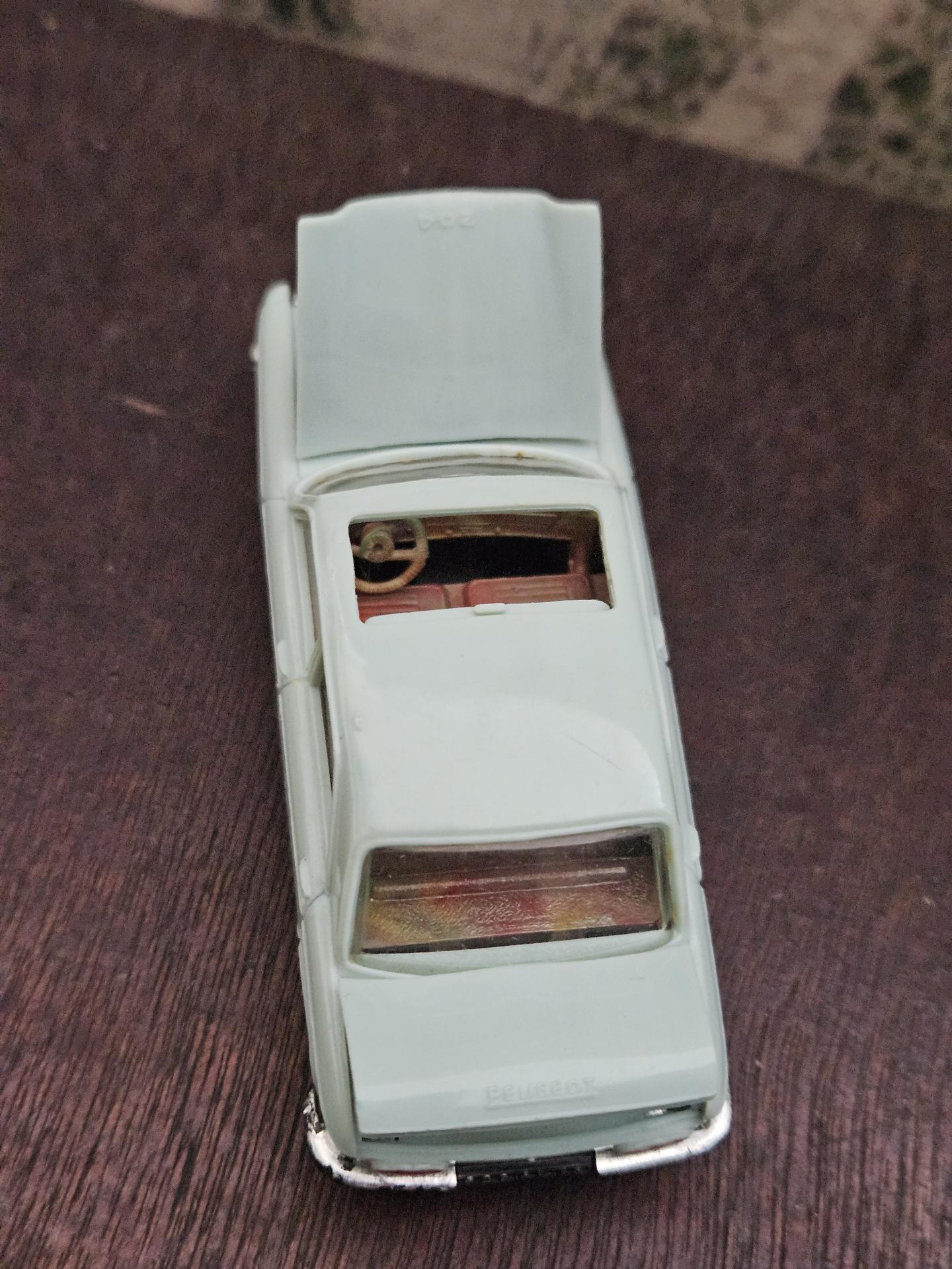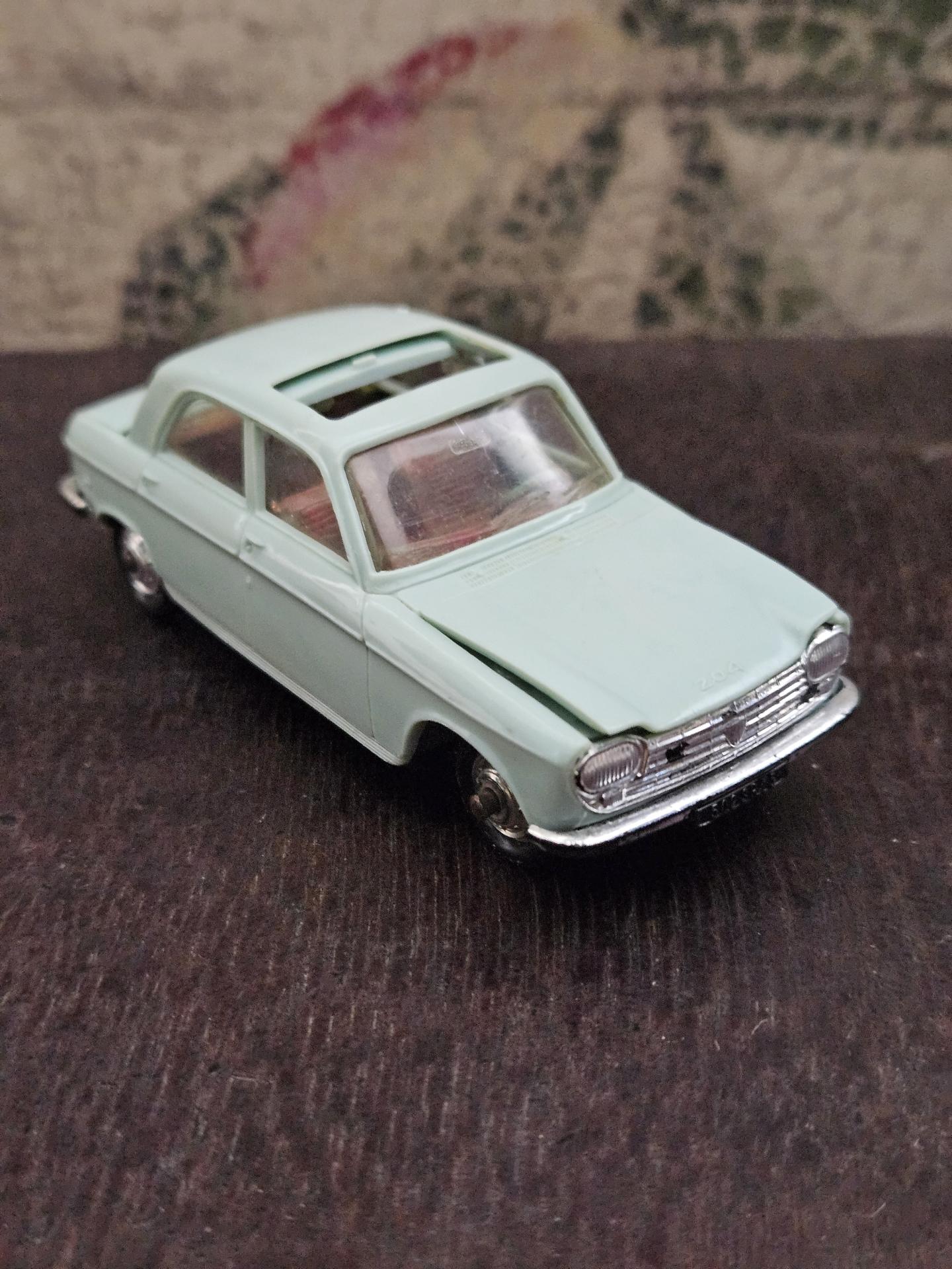 204 Peugeot - Voiture de marque NOREV - Echelle 1/43ème - Couleur bleu ciel - Etat joué. A noter capot et coffre déformé. Le toit ouvrant sorti d'un rail et marque de feutre rouge.