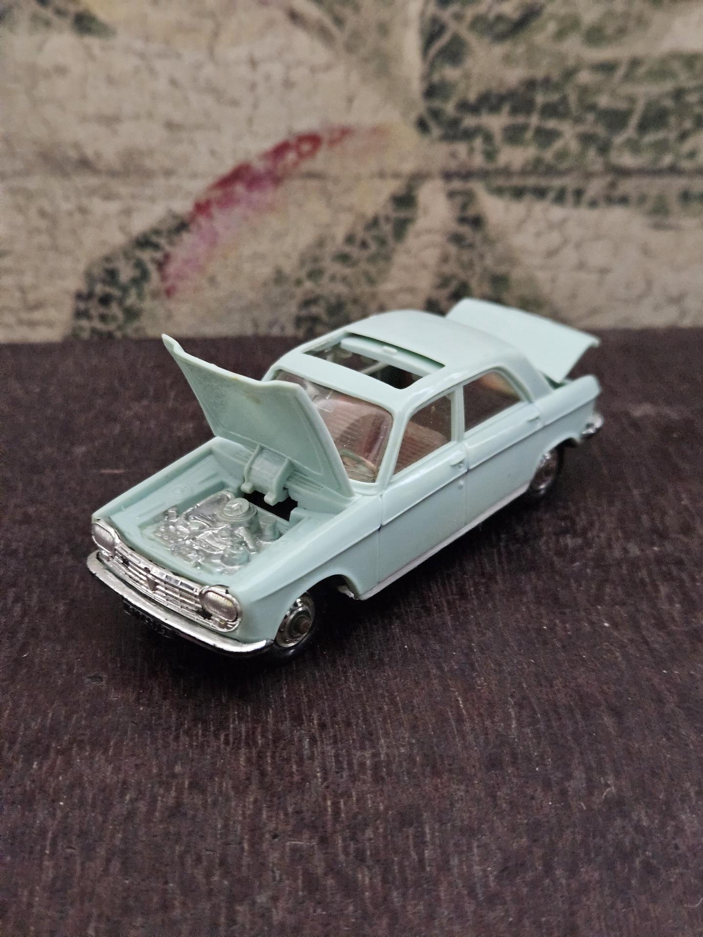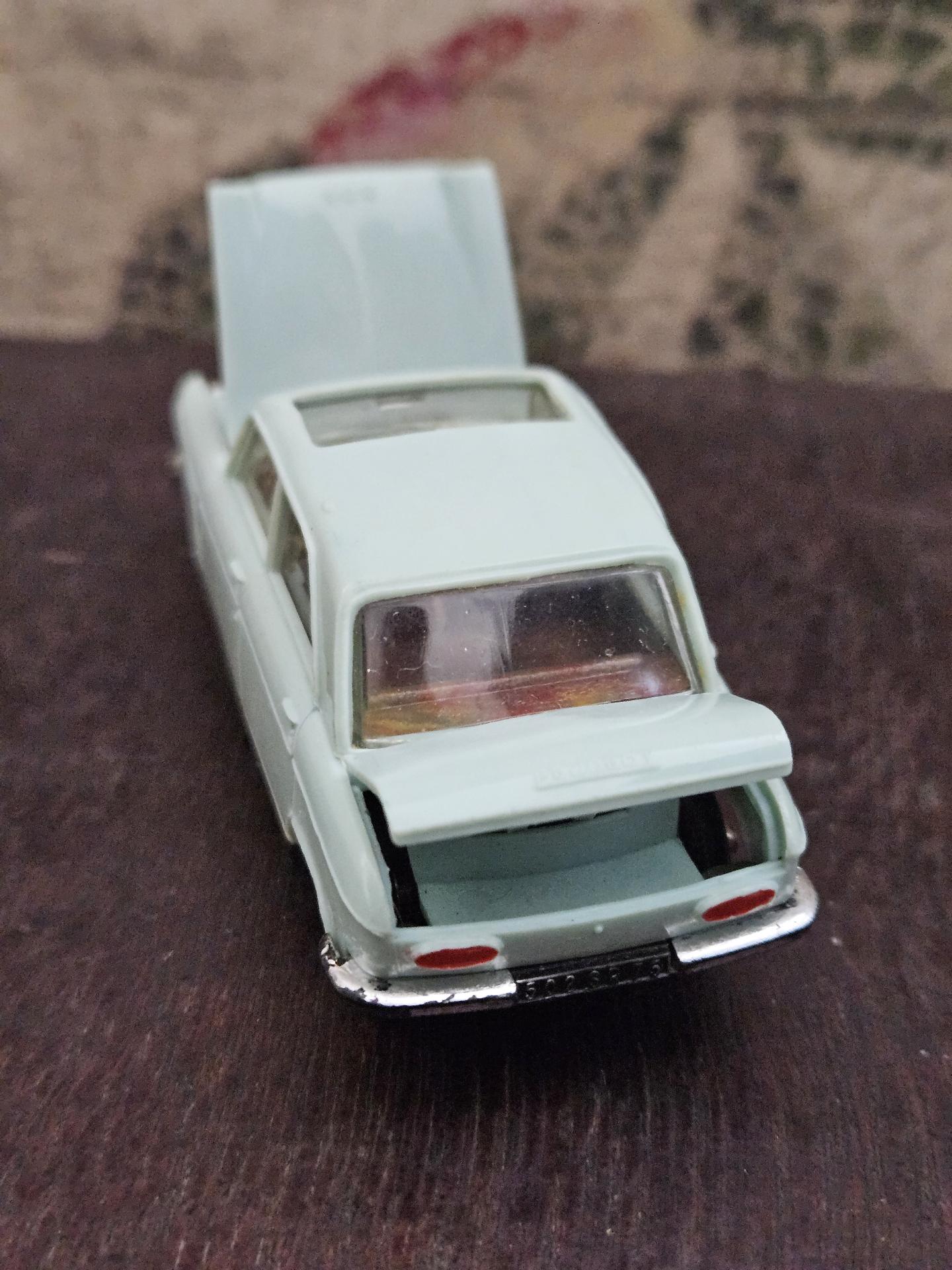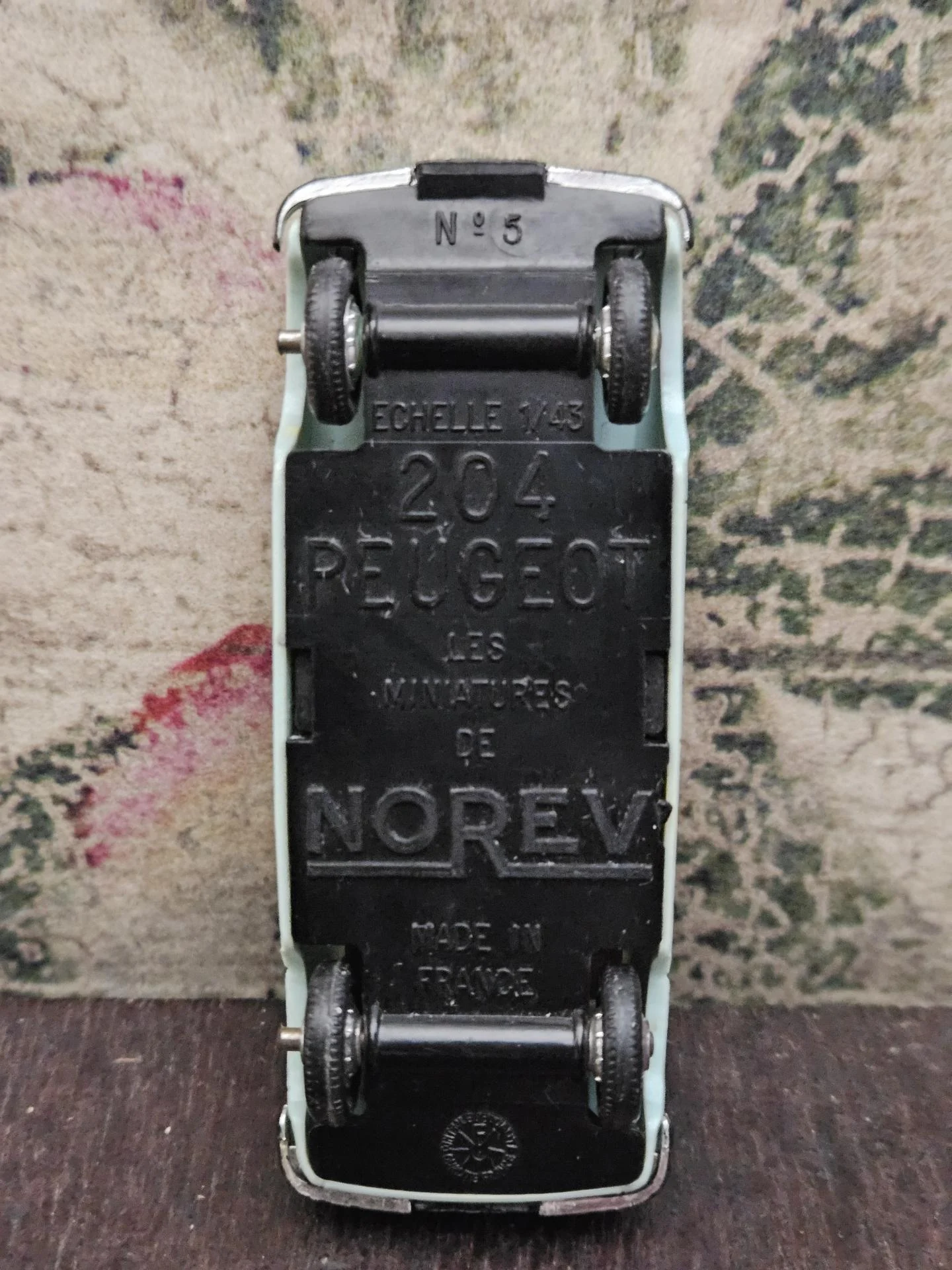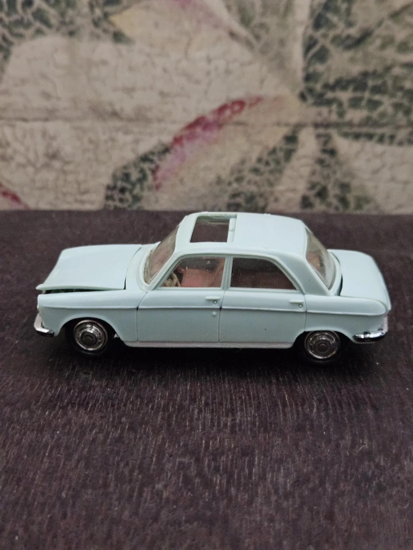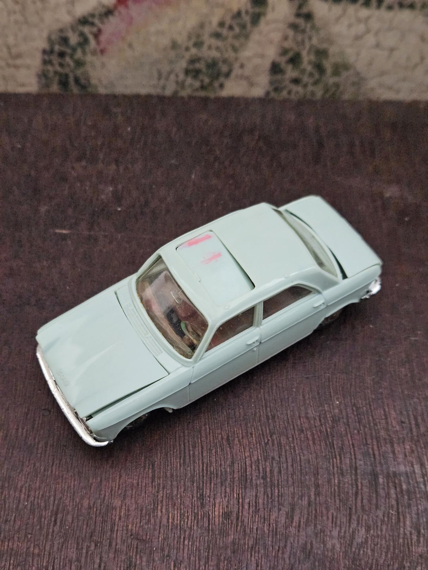 204 Peugeot - Voiture de marque NOREV - Echelle 1/43ème - Couleur bleu ciel - Etat joué. A noter capot et coffre déformé. Le toit ouvrant sorti d'un rail et marque de feutre rouge.