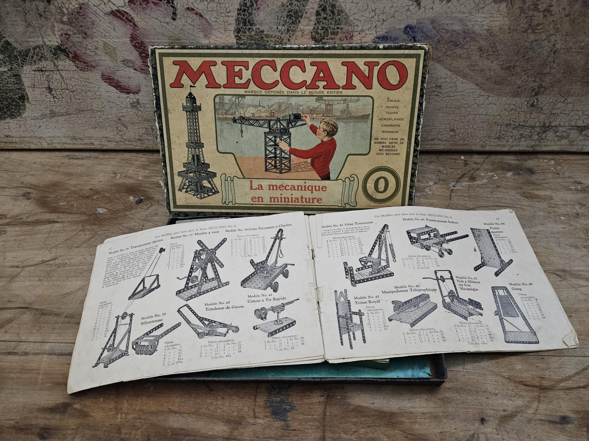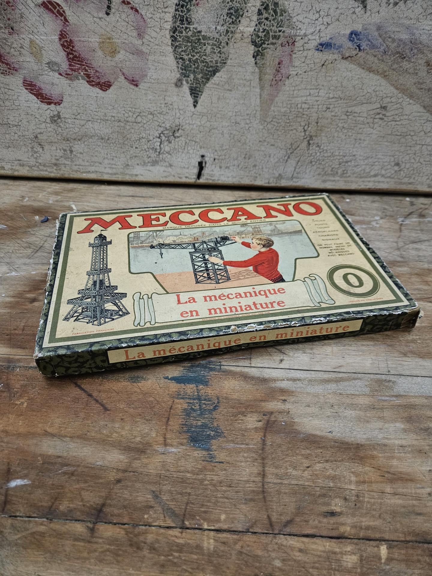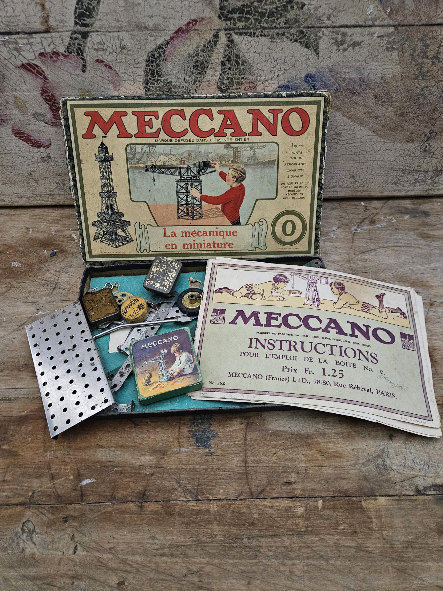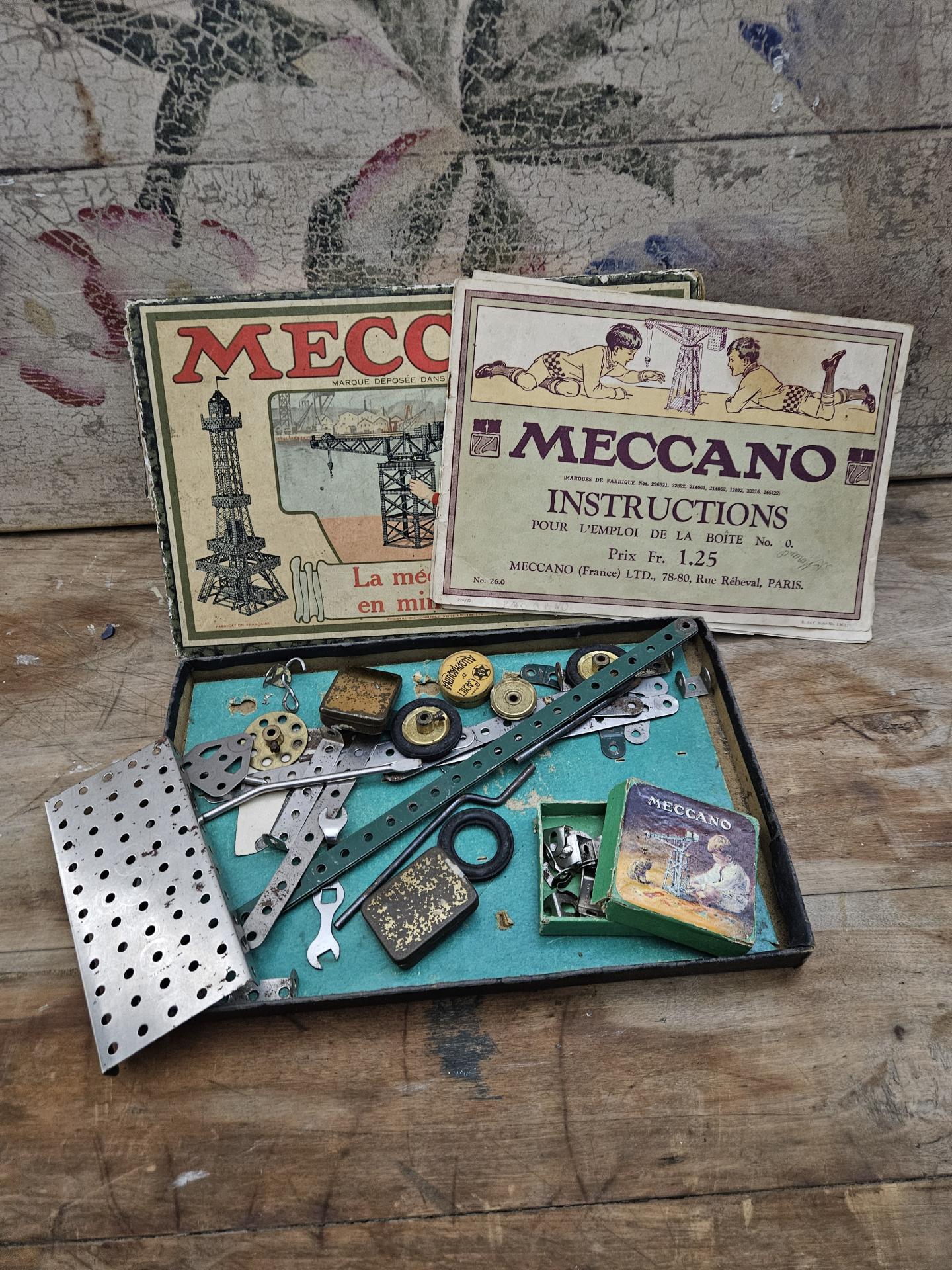 Boite de Meccano n°0. Coffret avec nombreuses pièces : plaques, tiges, roues, engrenages, ... outils et de son livret. Coffret carton des années 20, état joué avec quelques déchirures par endroits. Dimensions 29 cm x 19 cm - Hauteur 2.50 cm