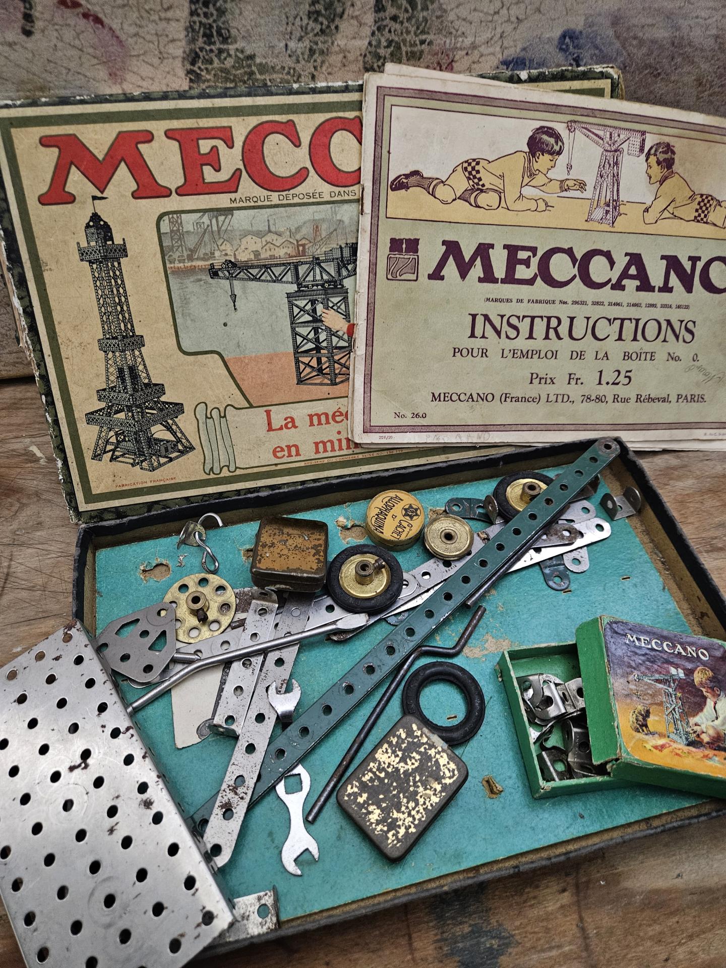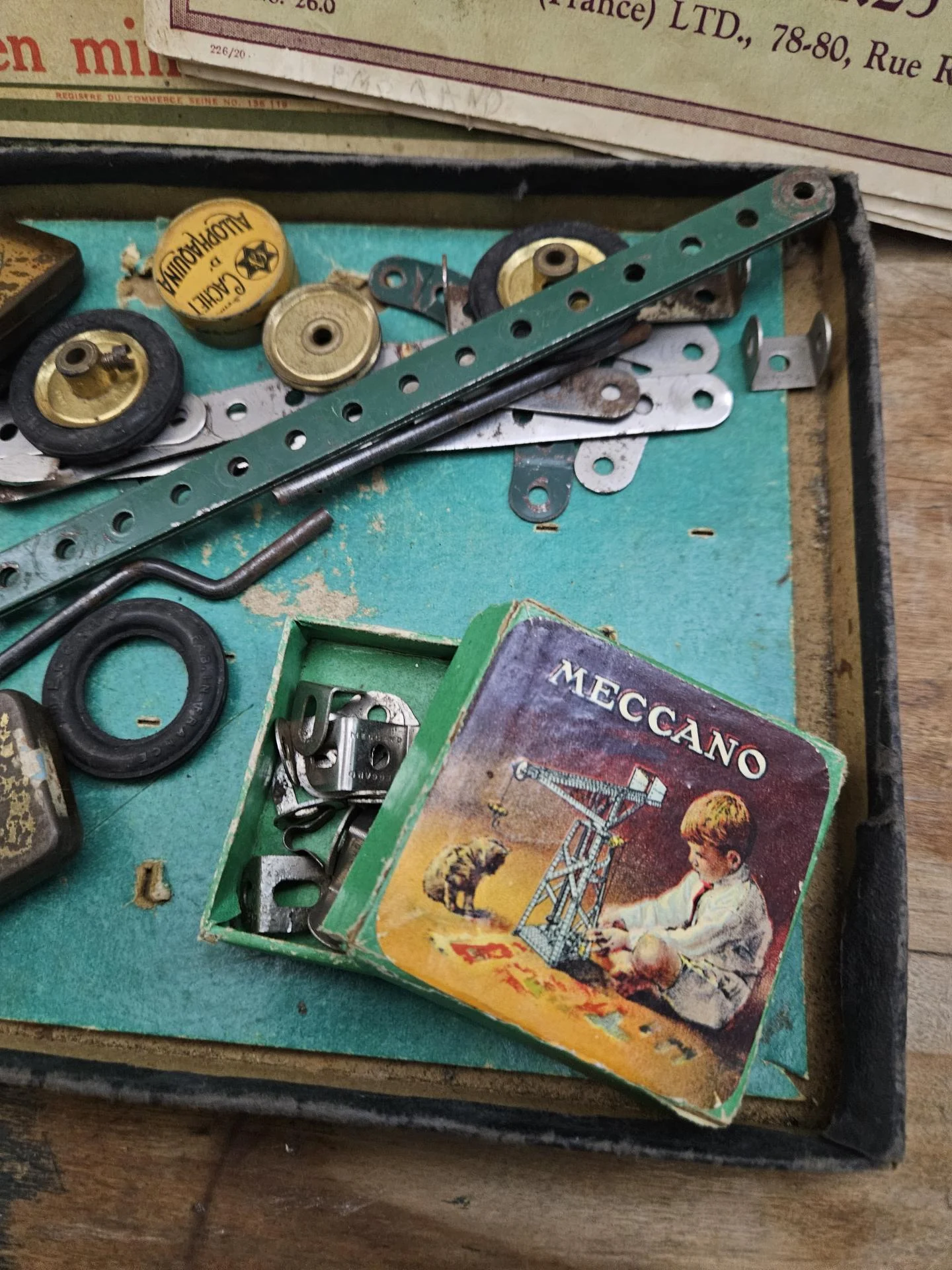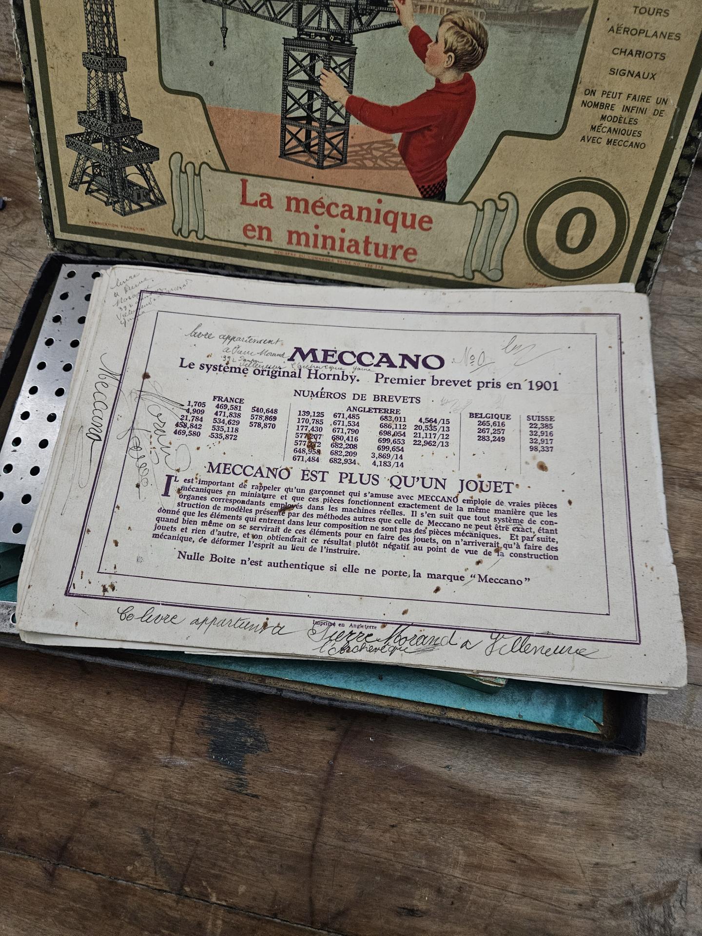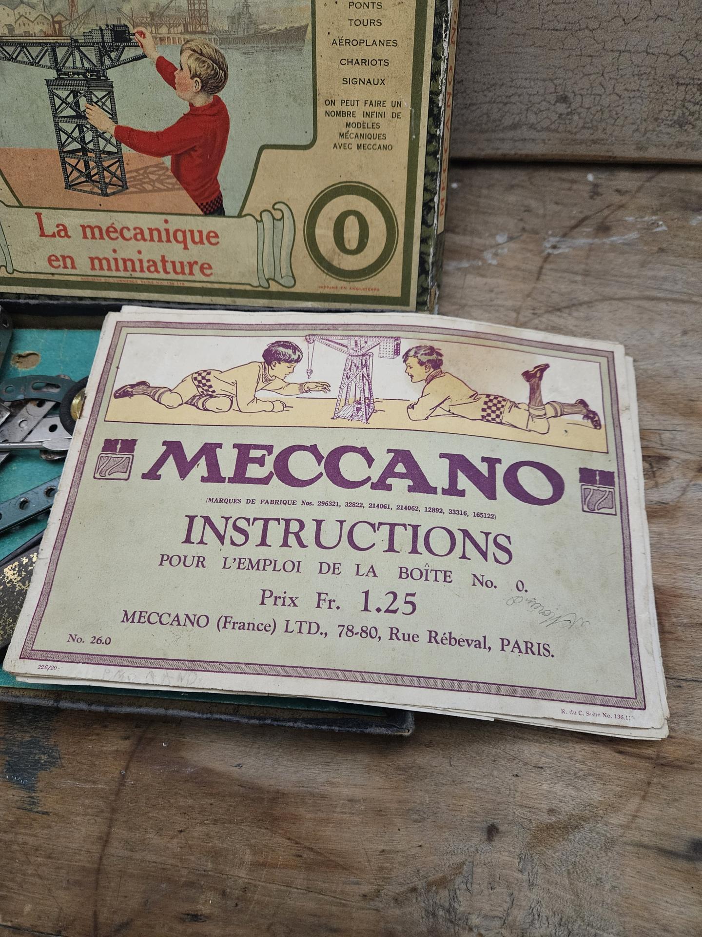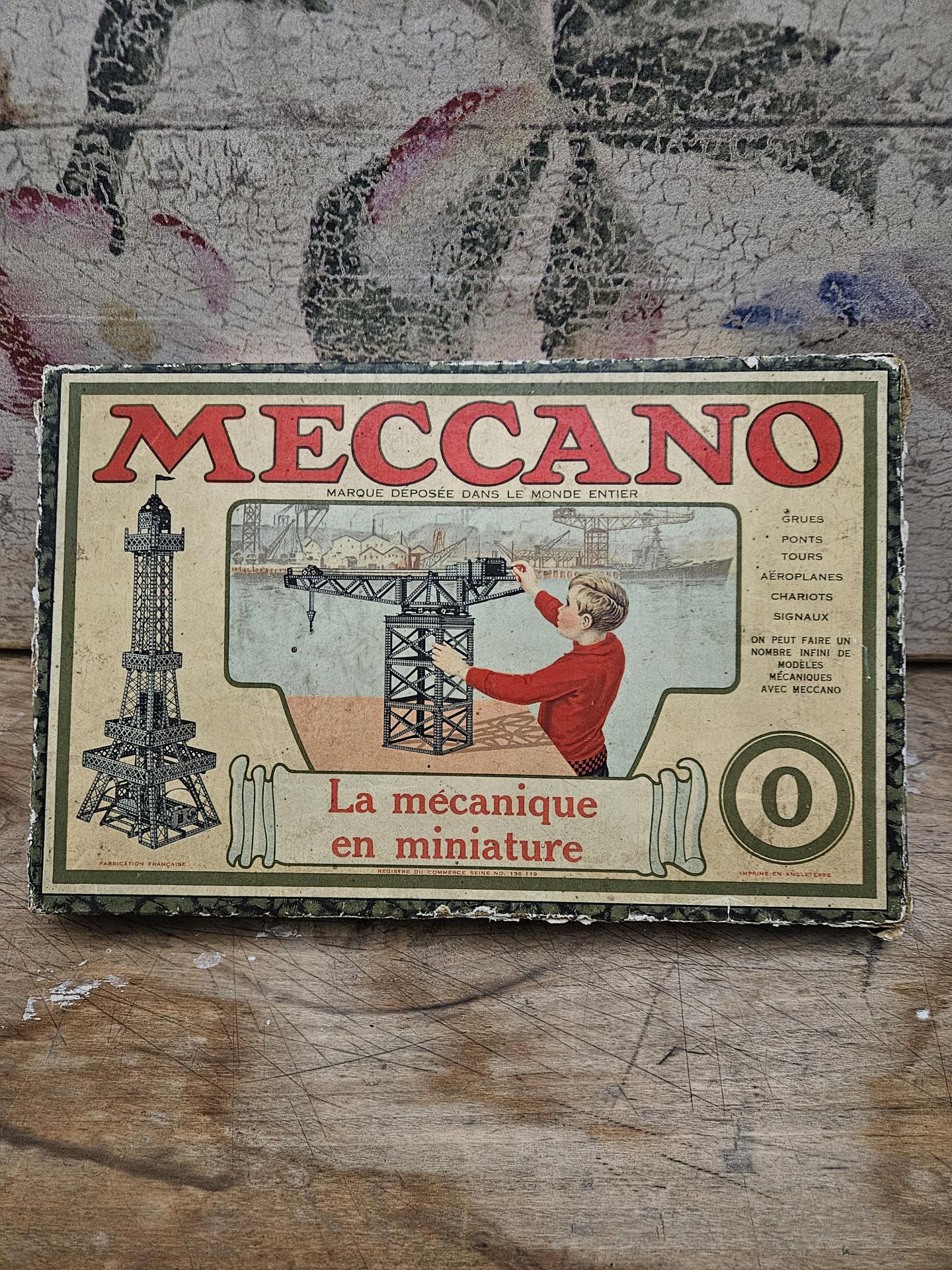Boite de Meccano n°0. Coffret avec nombreuses pièces : plaques, tiges, roues, engrenages, ... outils et de son livret. Coffret carton des années 20, état joué avec quelques déchirures par endroits. Dimensions 29 cm x 19 cm - Hauteur 2.50 cm