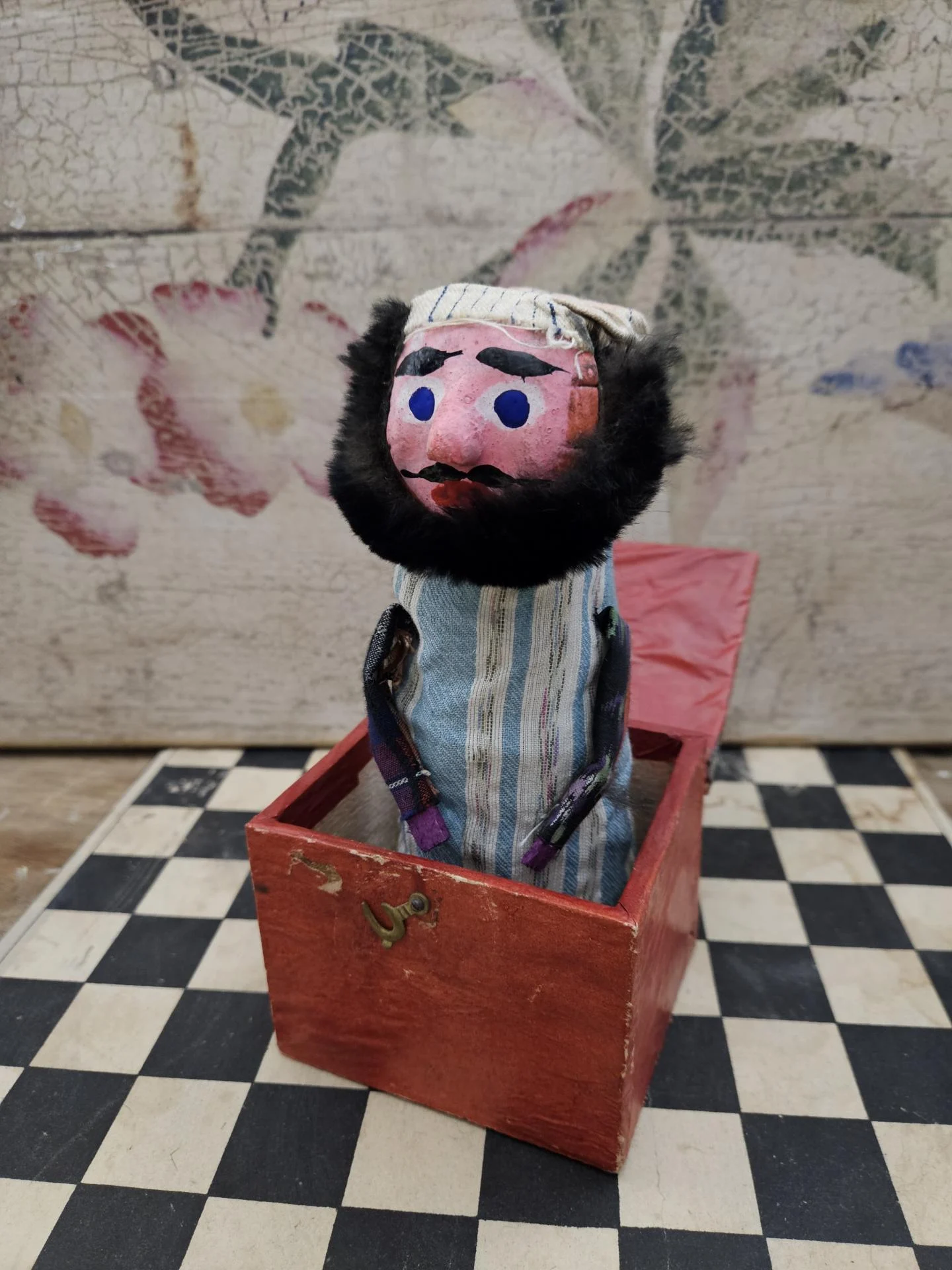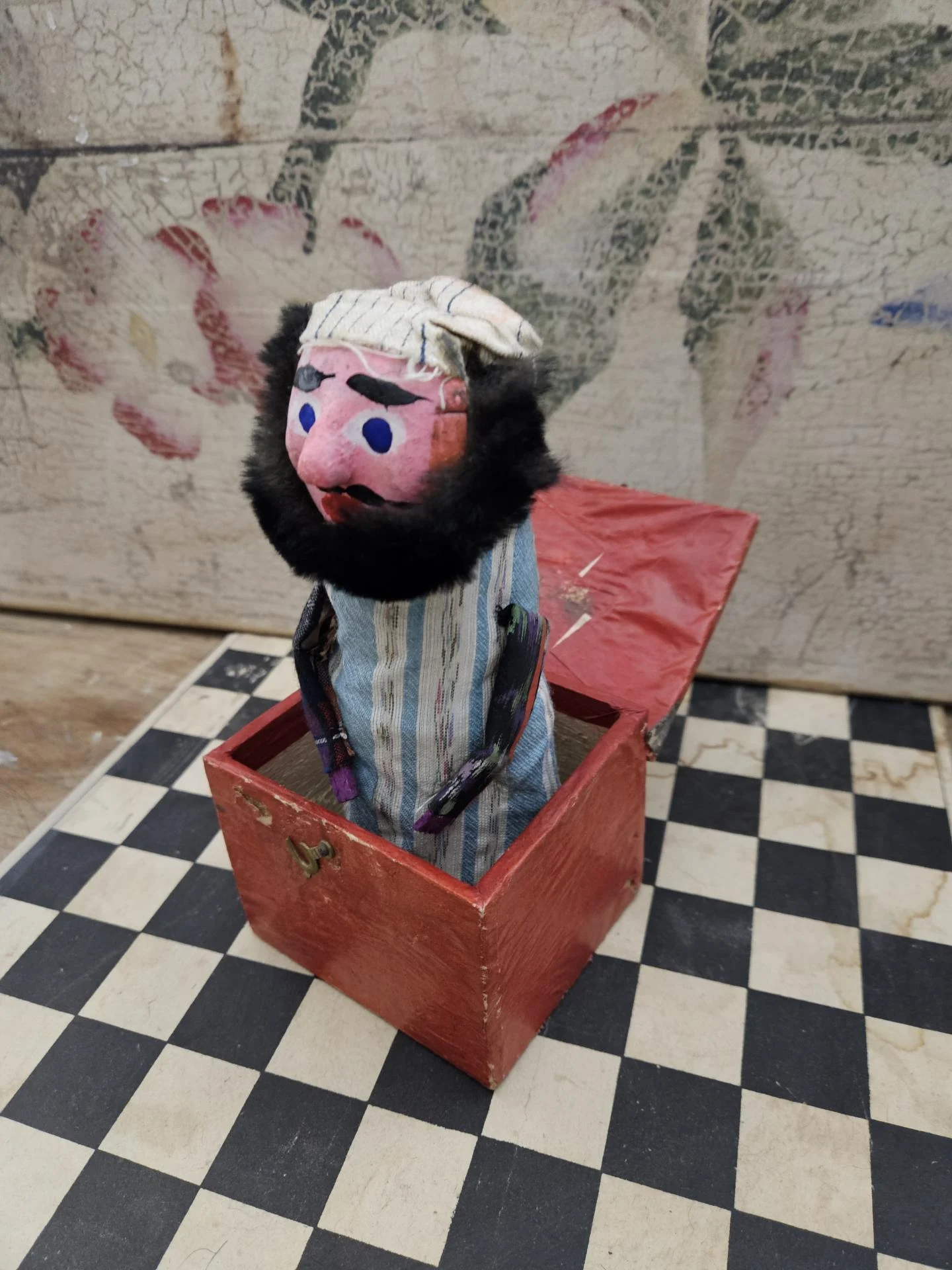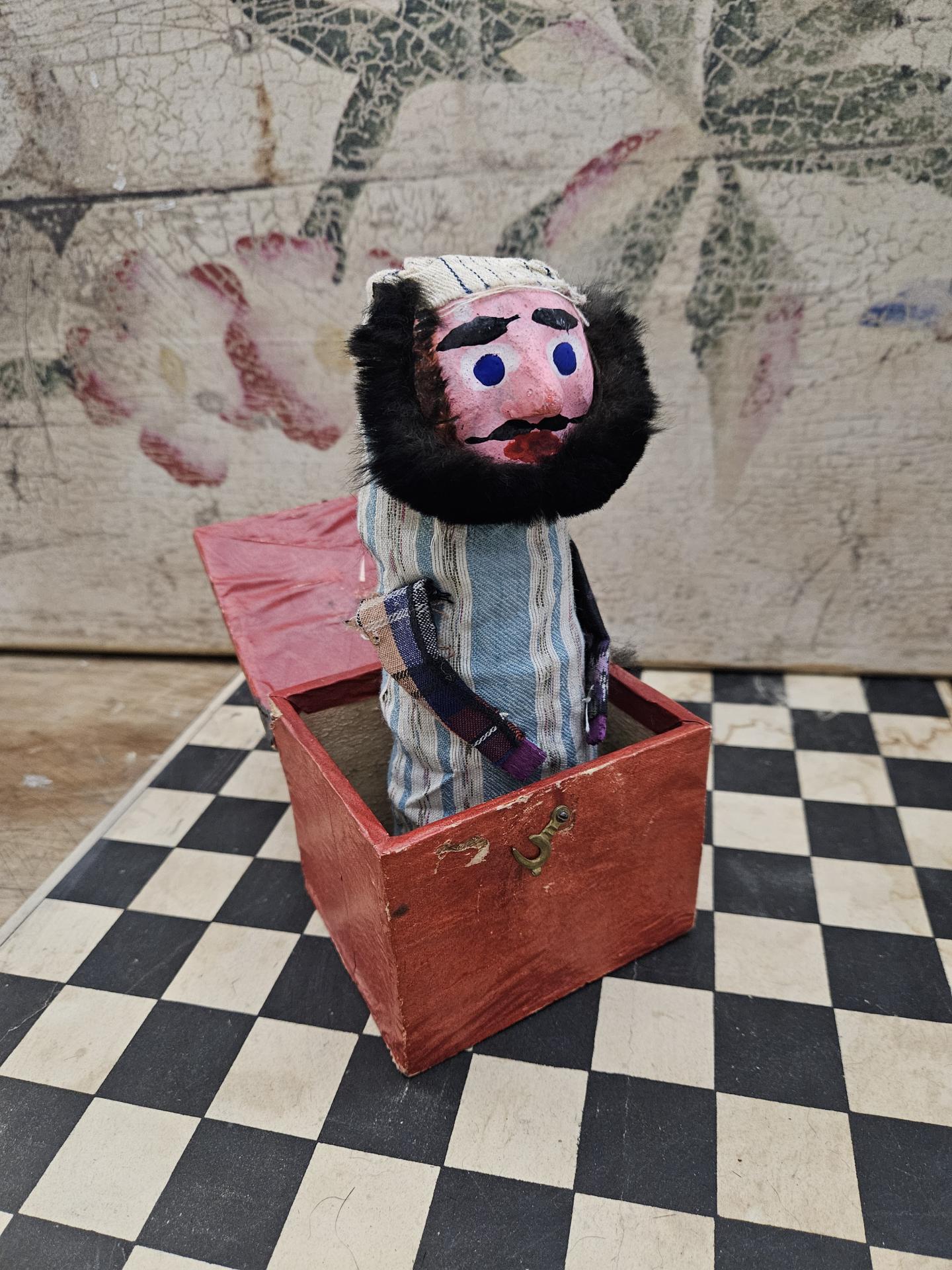 Diable en boîte. Jouet ancien du début du 20ème siècle, avec son diablotin qui jaillit de la boite lorsque l'on ouvre le couvercle. La boite en bois et le zébulon sont en bel état et en parfait état de fonctionnement. La boite mesure 10 cm x 8.50 cm. Hauteurs 8.50 cm et 20 cm.
