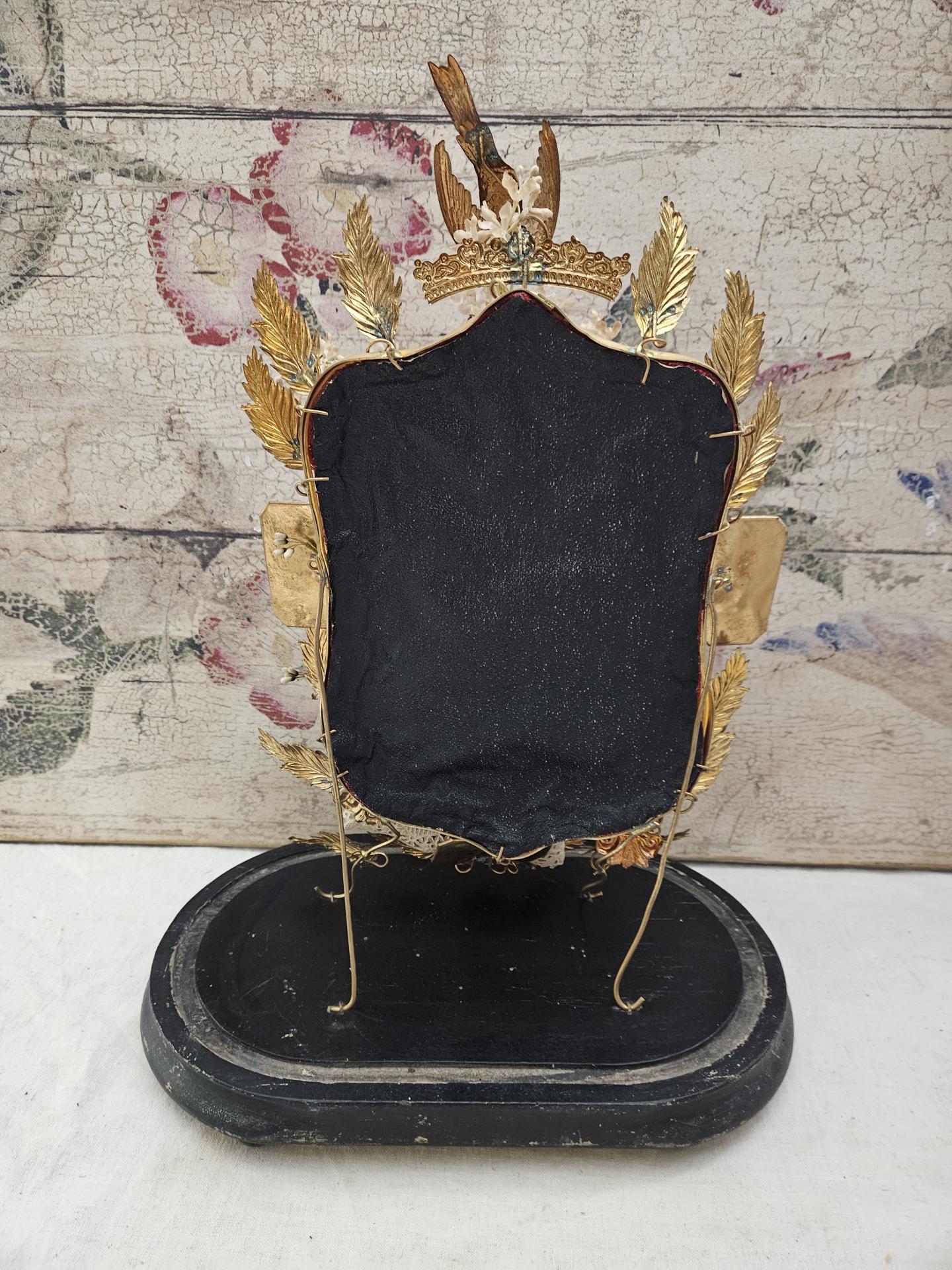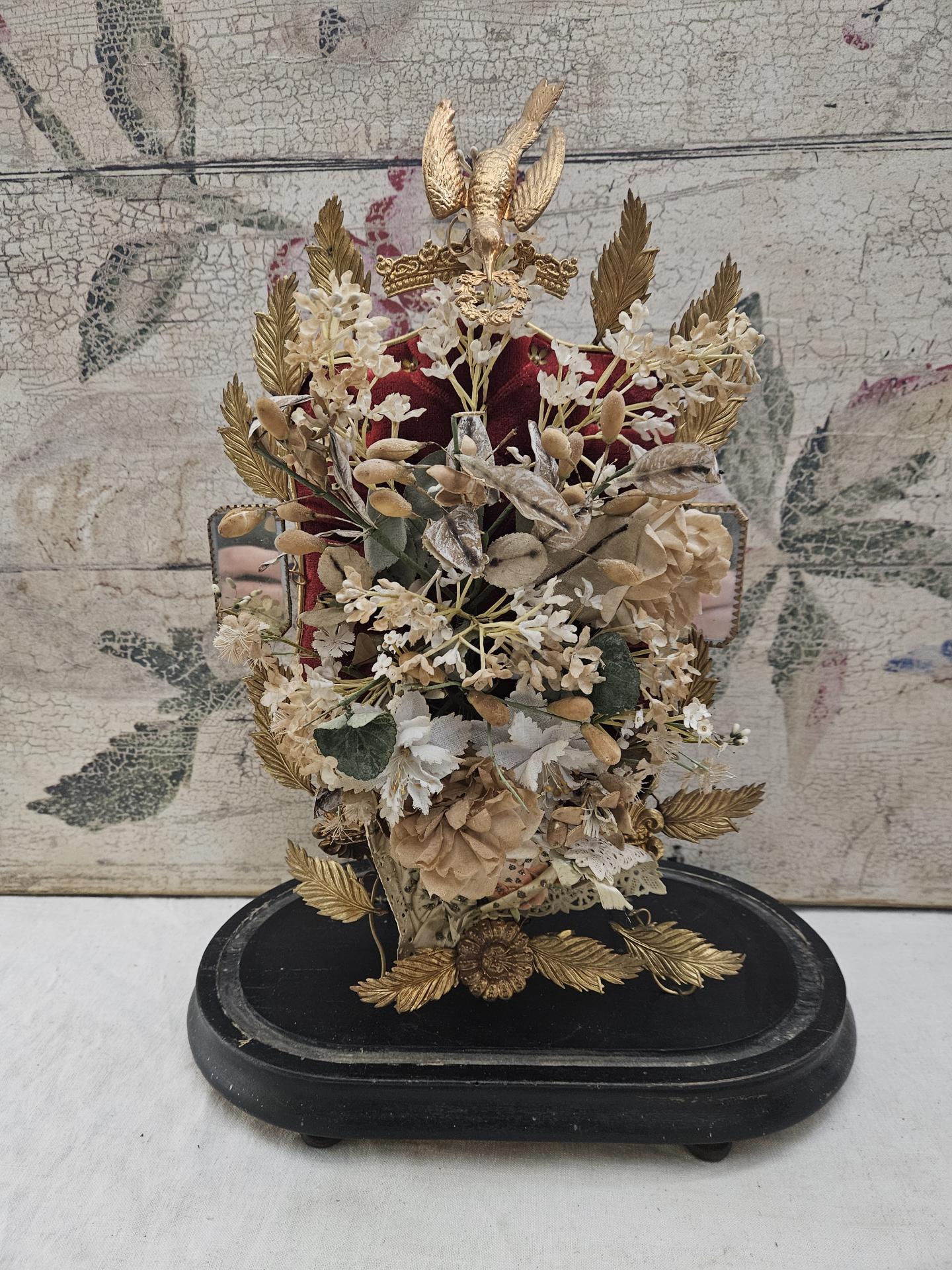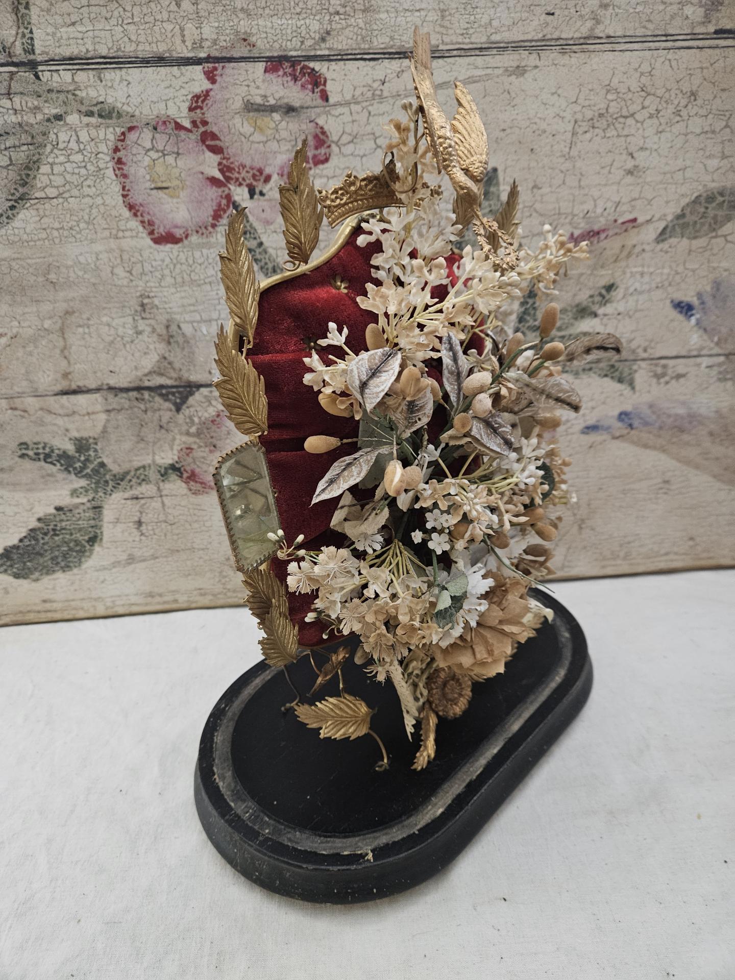 Elégante garniture de globe de mariée Napoléon III, composée de guirlandes de fleurs, de végétaux, de miroirs et d'oiseaux en laiton. Terrasse en bois noirci. Hauteur 43 cm - Longueur 33 cm - Profondeur 20 cm