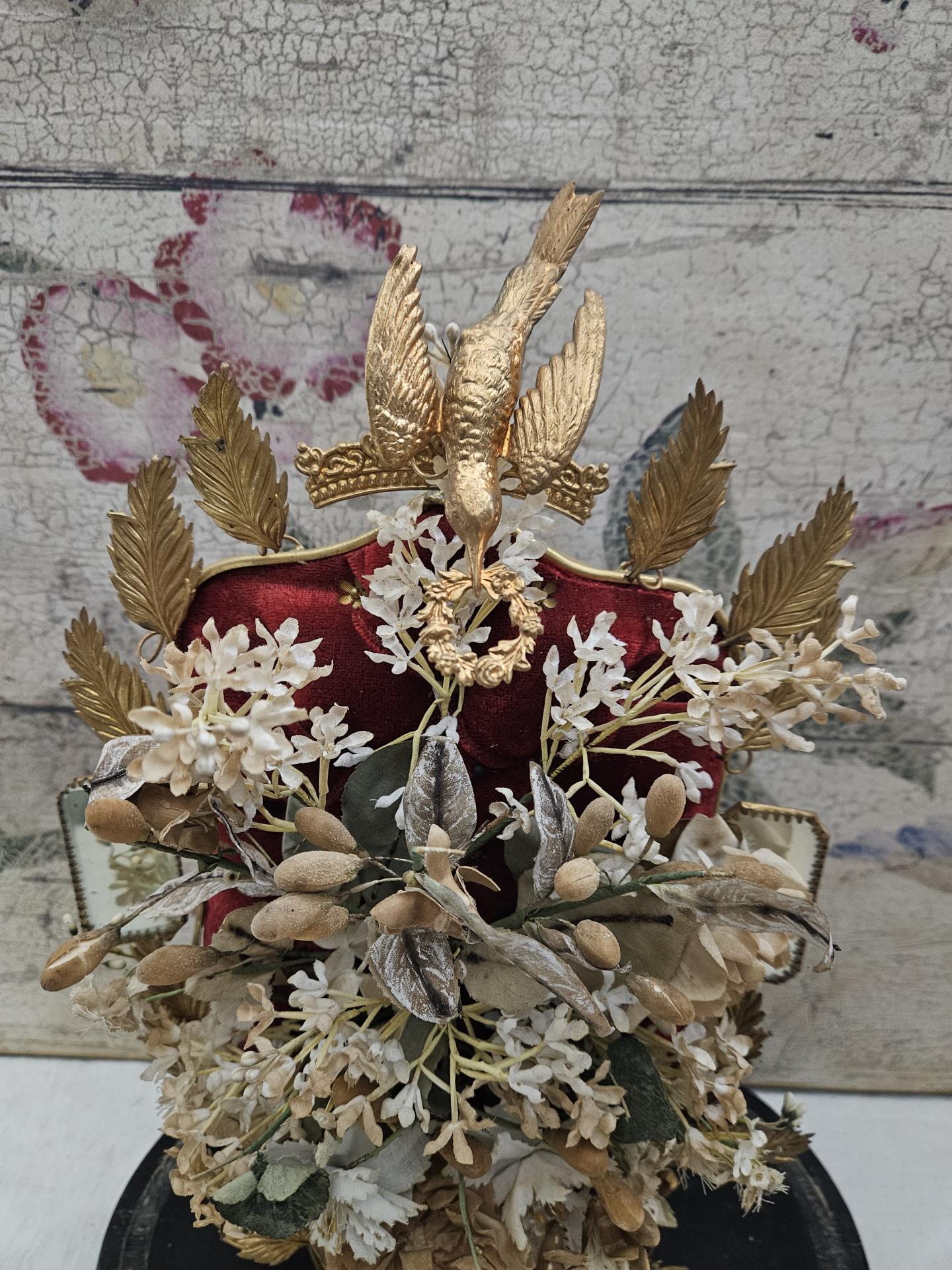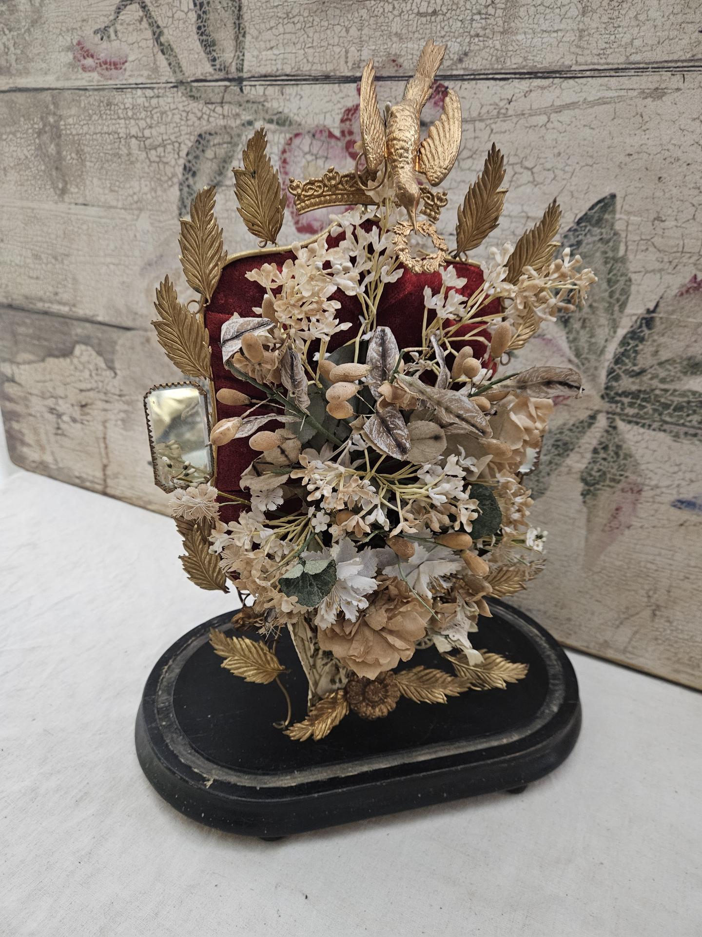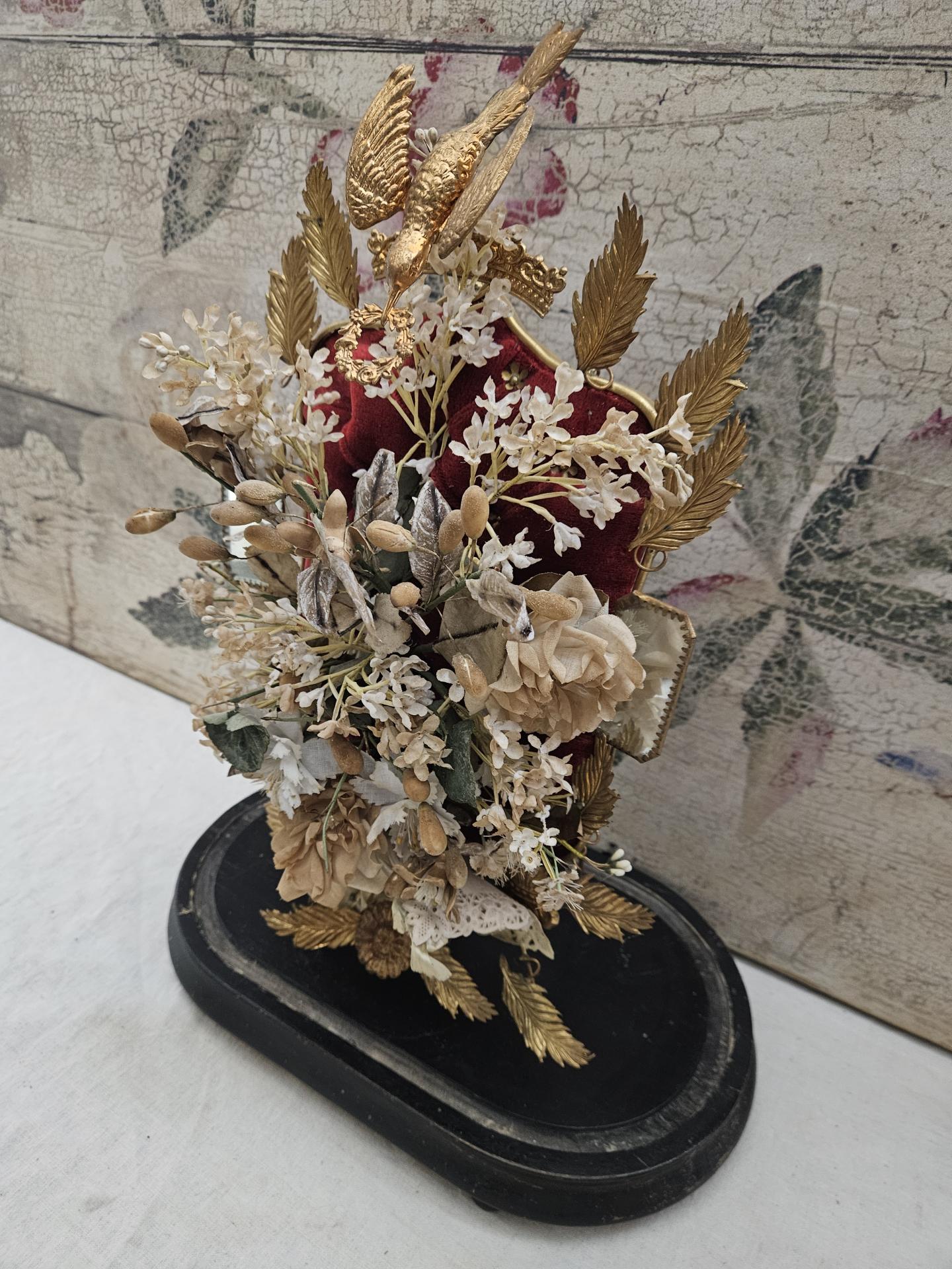 Elégante garniture de globe de mariée Napoléon III, composée de guirlandes de fleurs, de végétaux, de miroirs et d'oiseaux en laiton. Terrasse en bois noirci. Hauteur 43 cm - Longueur 33 cm - Profondeur 20 cm