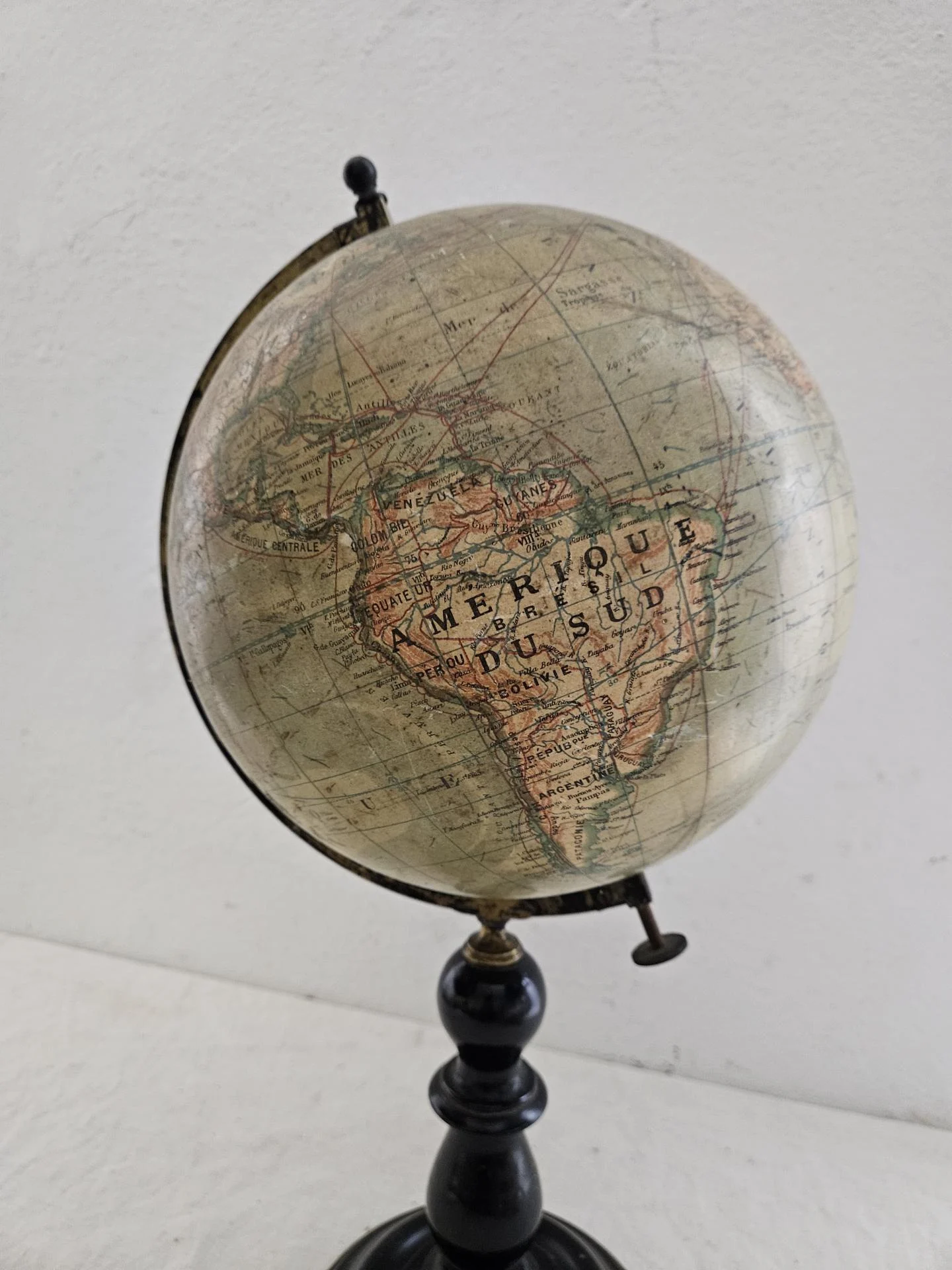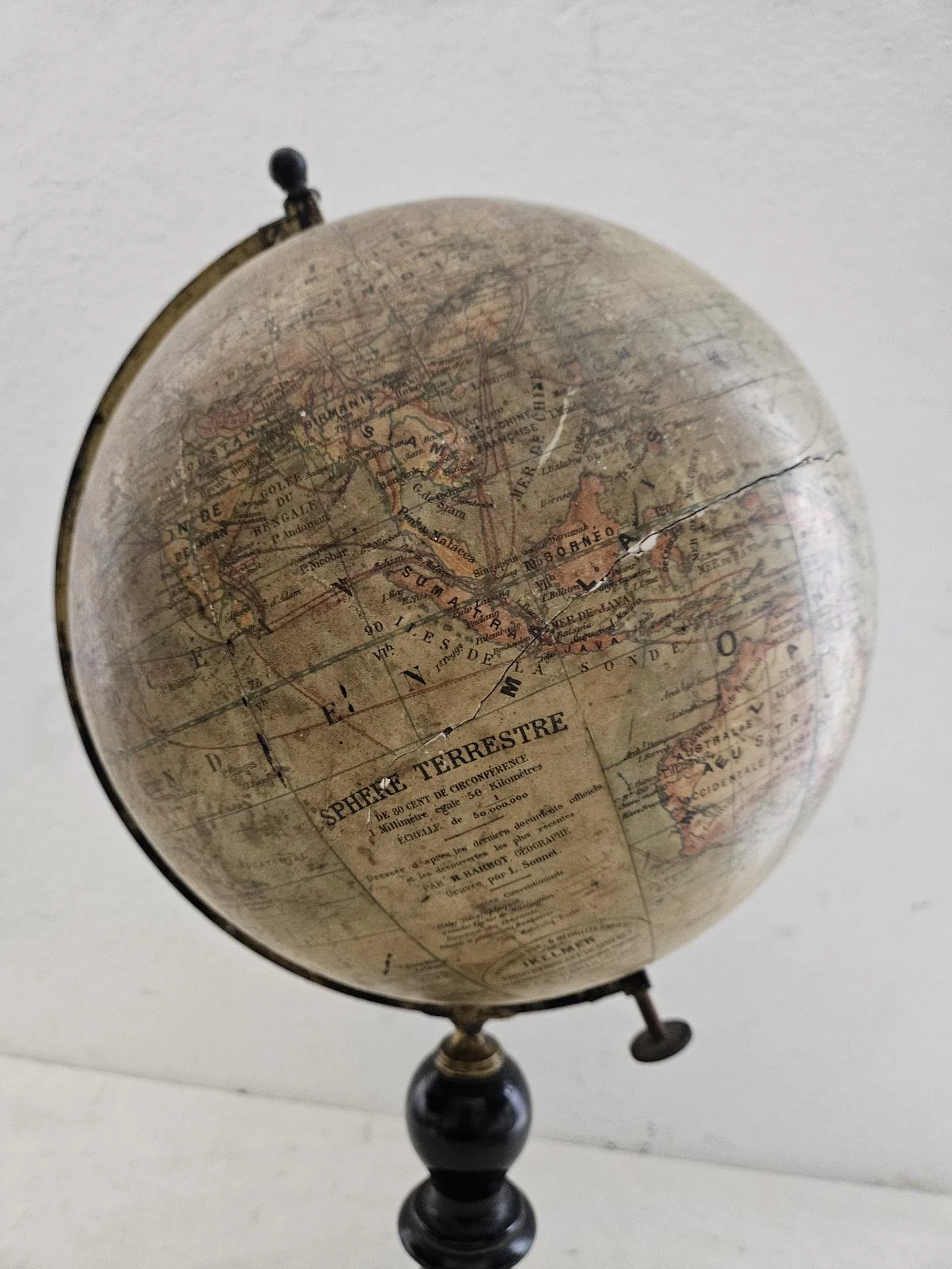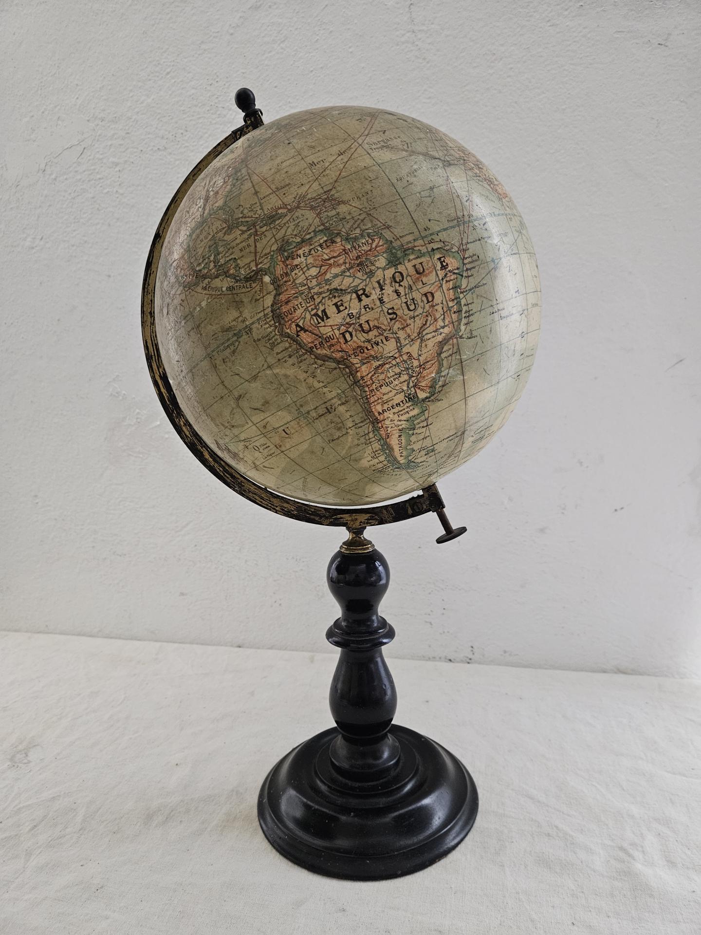 Globe terrestre fin 19ème siècle. Globe Napoléon 3 sur pied en bois noirci de la maison IKELMER Paris éditeur et fabricant de sphères. Carte en papier d'après R. Barbot. A noter traces d'usure par endroits et une fisure sur la sphère (voir photos) Le globe reste solide et se manipule facilement. Hauteur 50 cm, diamètre du globe 24 cm.
