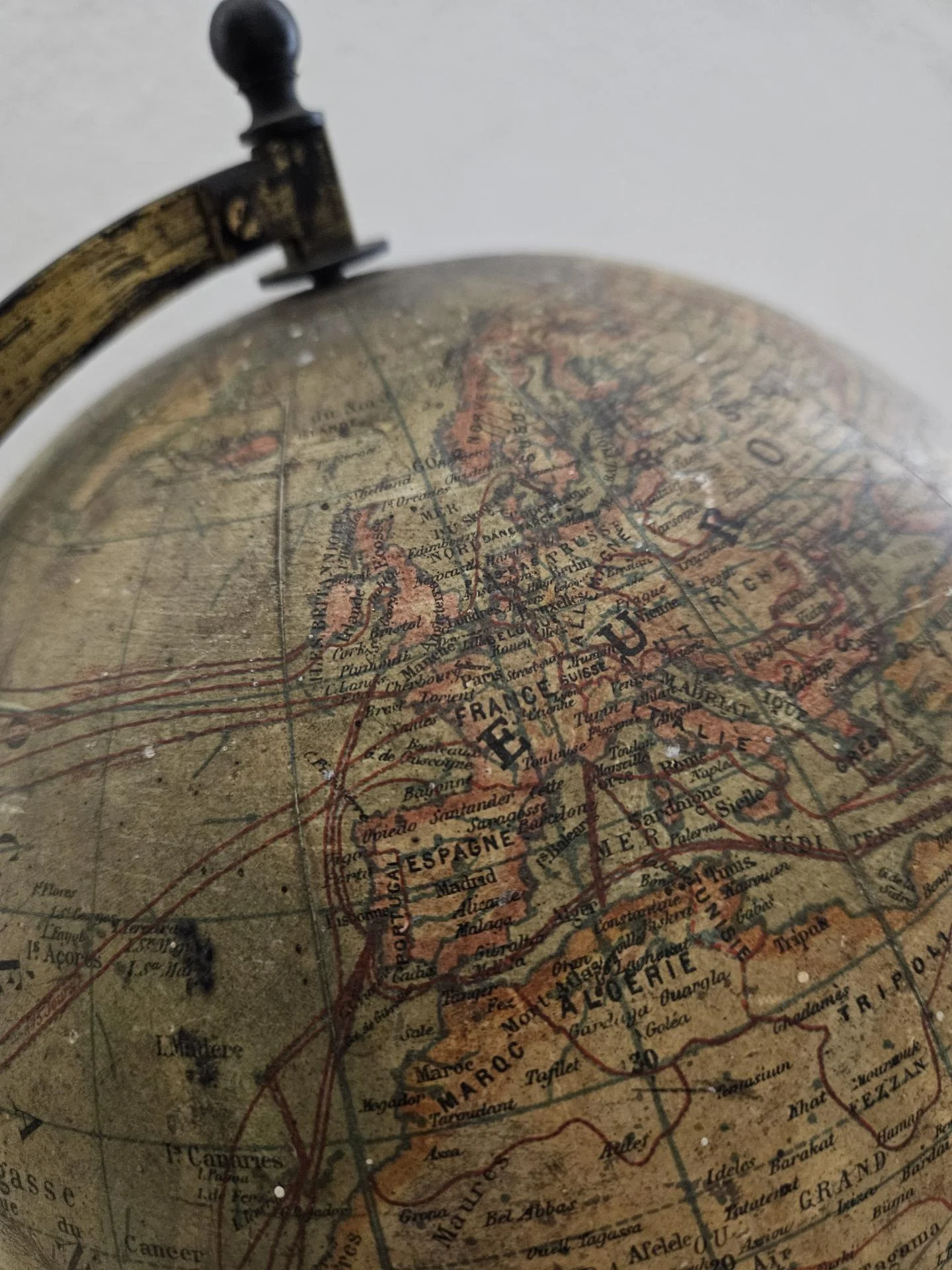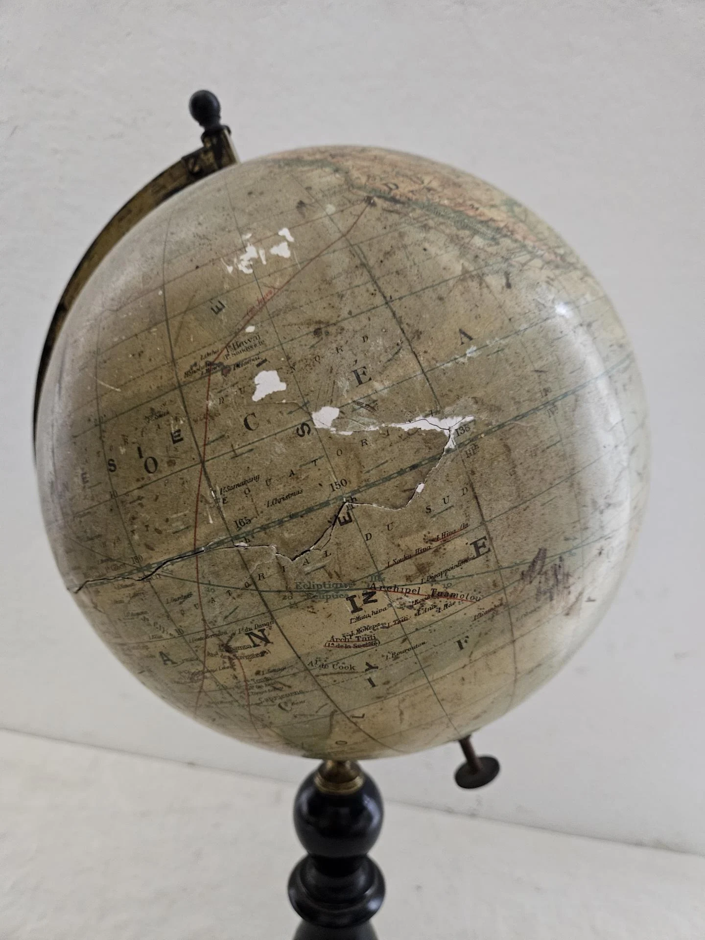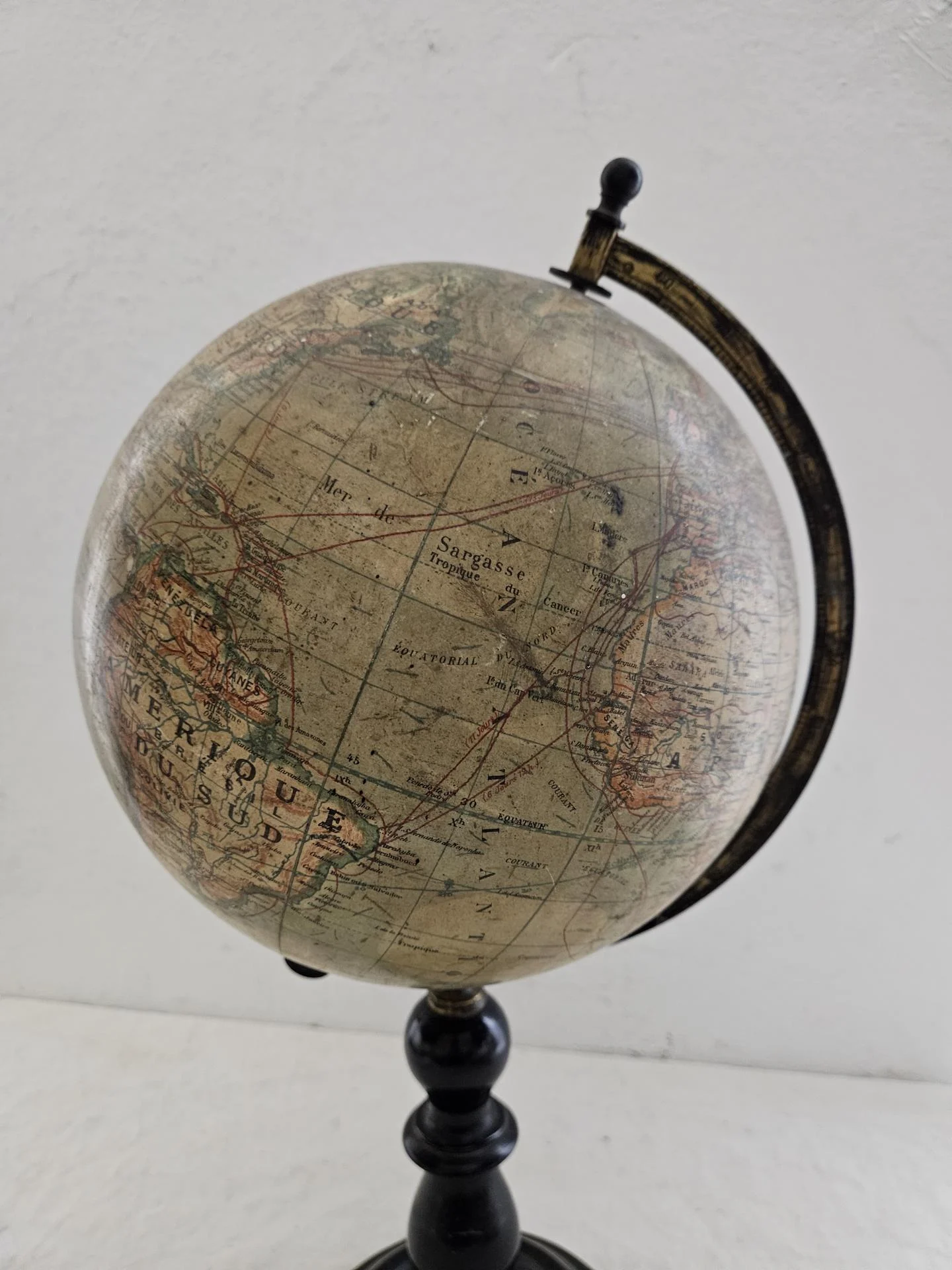 Globe terrestre fin 19ème siècle. Globe Napoléon 3 sur pied en bois noirci de la maison IKELMER Paris éditeur et fabricant de sphères. Carte en papier d'après R. Barbot. A noter traces d'usure par endroits et une fisure sur la sphère (voir photos) Le globe reste solide et se manipule facilement. Hauteur 50 cm, diamètre du globe 24 cm.