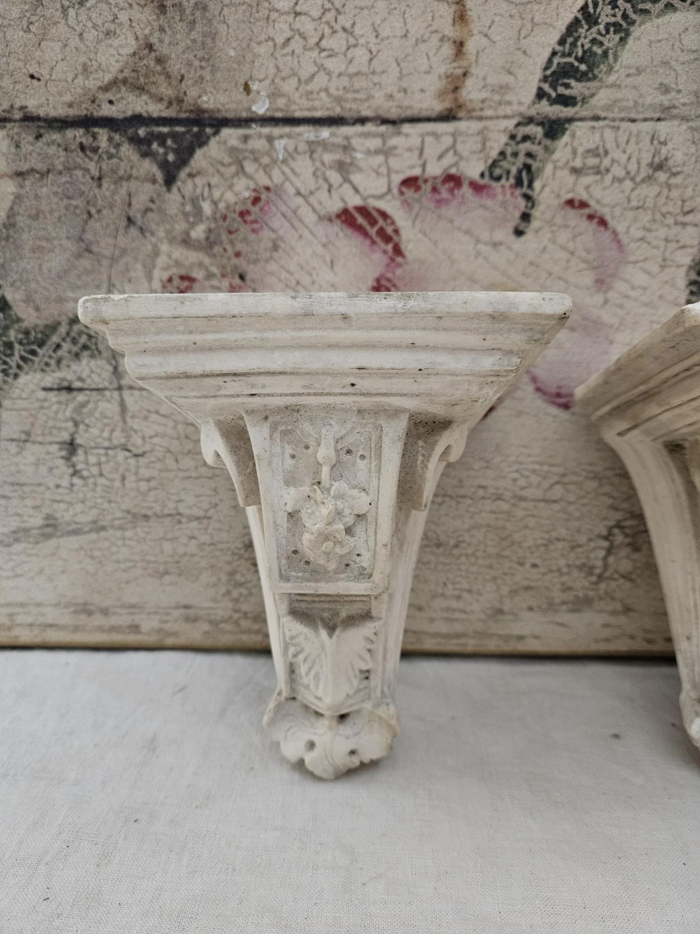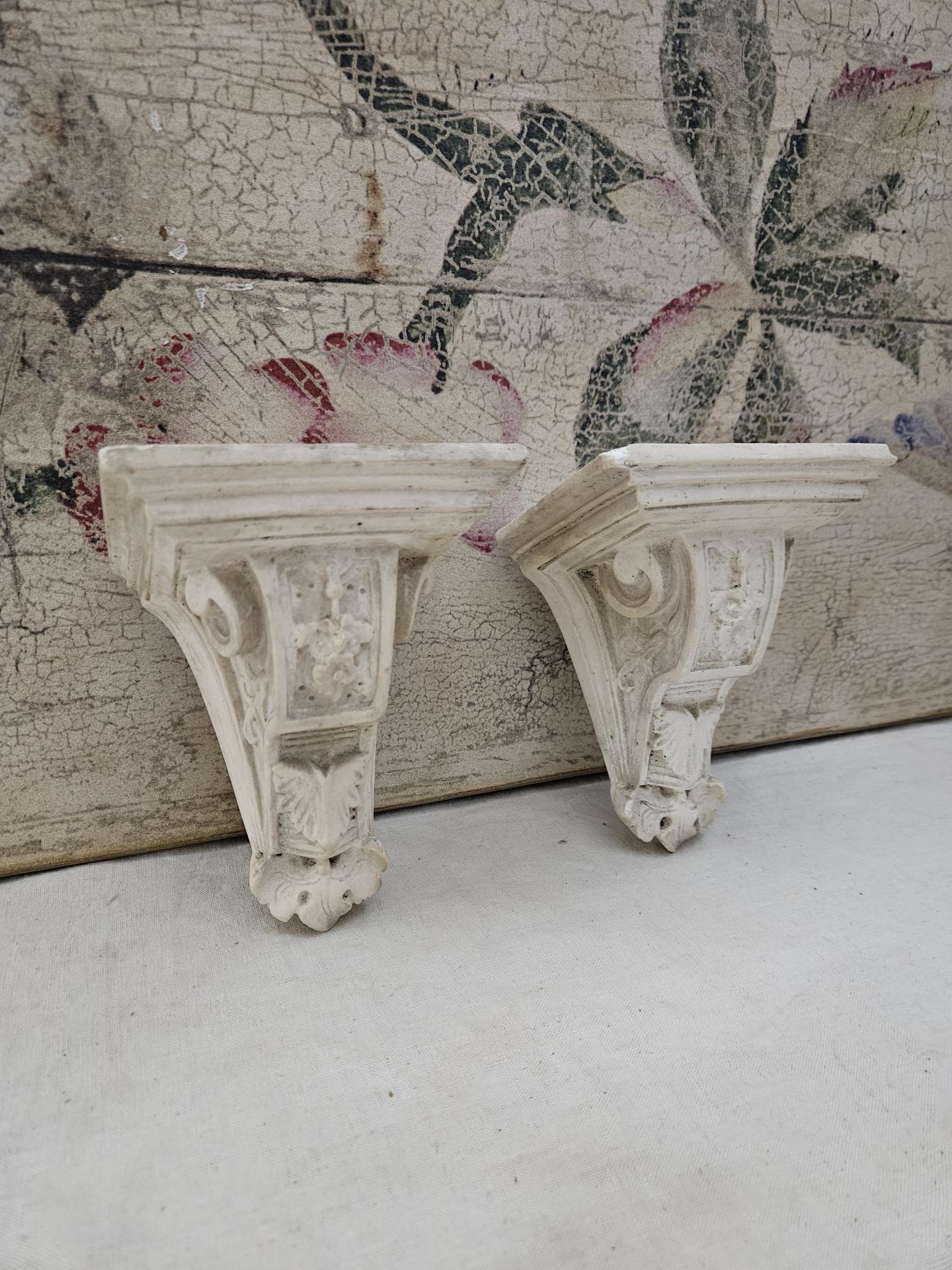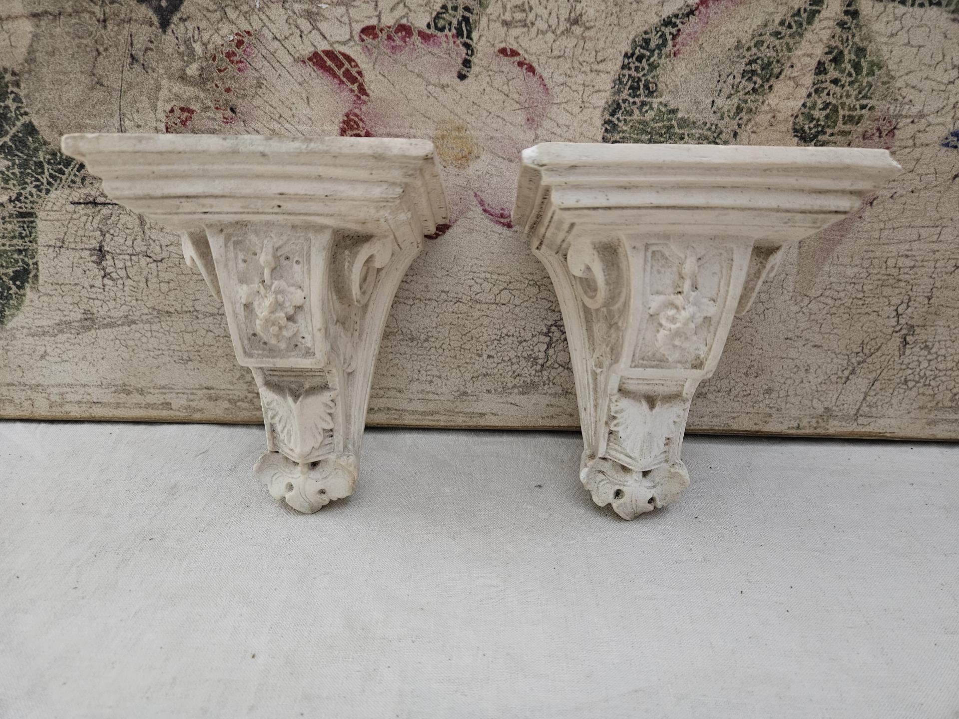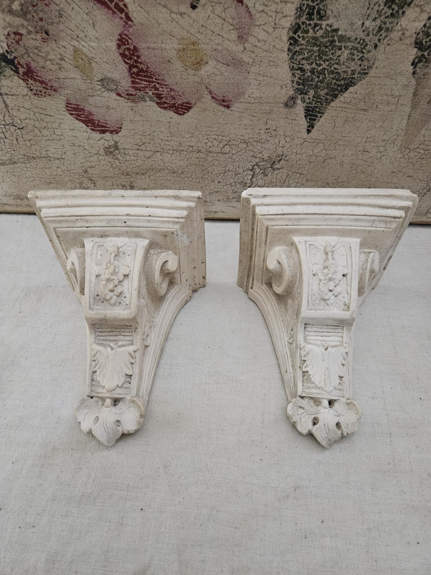 Paire de consoles murales en plâtre (staff). Jolies consoles sculptées, patine blanc beige de style corinthien au décor d'arabesques et végétaux. Superbe pour mettre en valeur un joli vase, une sculpture... Hauteur 14 cm - largeur 11.50 cm - profondeur 10 cm.