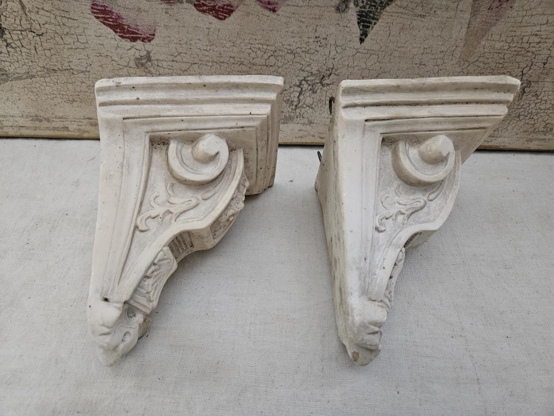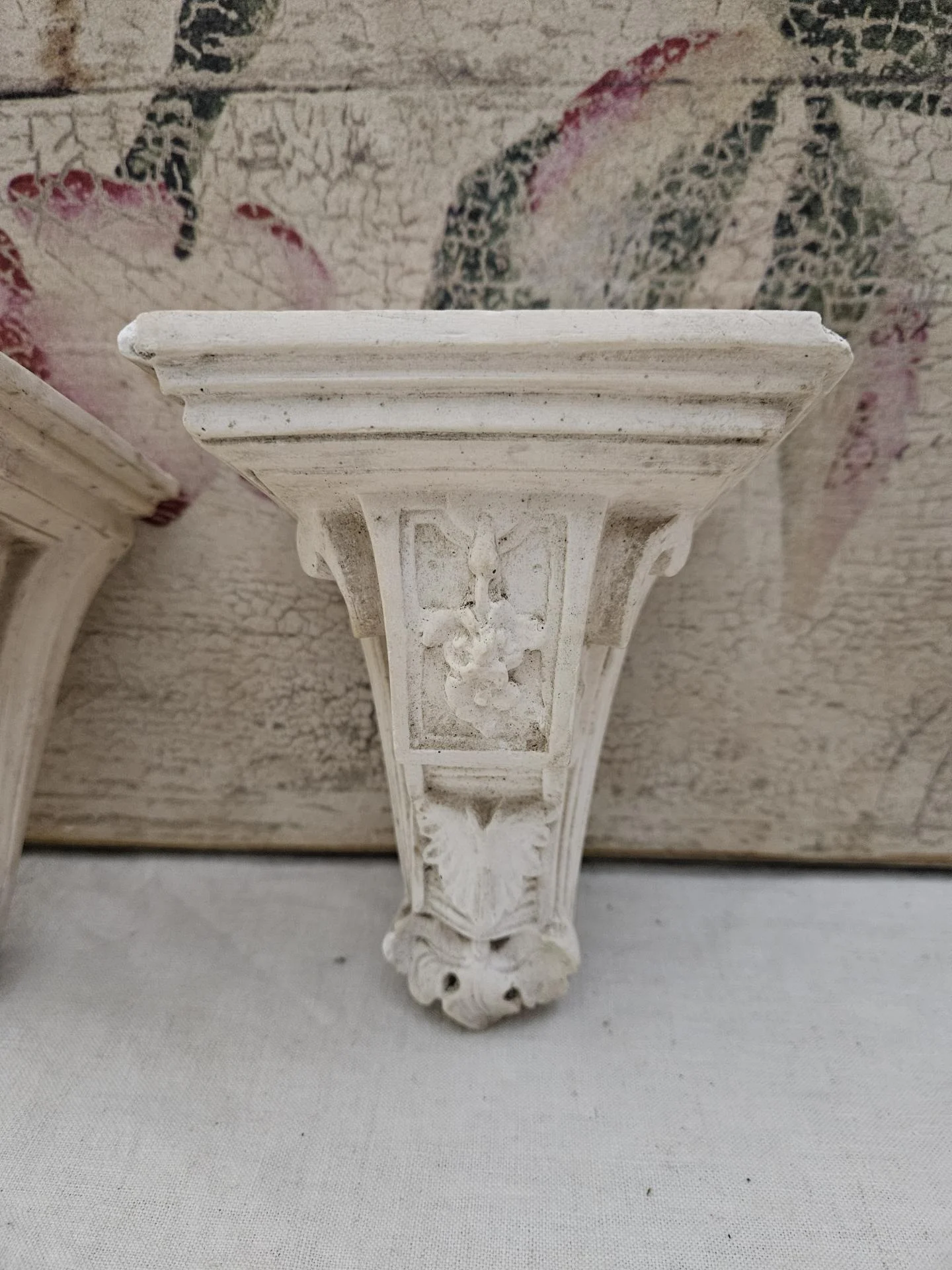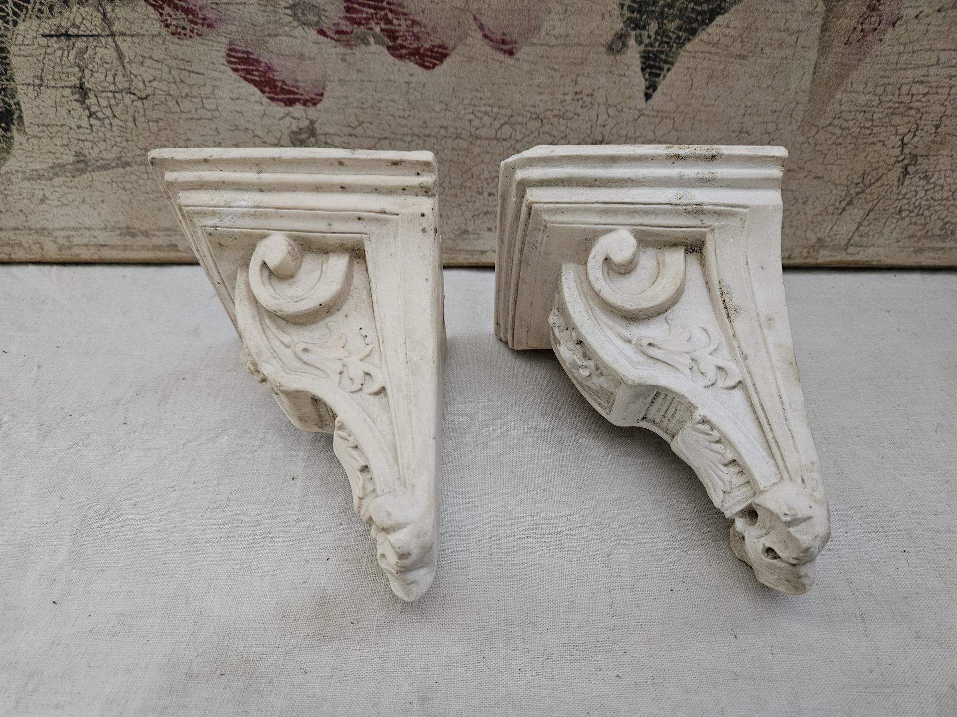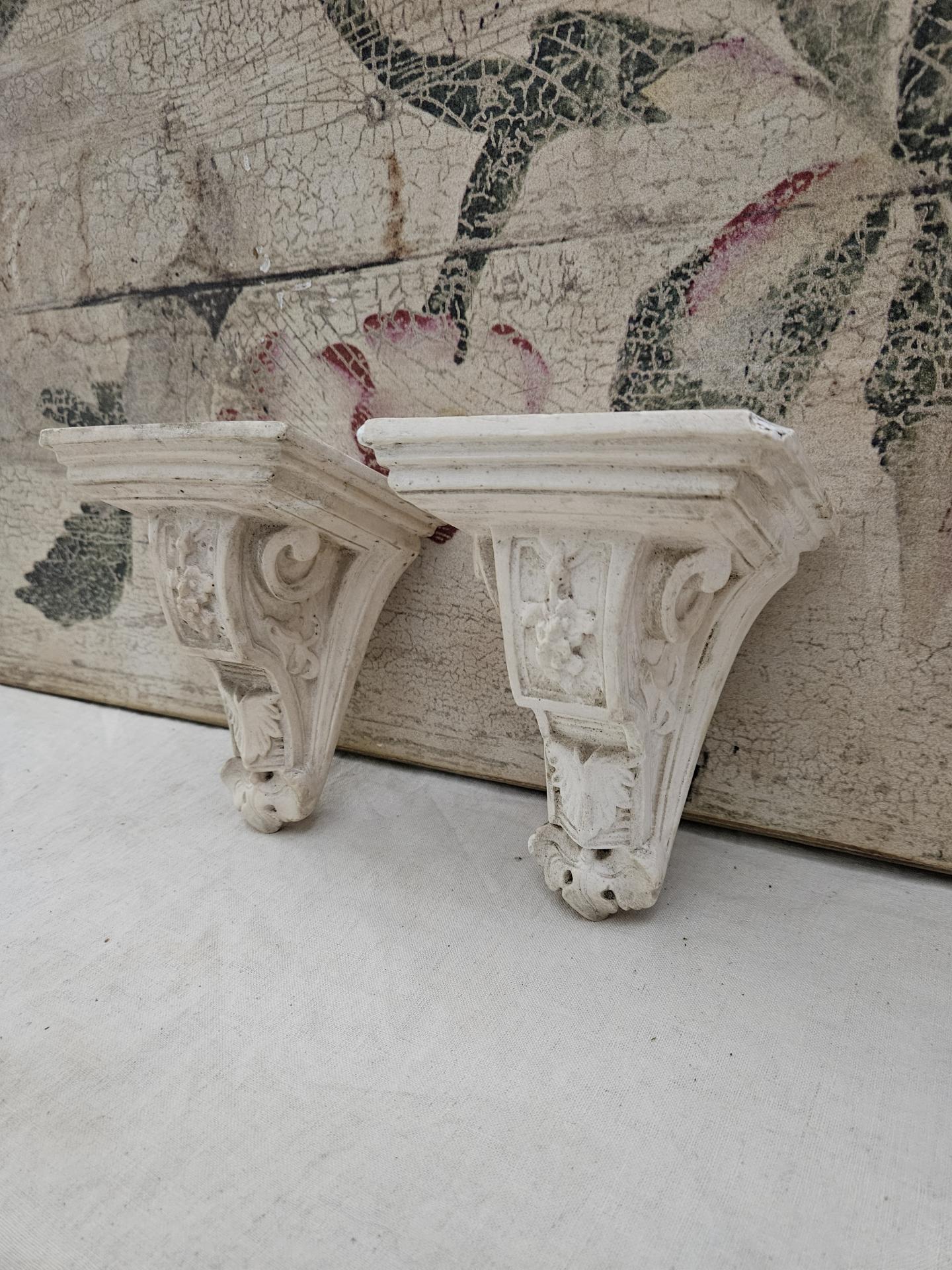 Paire de consoles murales en plâtre (staff). Jolies consoles sculptées, patine blanc beige de style corinthien au décor d'arabesques et végétaux. Superbe pour mettre en valeur un joli vase, une sculpture... Hauteur 14 cm - largeur 11.50 cm - profondeur 10 cm.