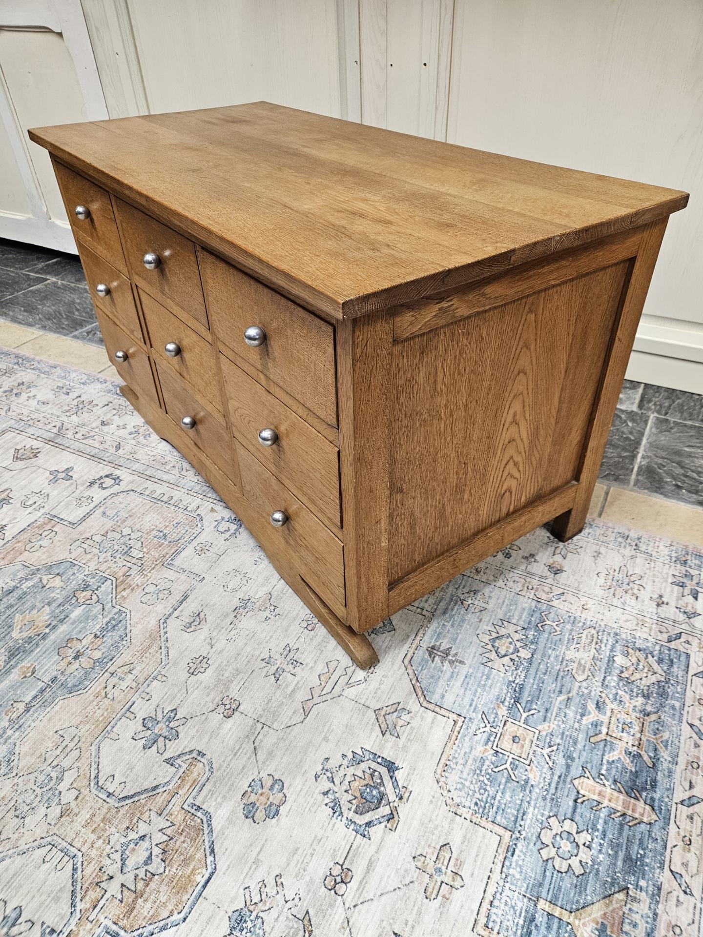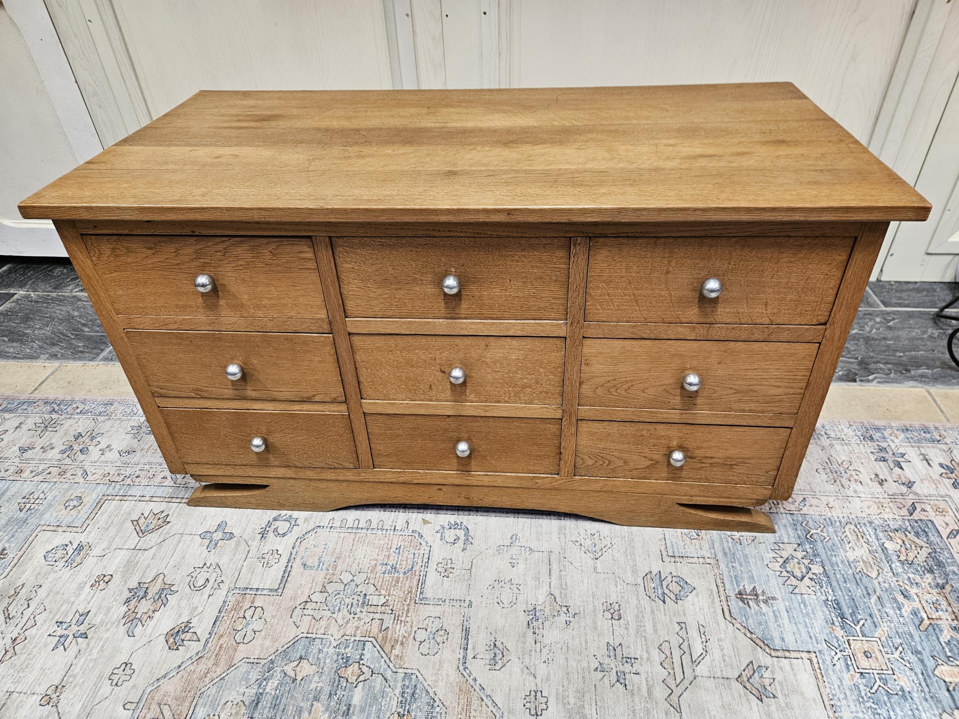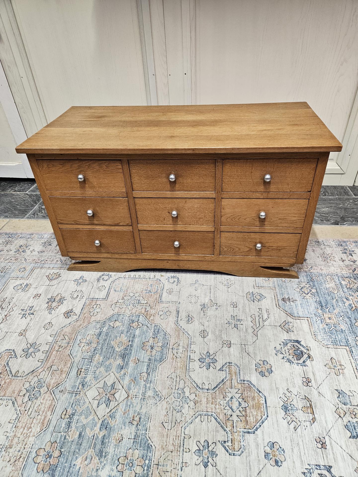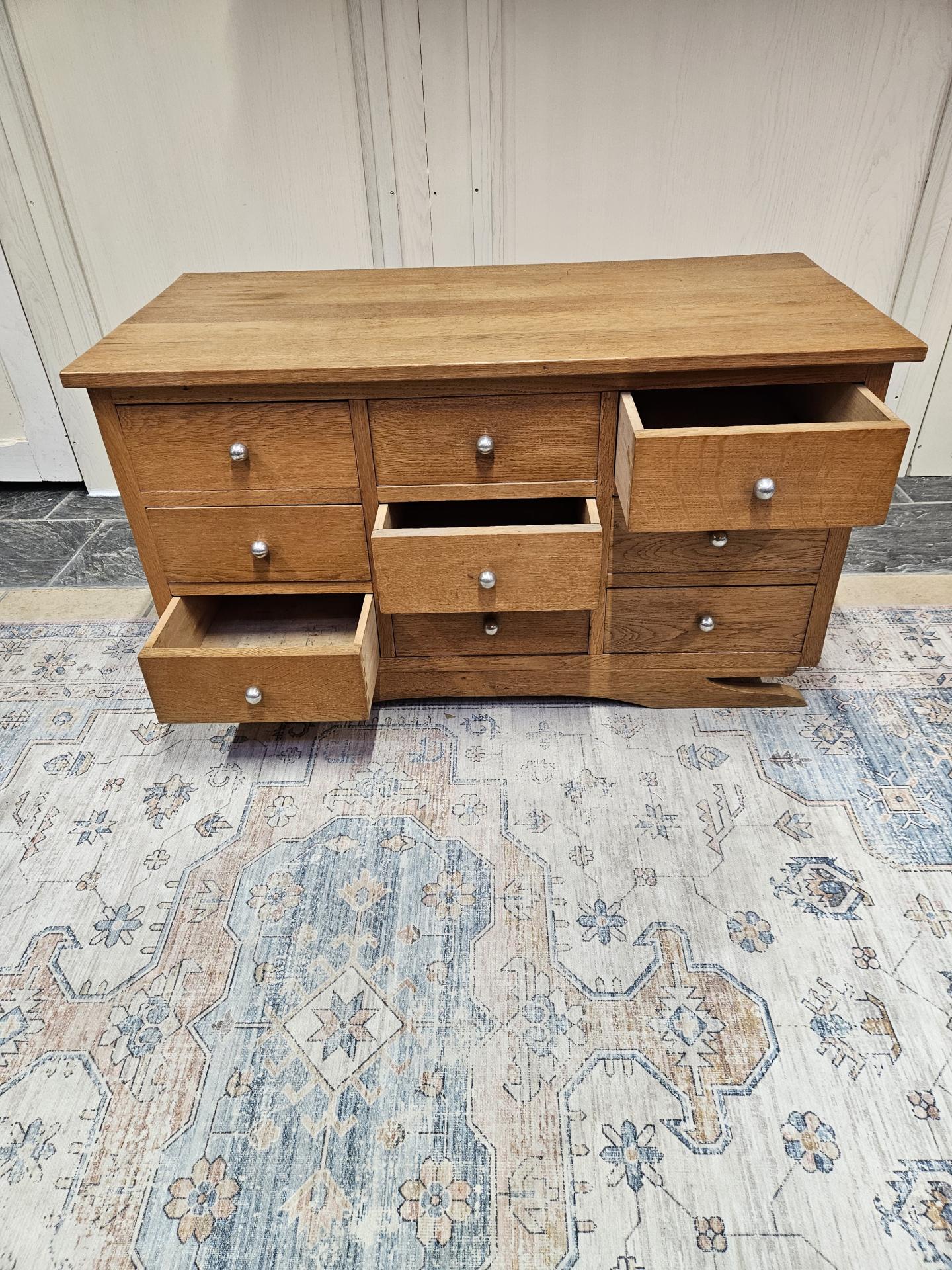 Meuble de métier provenant d'une ancienne mercerie. Meuble bas à tiroirs des années 40/50 en chêne et hêtre, en bel état. 9 tiroirs à poignées boutons chromés. Belle patine couleur miel. Quelques légères traces d'usage par endroits sans gravité. Hauteur 57 cm - Largeur 103 cm - Profondeur 51 cm.