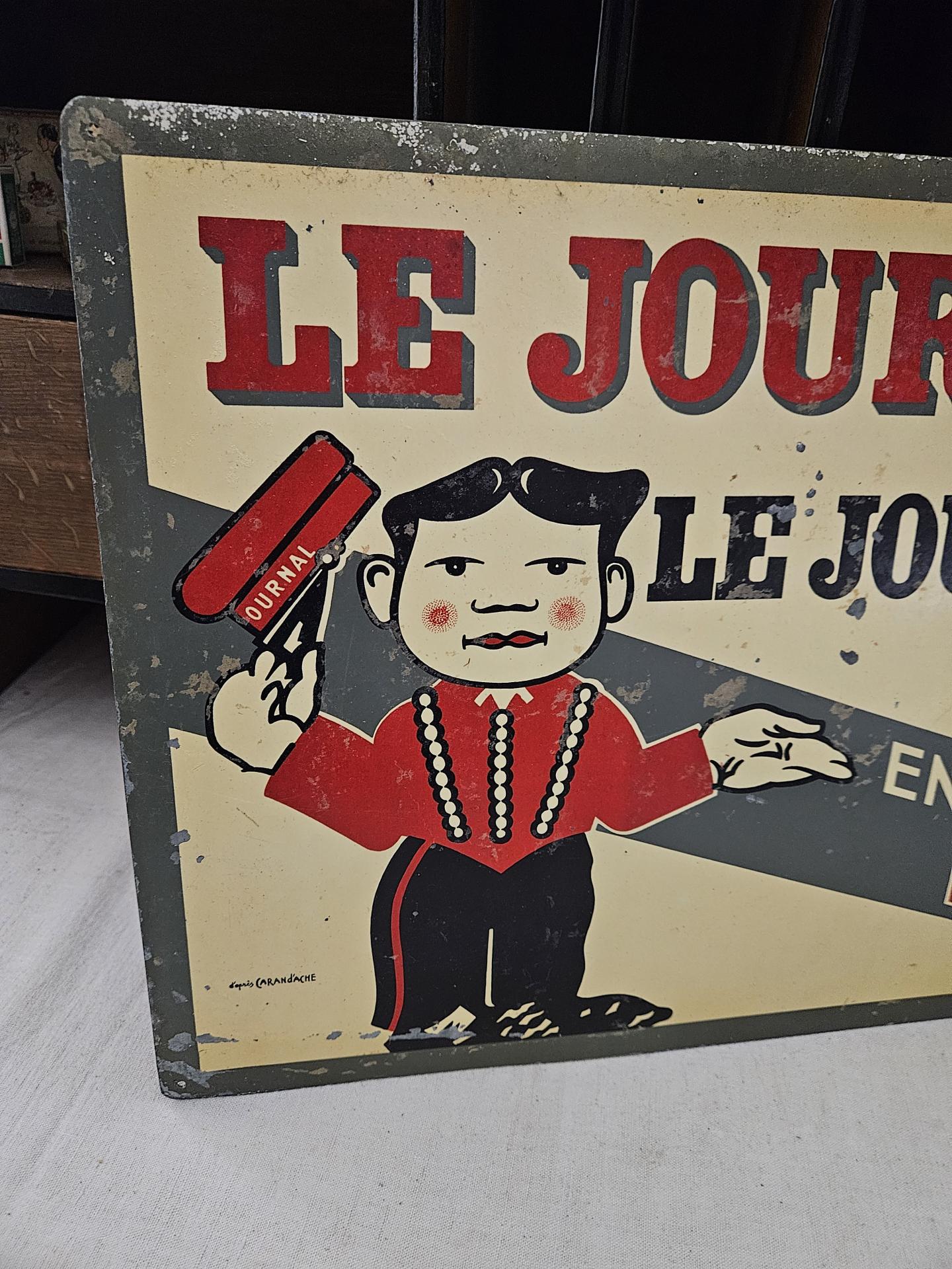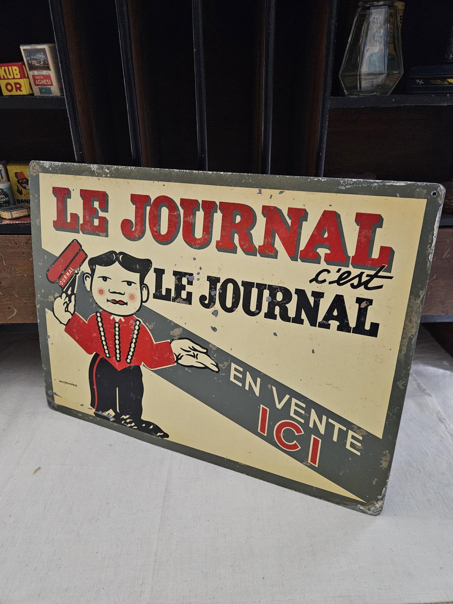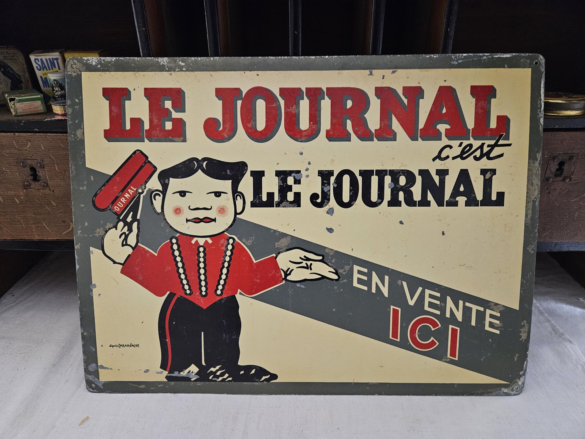 Ancienne publicité de kiosque à journaux " Le Journal, c'est le Journal " . Tôle peinte " Le Journal, c'est le Journal, en vente Ici " d'après l'illustration signée du dessinateur caricaturiste CARAN d'ACHE (Emmanuel Poiré 1859 - 1909). Plaque en bel état d'usage avec sa patine du temps et ses belles couleurs encore fraiches. Dimensions 44 cm x 33 cm.