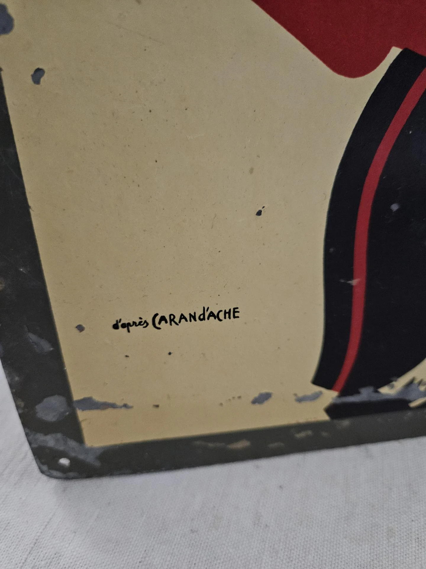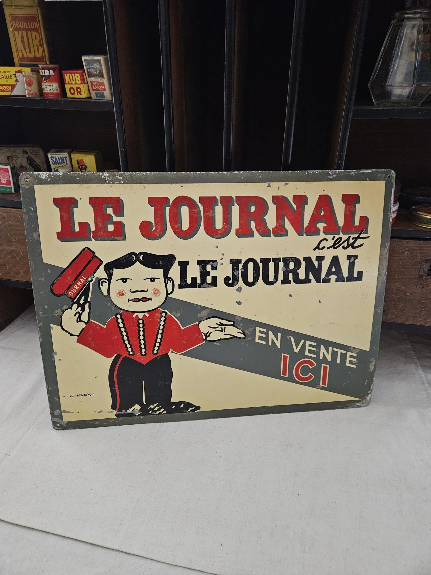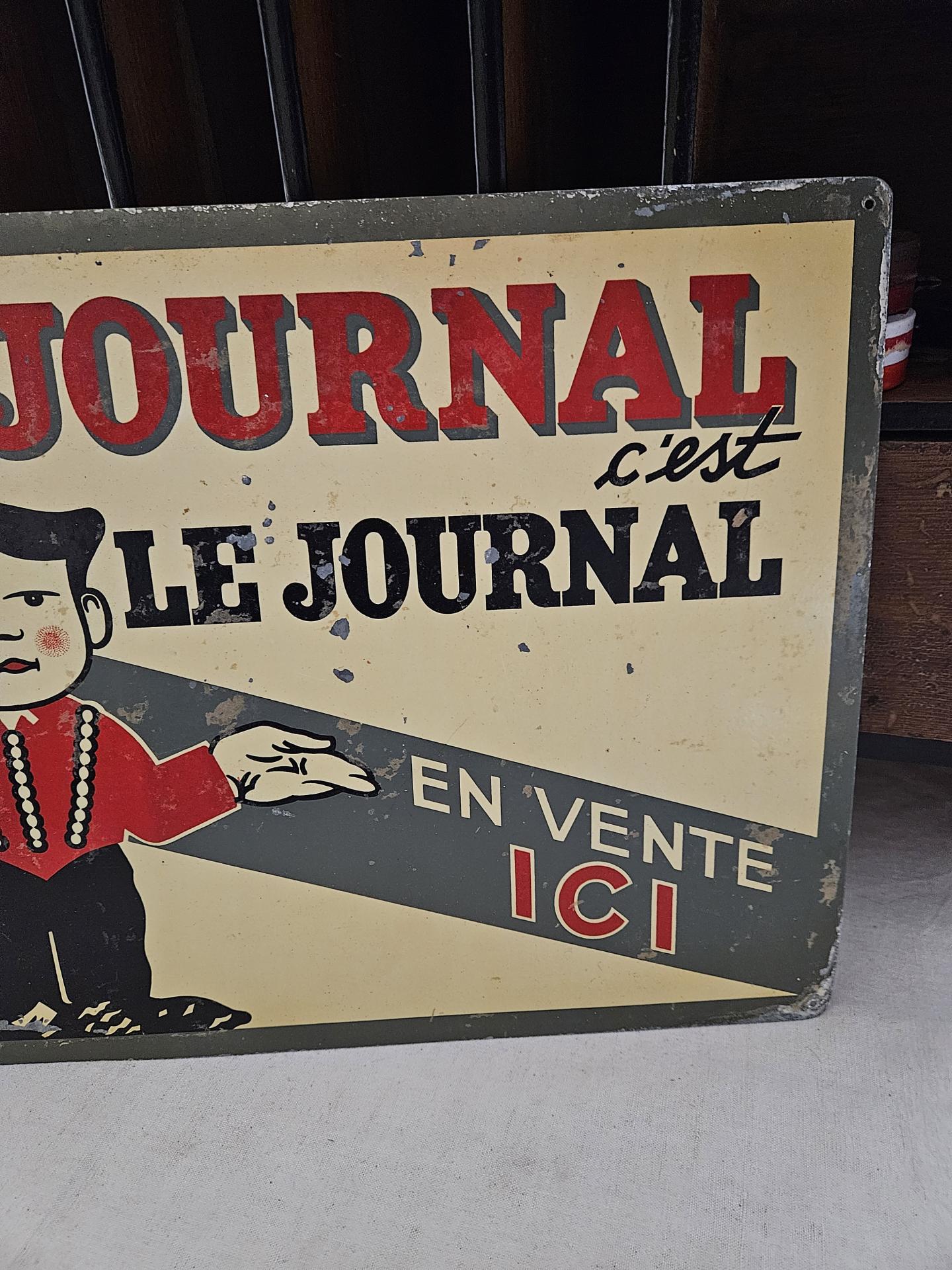 Ancienne publicité de kiosque à journaux " Le Journal, c'est le Journal " . Tôle peinte " Le Journal, c'est le Journal, en vente Ici " d'après l'illustration signée du dessinateur caricaturiste CARAN d'ACHE (Emmanuel Poiré 1859 - 1909). Plaque en bel état d'usage avec sa patine du temps et ses belles couleurs encore fraiches. Dimensions 44 cm x 33 cm.