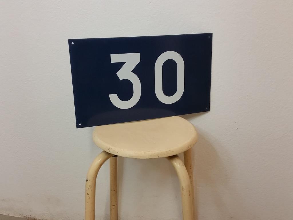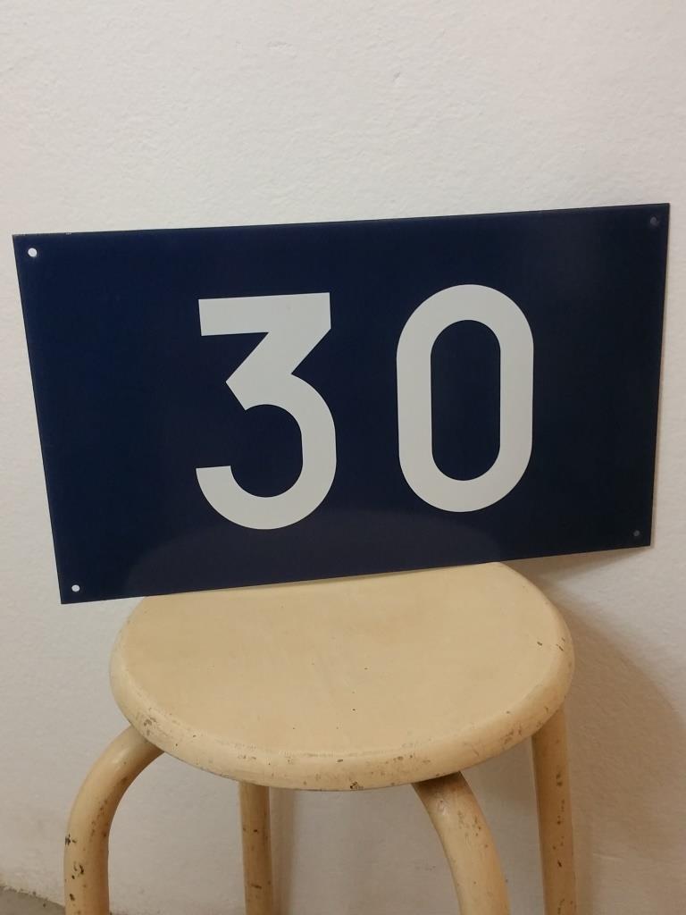 Ancienne plaque émaillée SNCF numéro 30. Plaque de signalisation en bel état avec de belles couleurs. Trous de fixation murale. Dimension 43 cm x 20 cm.