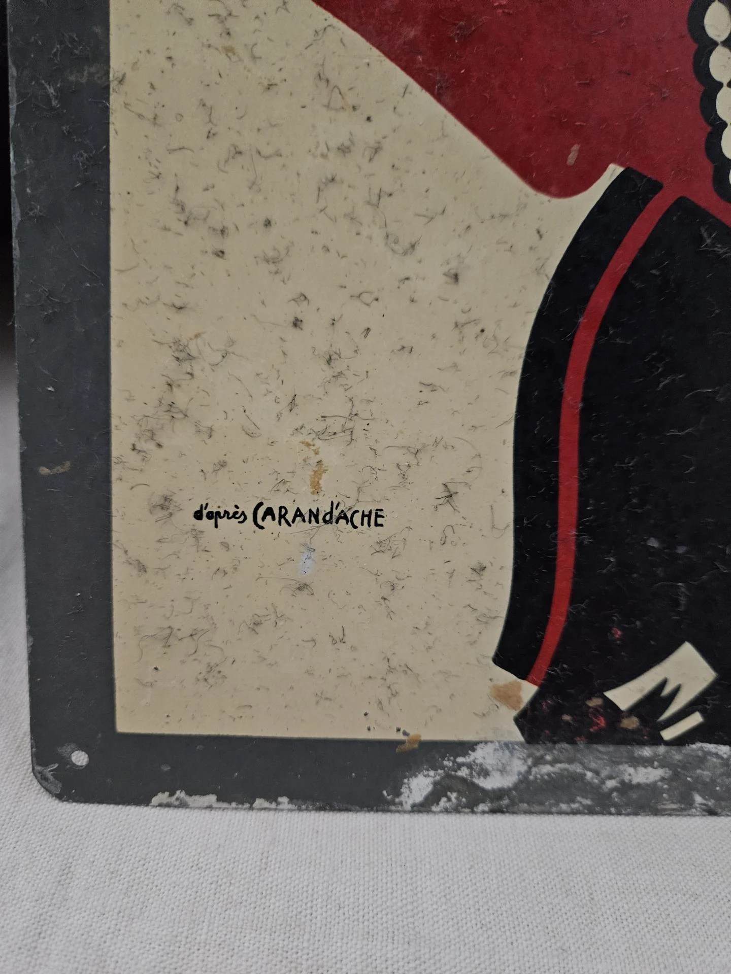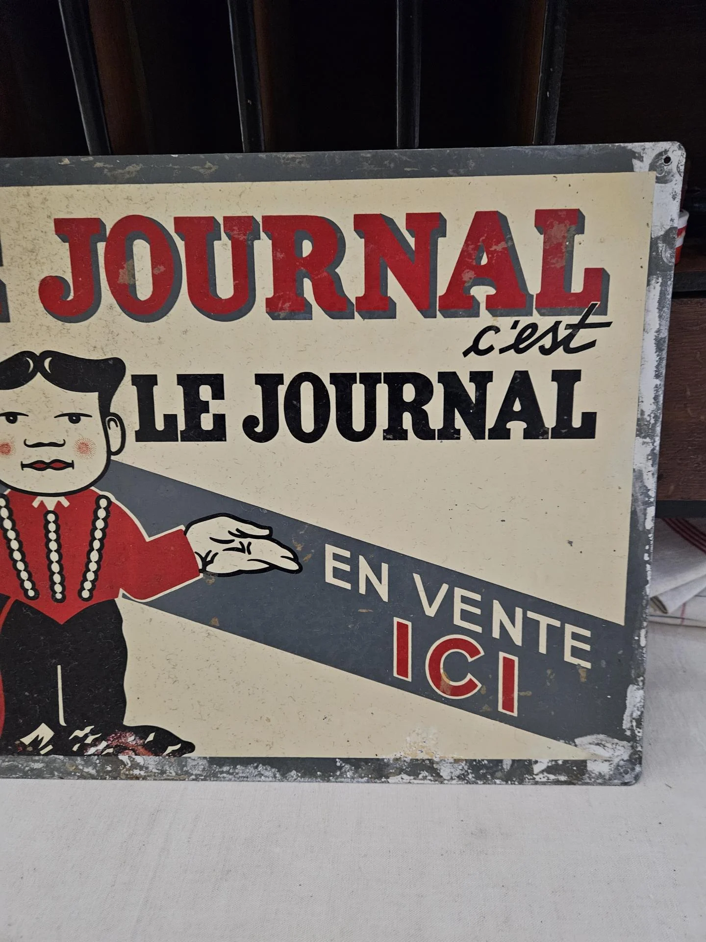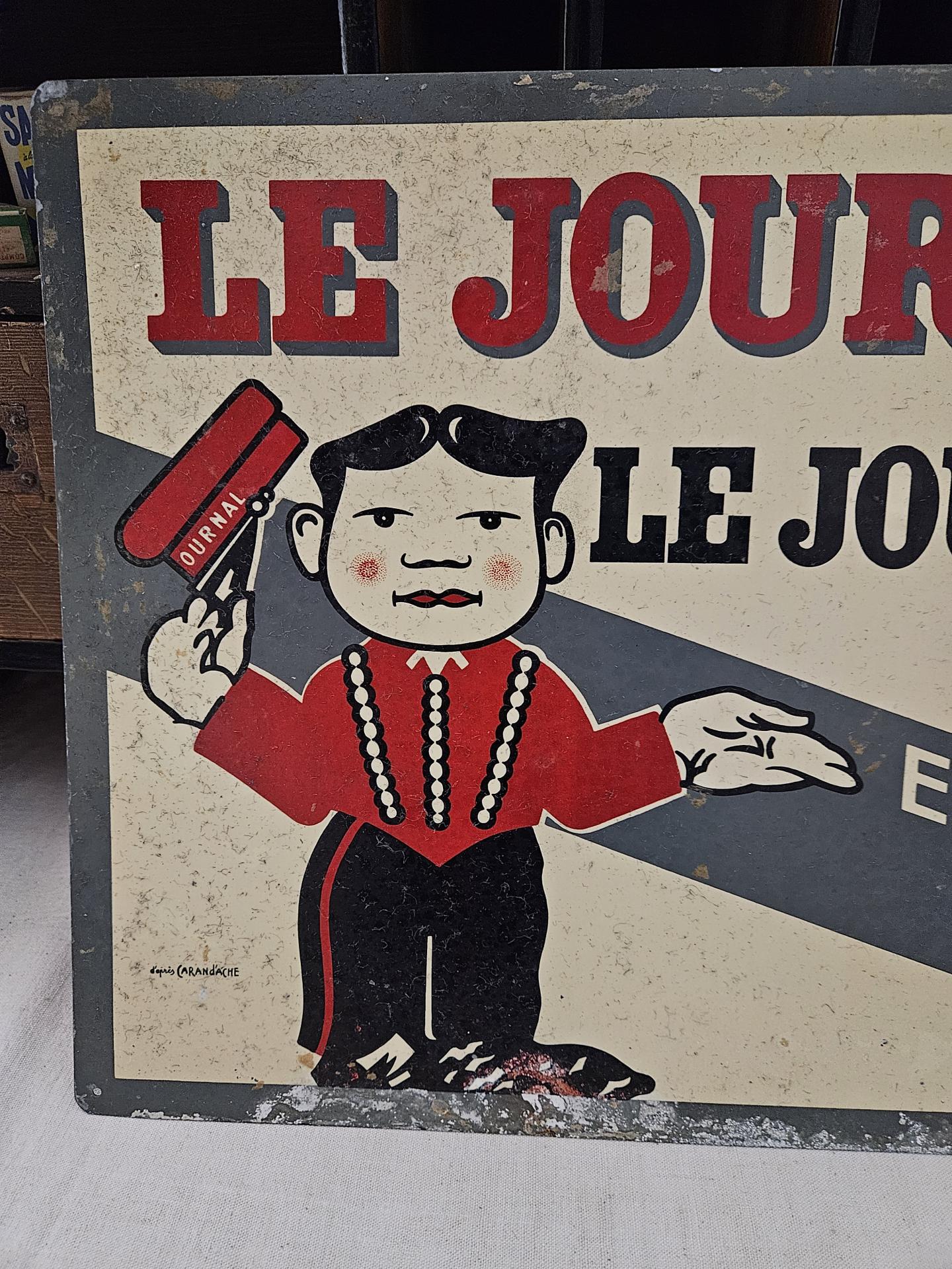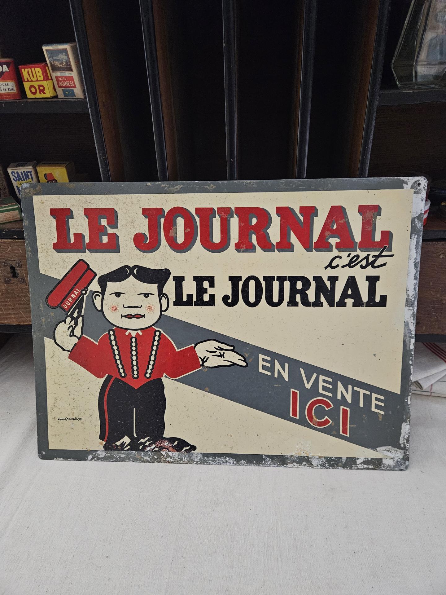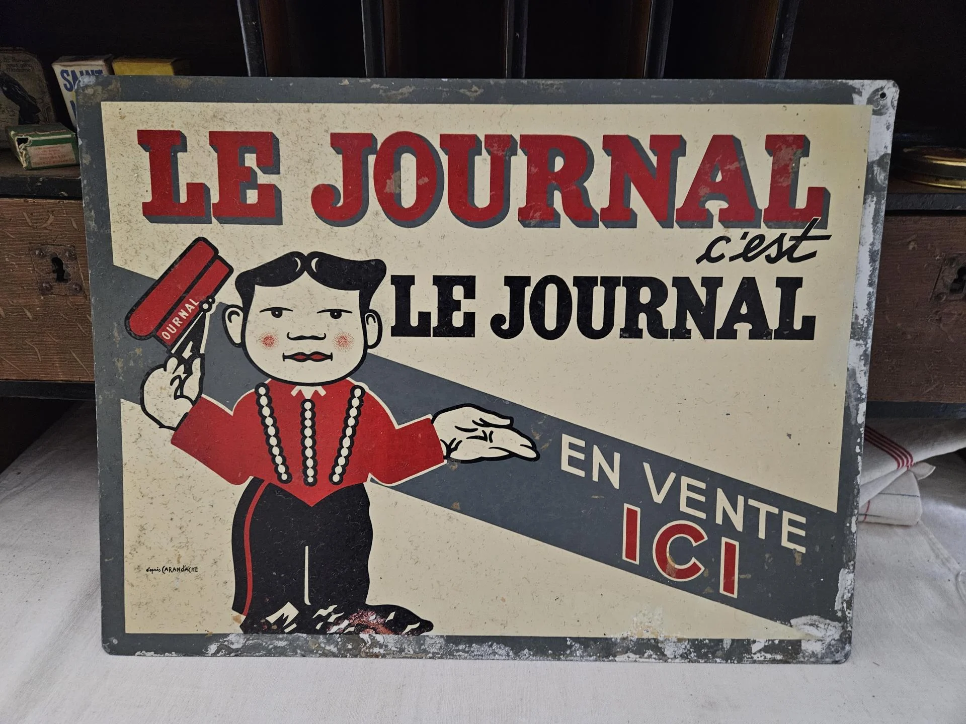 Ancienne publicité de kiosque à journaux " Le Journal, c'est le Journal " . Tôle peinte " Le Journal, c'est le Journal, en vente Ici " d'après l'illustration signée du dessinateur caricaturiste CARAN d'ACHE (Emmanuel Poiré 1859 - 1909). Plaque en bel état d'usage avec sa patine du temps et ses belles couleurs encore fraiches. Dimensions 44 cm x 33 cm.