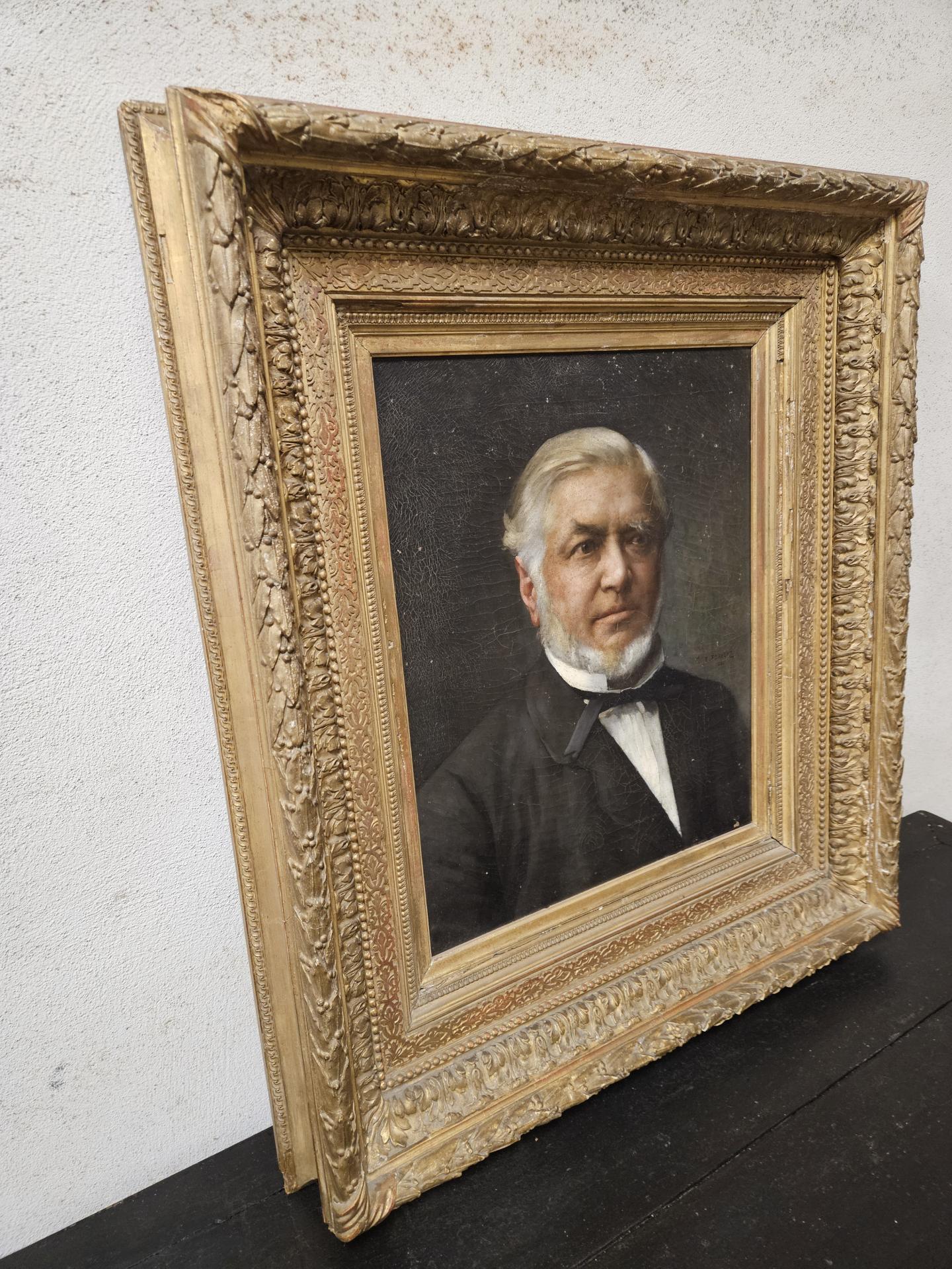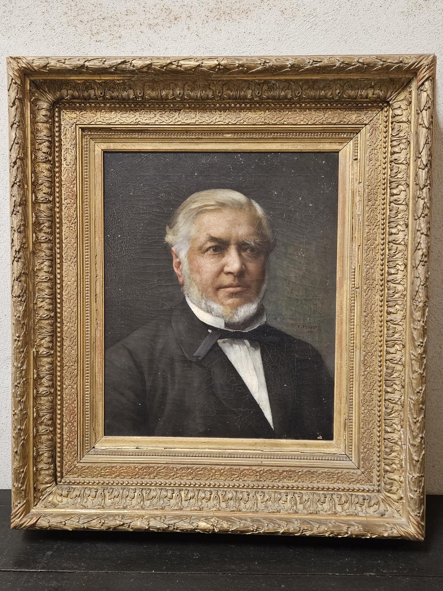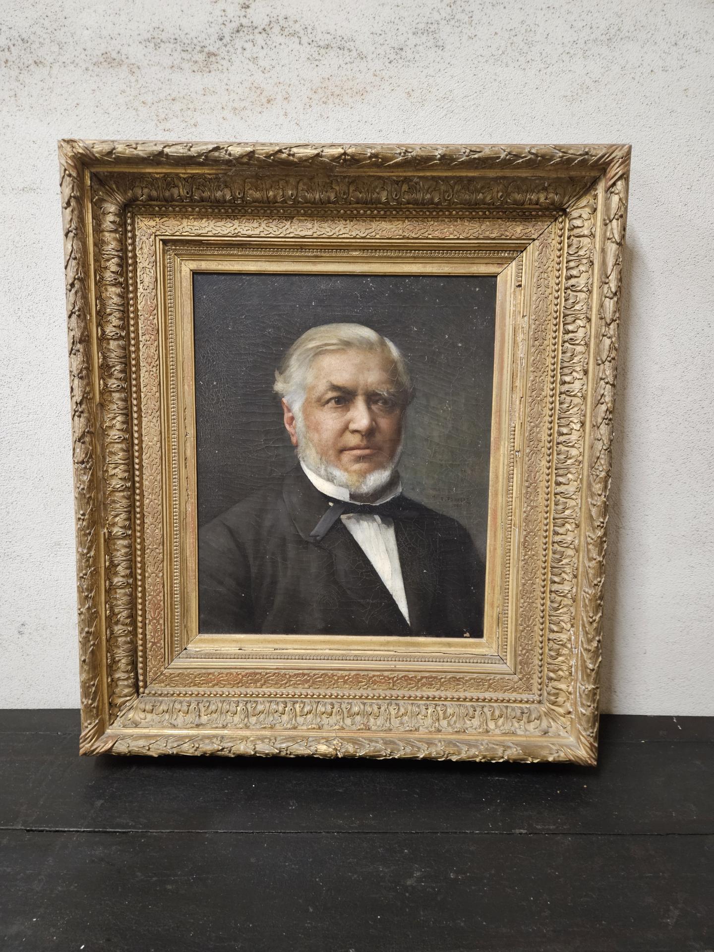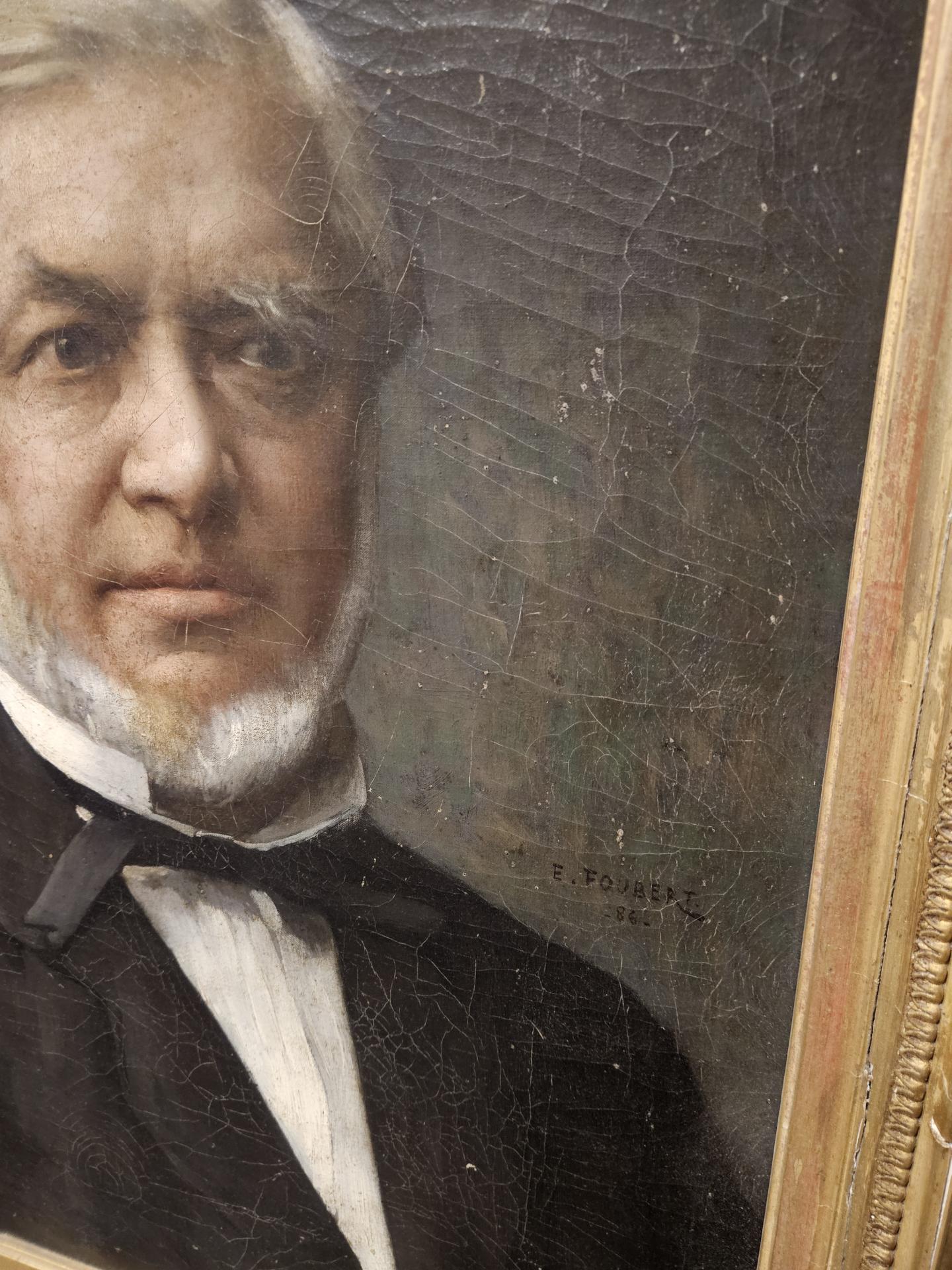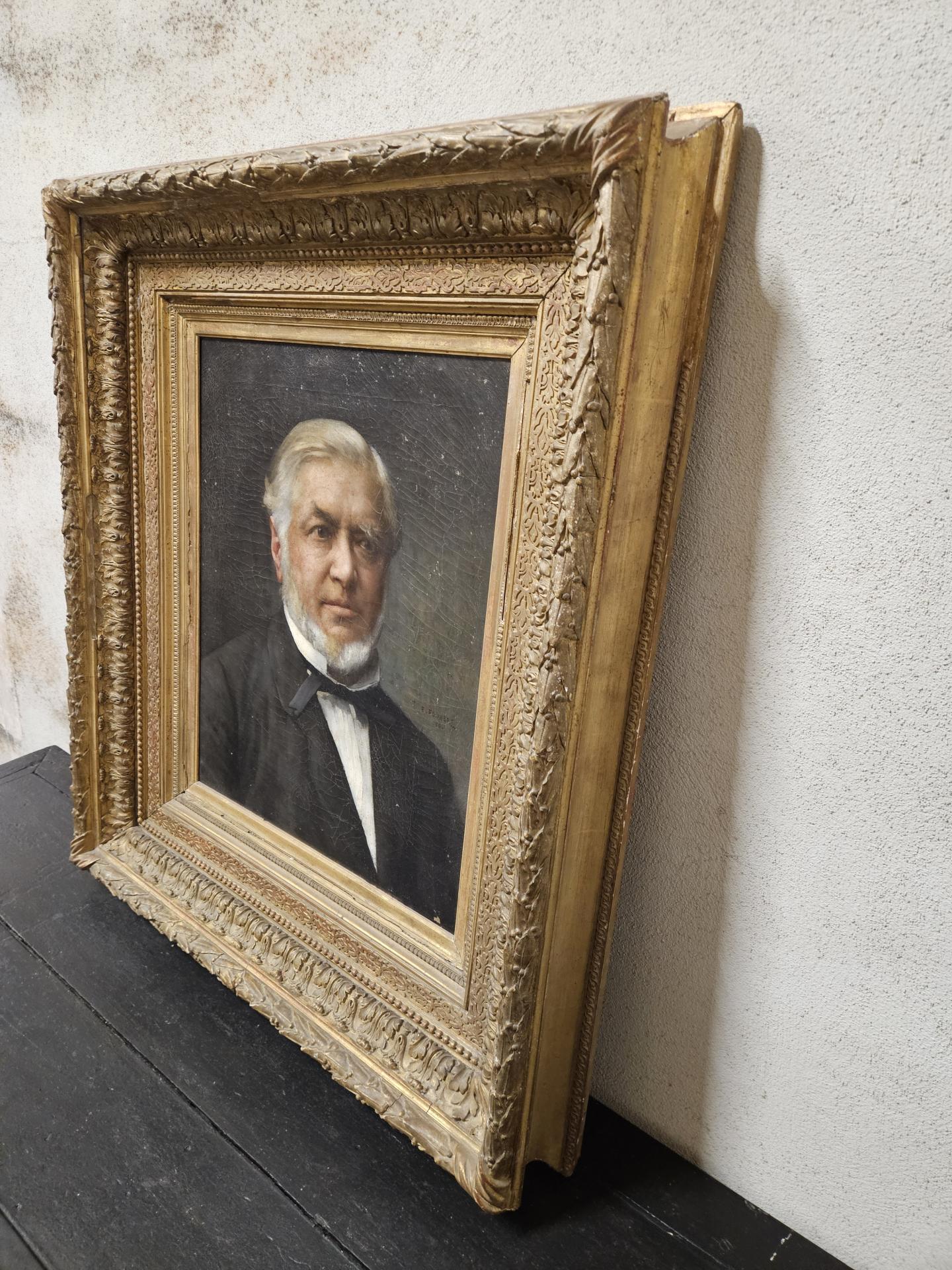 Portrait d'un homme bourgeois en costume 19ème. Huile sur toile de 1886, signée du peintre français Emile-Louis Foubert (1848 - 1911). Tableau encadré dans un superbe cadre bois et stuc doré. Œuvre en bel état avec quelques légers sauts de peinture sur la toile et quelques manques sur le cadre. Dimensions avec cadre 87 cm x 76 cm. Dimensions du tableau 56 cm x 46 cm. Inscriptions au dos : A. Bargue Fils 36 rue Bonapart Paris.