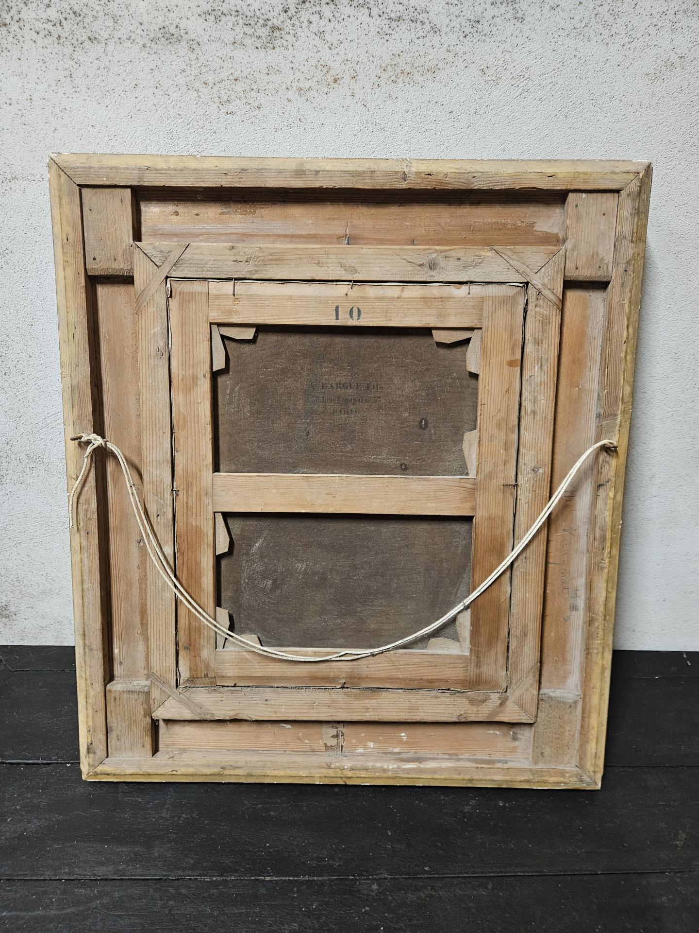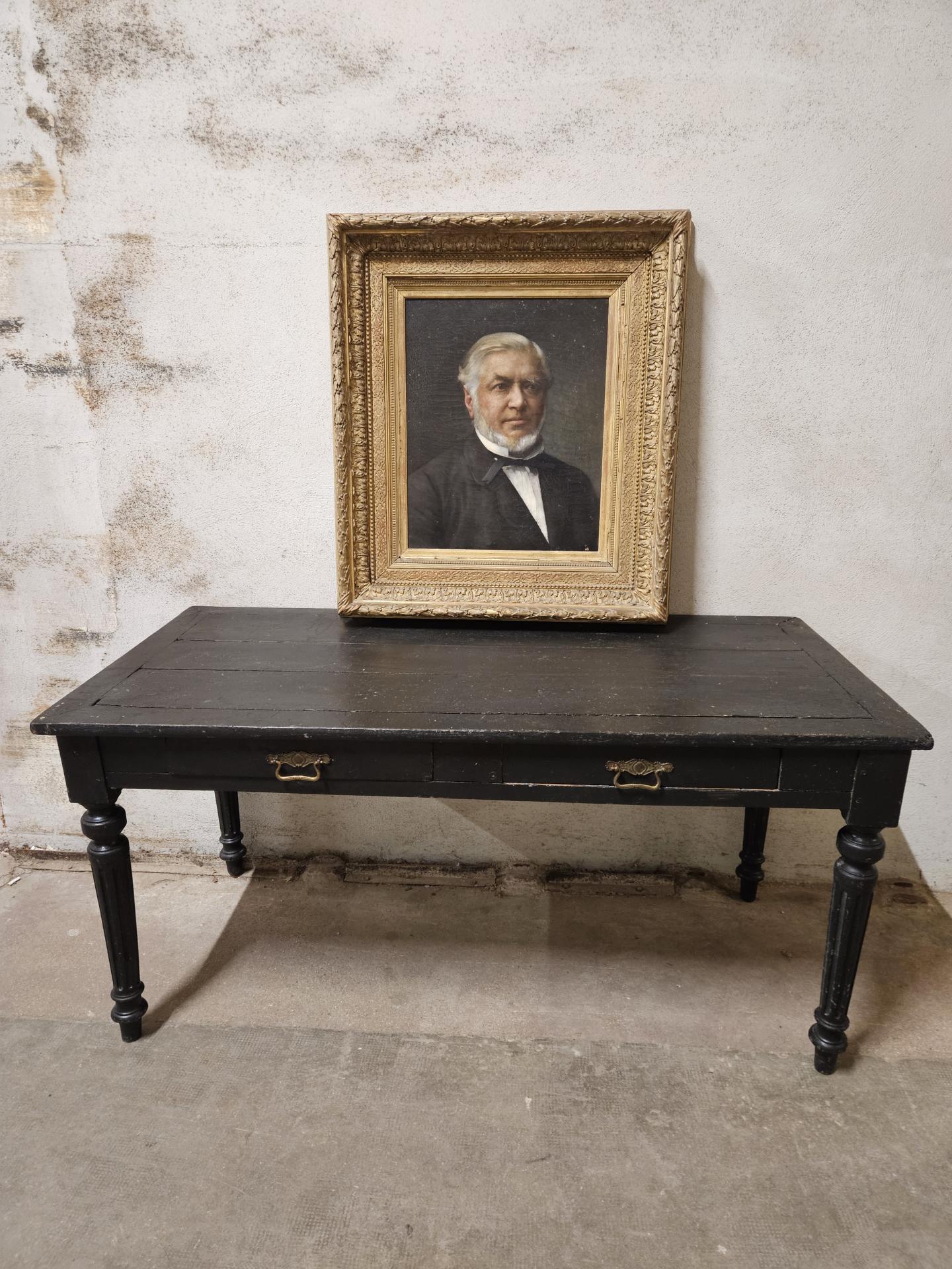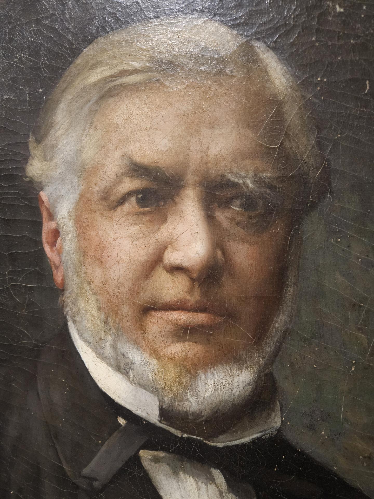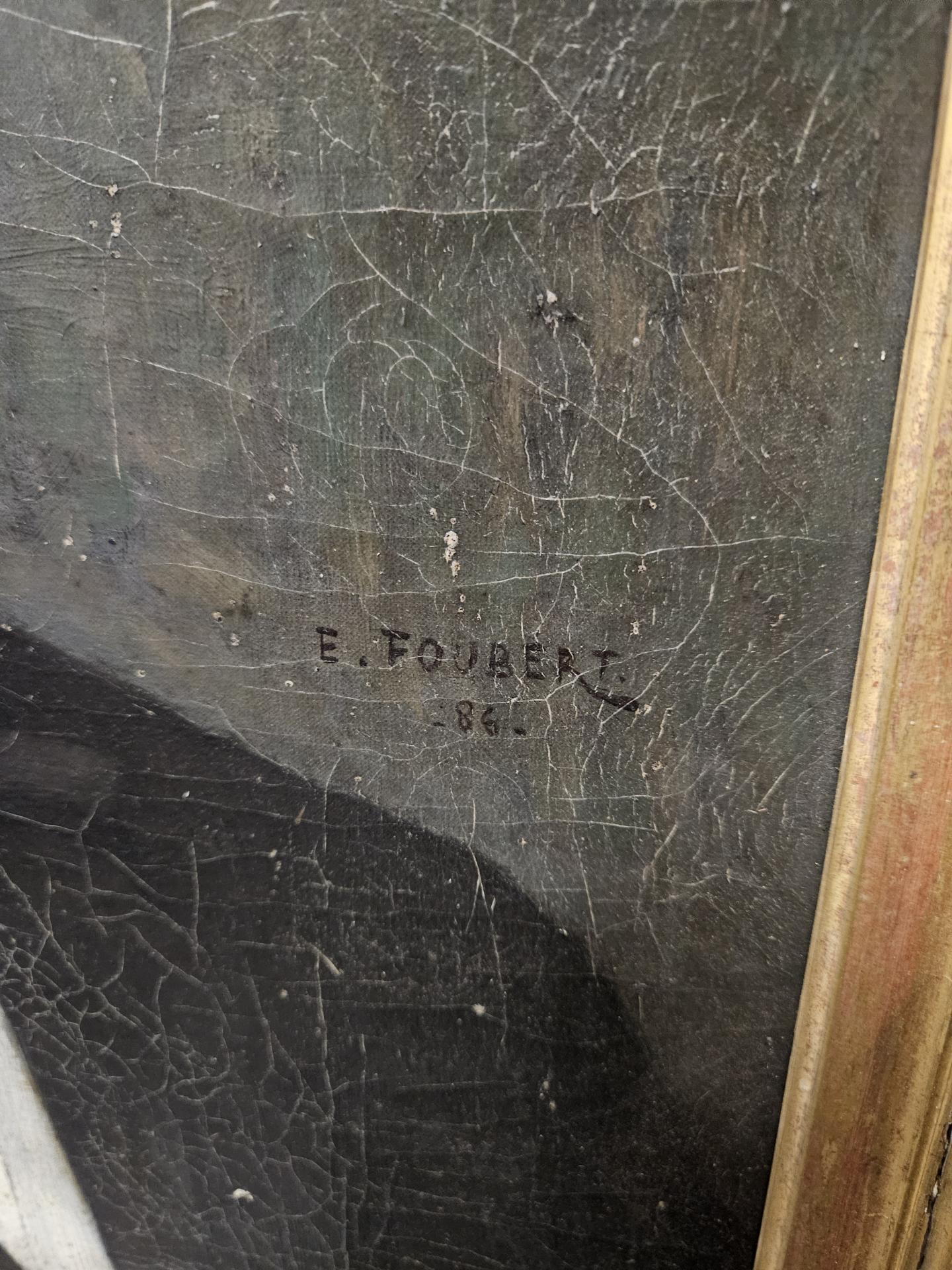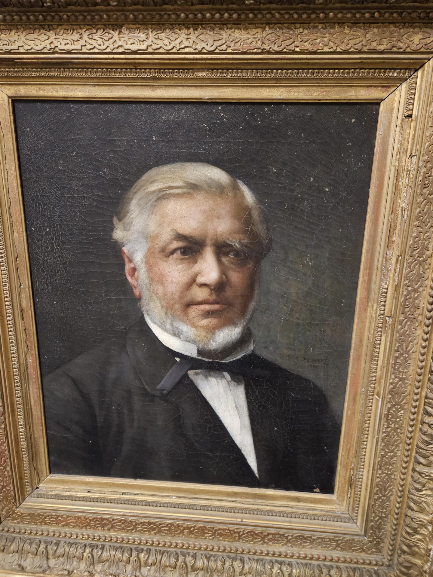 Portrait d'un homme bourgeois en costume 19ème. Huile sur toile de 1886, signée du peintre français Emile-Louis Foubert (1848 - 1911). Tableau encadré dans un superbe cadre bois et stuc doré. Œuvre en bel état avec quelques légers sauts de peinture sur la toile et quelques manques sur le cadre. Dimensions avec cadre 87 cm x 76 cm. Dimensions du tableau 56 cm x 46 cm. Inscriptions au dos : A. Bargue Fils 36 rue Bonapart Paris.