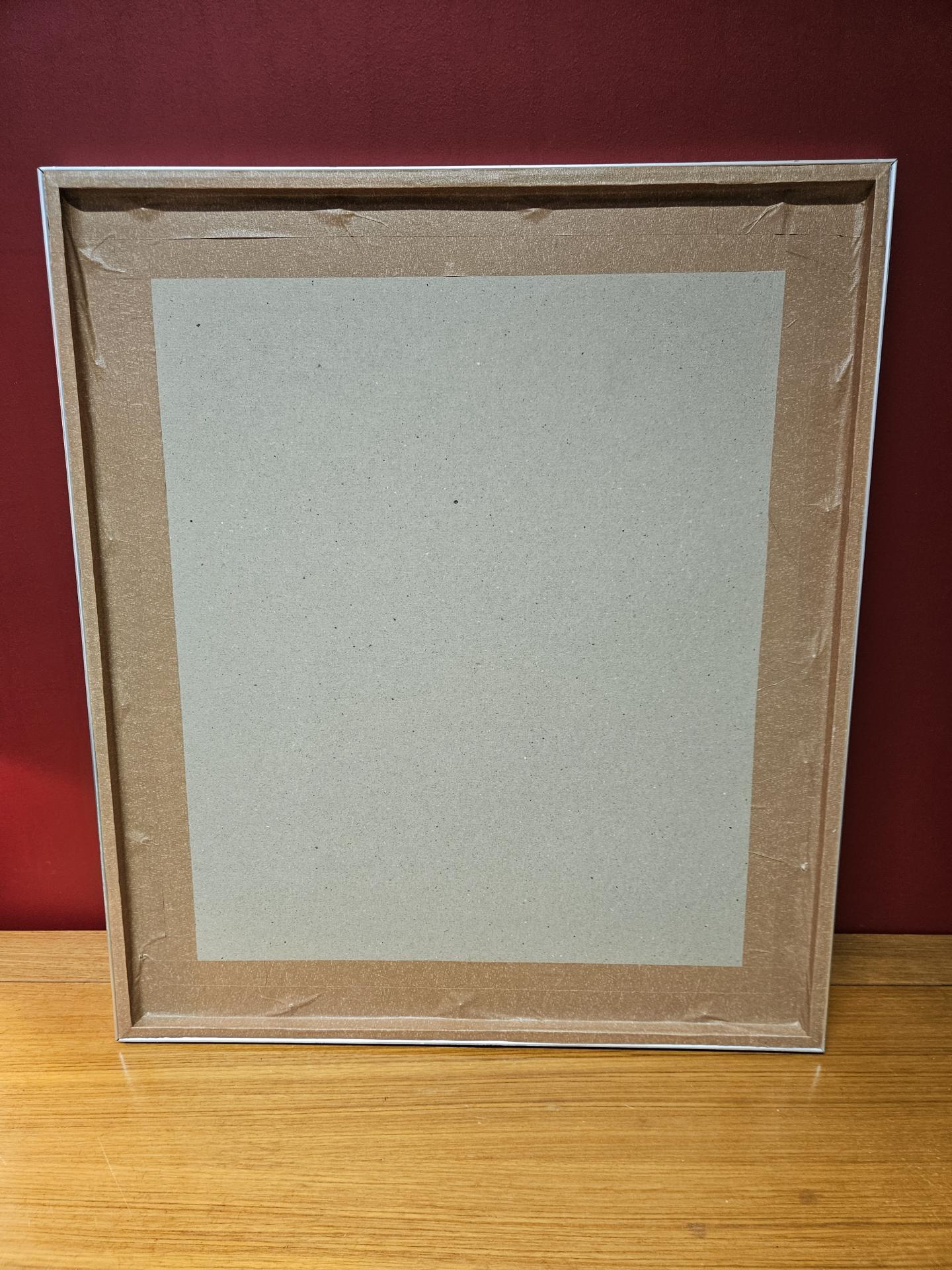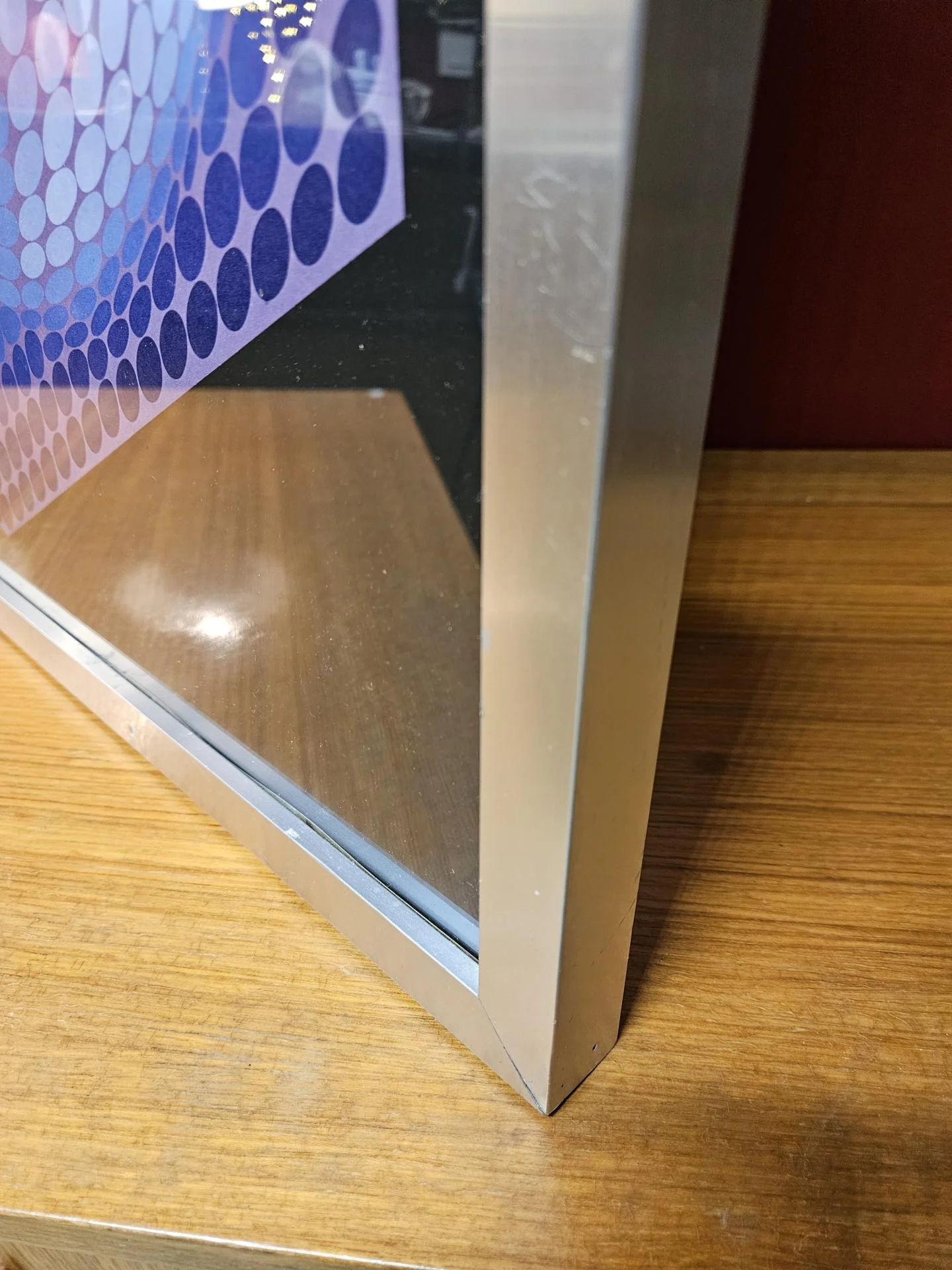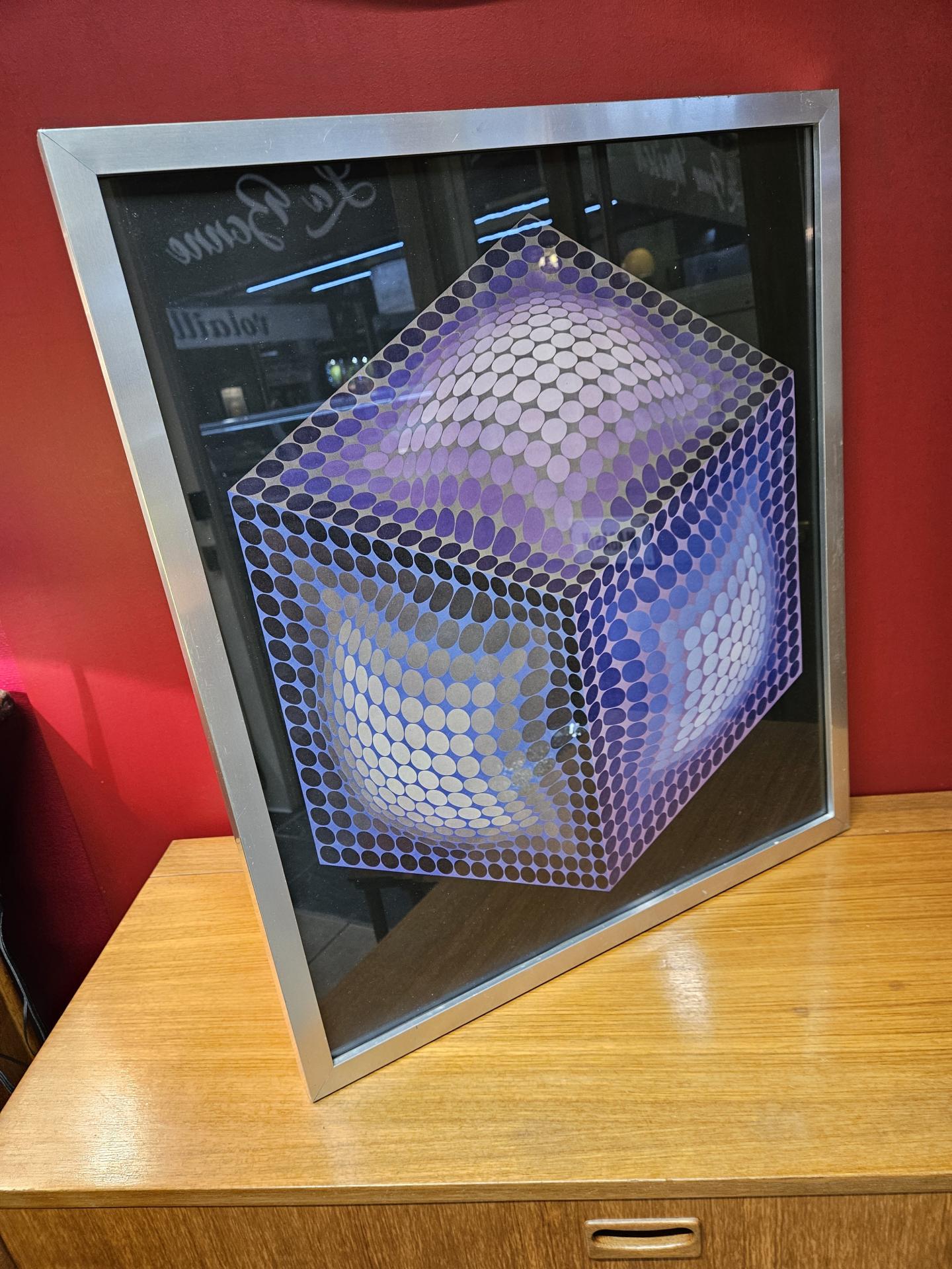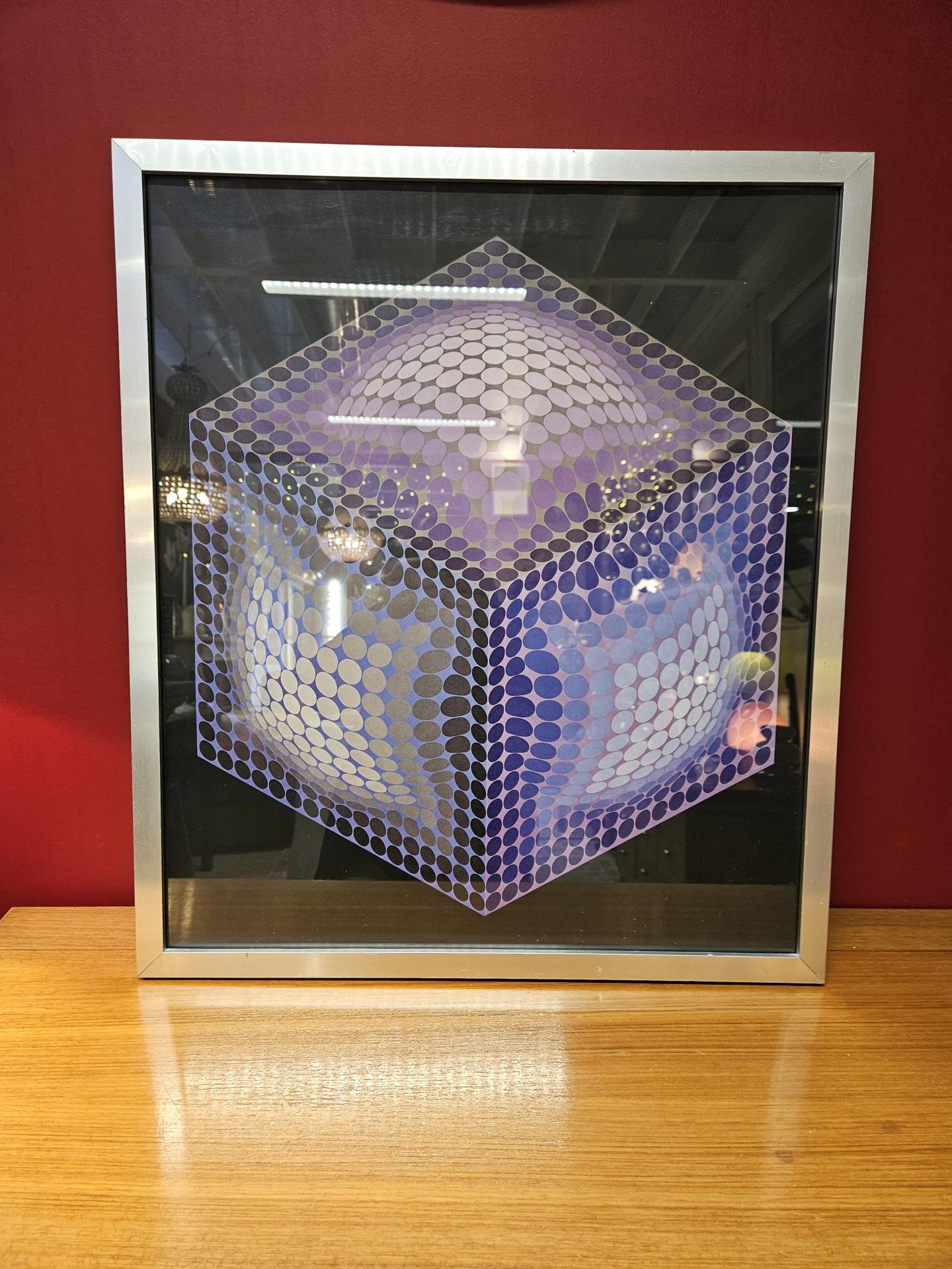 Estampe offset Xexa Domb de Victor Vasarely de sa série Brukmann de 1974. Tableau des années 70, l'affiche est sous verre et encadrée dans un cadre en aluminium brossé. Quelques marques traces d'usage sur le cadre par endroits, sans gravité. Dimensions 63.50 cm x 55 cm.